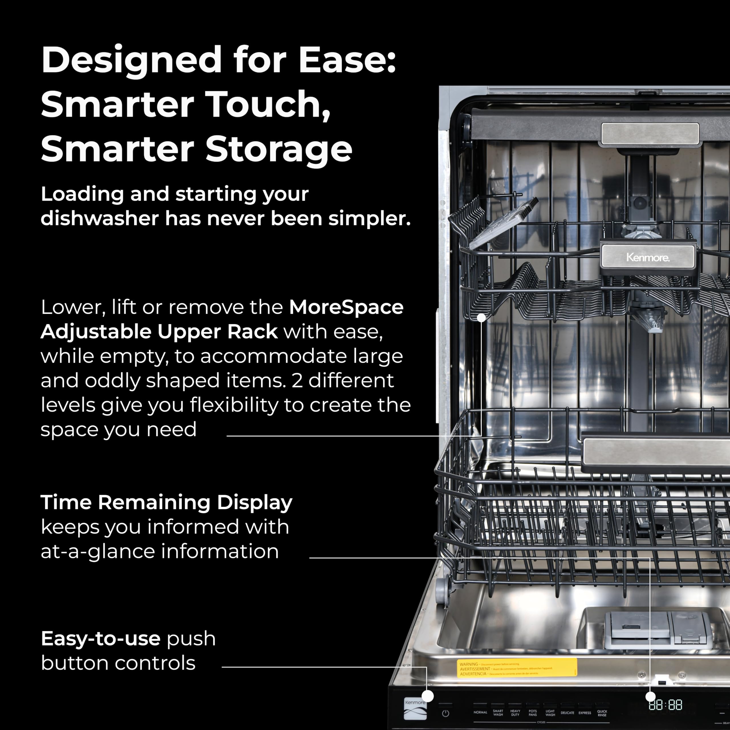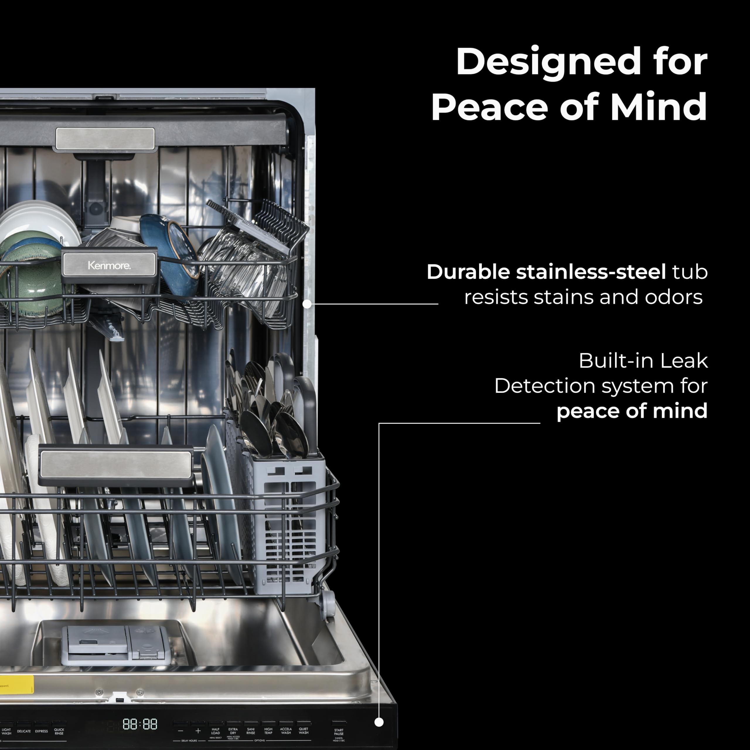 Tackle tough messes with the Kenmore 24" Built-In Dishwasher. UltraWash Plus uses 3 pressurized spray arms and filtered water for a powerful clean without pre-rinsing. The SmartWash cycle senses soil levels and adjusts settings automatically. Know it's good and clean with the UL Certified Sani Rinse Option. TurboDry combines a fan and heating element for dry, spot-free dishes. Fit up to 15 place settings with a flexible adjustable rack. Quiet Wash keeps things peaceful, while ENERGY STAR certification helps save water and energy. Built-in leak detection protects your home from water damage.