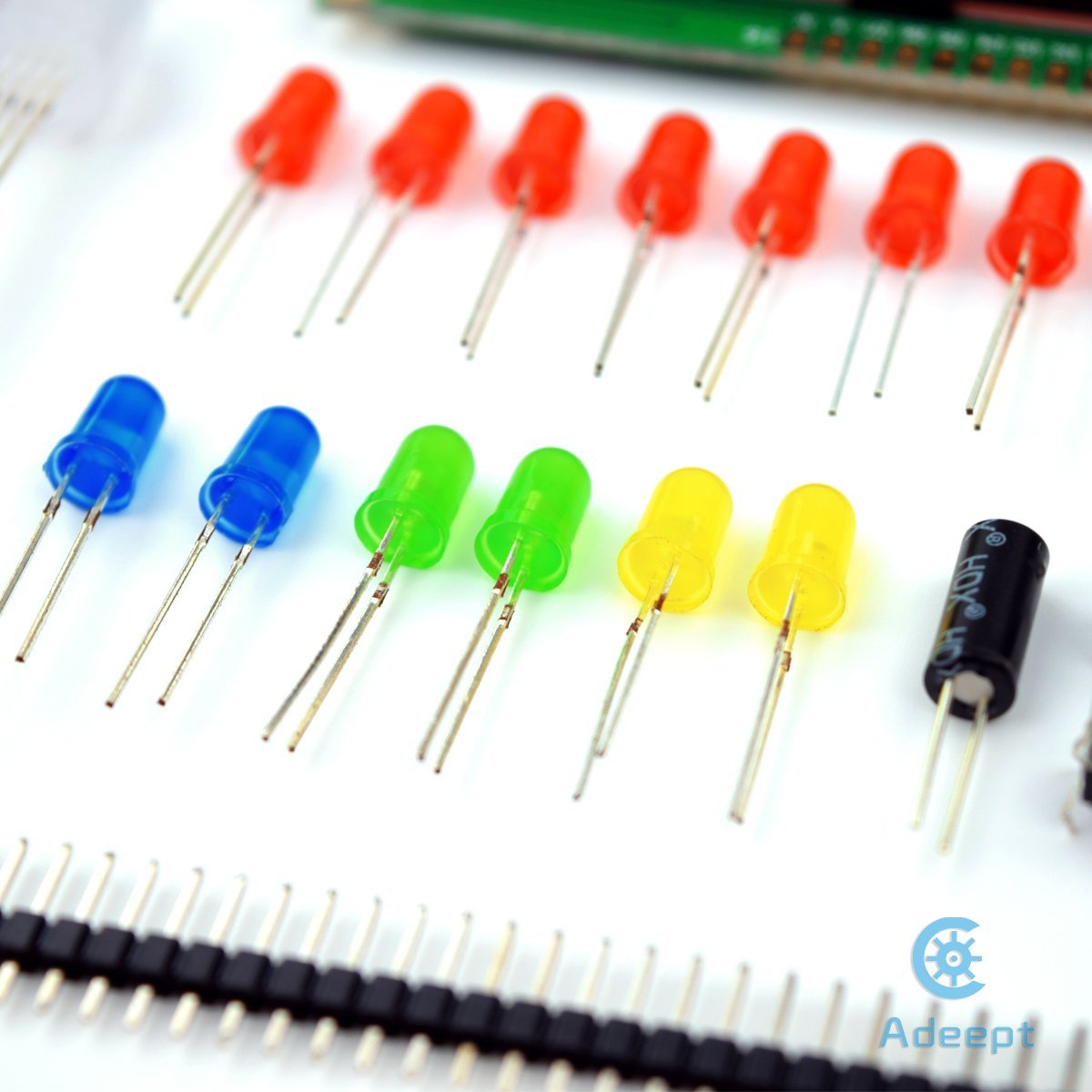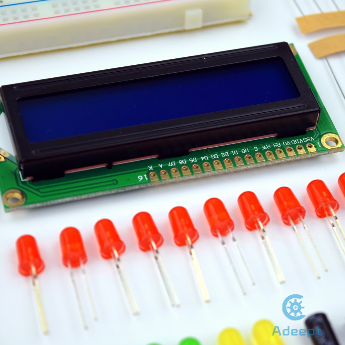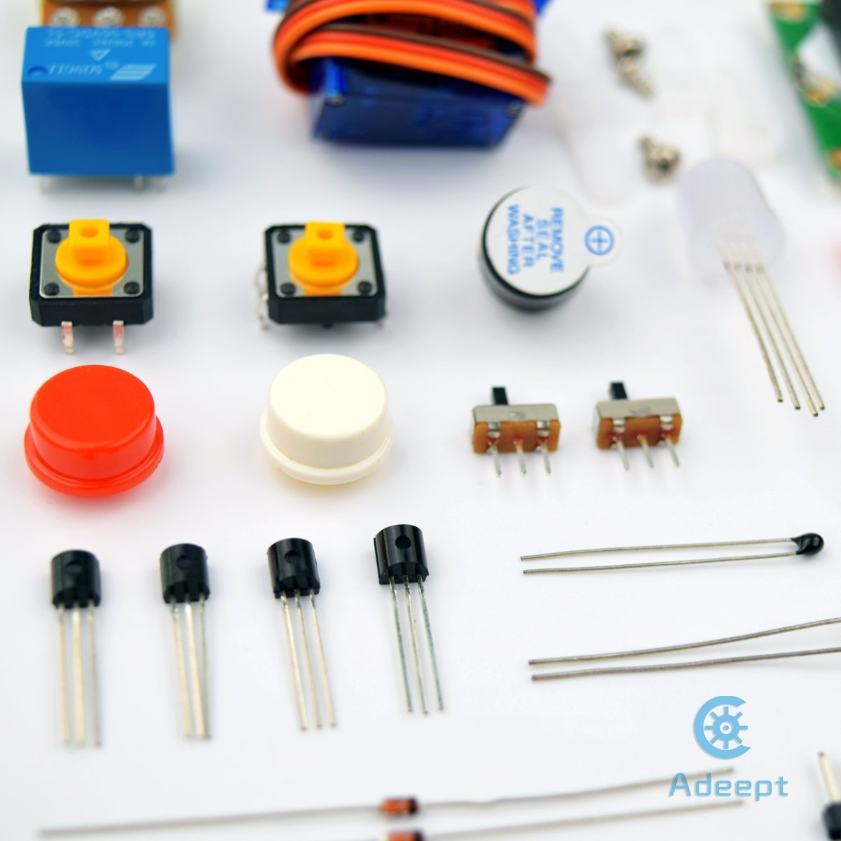 Lessons: About Arduino Lesson 1 Blinking LED Lesson 2 Controlling an LED with a button Lesson 3 Tilt Switch Lesson 4 Active Buzzer Lesson 5 Controlling Relay Lesson 6 LED Flowing Lights Lesson 7 Breathing LED Lesson 8 Controlling a RGB LED by PWM Lesson 9 Serial Port Lesson 10 Controlling Servo motor Lesson 11 LCD1602 display Lesson 12 Using a thermistor to measure the temperature Lesson 13 Photoresistor Package included: 1x LCD 1602 Module 1x Servo Motor 1x Motion Sensor(Tilt Switch) 1x Light Sensor(Photocell) 1x Temperature Sensor 1x Buzzer 1x Relay 2x Switch 2x Button(Large) 1x Button Cap(red) 1x Button Cap(white) 4x Button(small) 1x Potentiometer 1x RGB LED 2x Green LED 10x Red LED 2x Yellow LED 2x Blue LED 2x NPN Transistor 2x PNP Transistor 2x Diode(1N4148) 2x Diode(1N4001) 16x Resistor(220Ī©) 10x Resistor(1KĪ©) 5x Resistor(10KĪ© ) 5x Resistor(100KĪ©) 5x Resistor(1MĪ©) 5x Resistor(5.1MĪ©) 1x Breadboard 1x Hookup Wire Set 10x Male to Female Jumper Wires 1x Header(40pin) 1x Band Resistor Card 1x Project Box