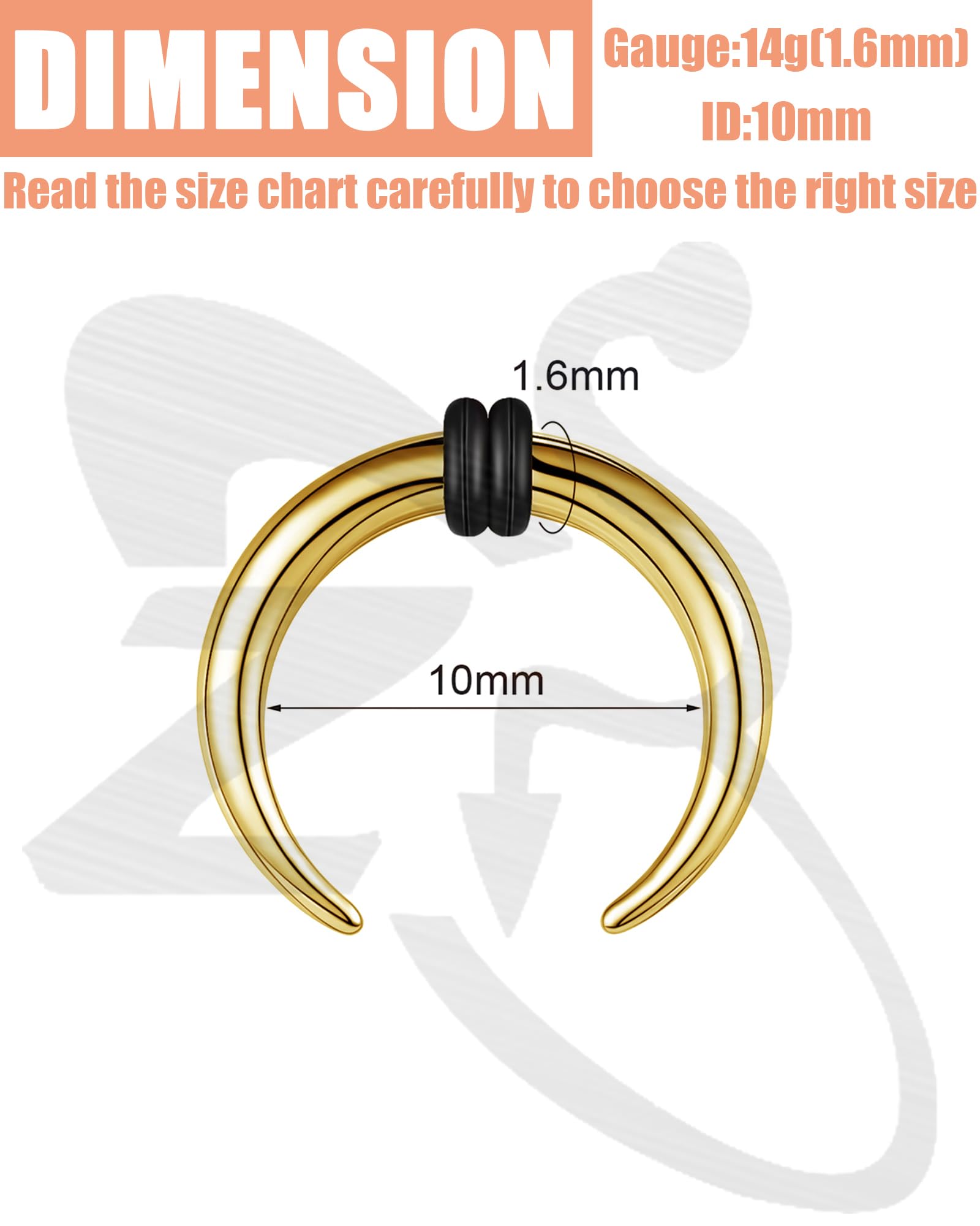 ❀Septum Pincher Size Reference——Septum piercing taper gauge: 16g(1.2mm), 14g(1.6mm), 12g(2.0mm), 10g(2.5mm), 8g(3.0mm), 6g(4.0mm), 4g(5.0mm), 2g(6.0mm), 0g(8.0mm), 00g(10mm); Inner diameter: 8mm/ 10mm/ 11mm/ 12mm/ 15mm/ 16mm/ 18mm/ 22mm/ 25mm. Select suitable size to easily expand your piercing place without too much pain.