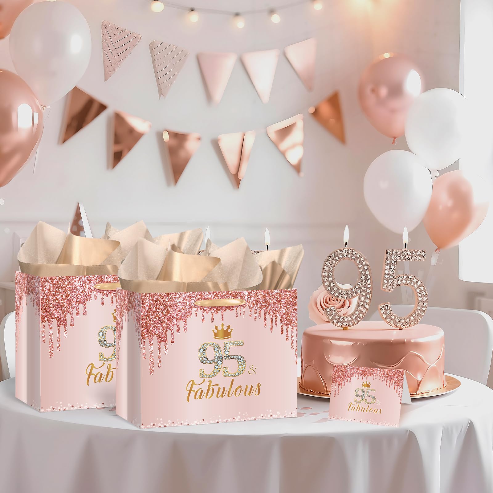 đăLarge Size and Durable MaterialăThe large pink 95th birthday gift bag for women is 11.8"x 9.4"x 5.3", which is big enough to hold most gifts of your choice. The 95th birthday greeting card is 4.7"x 7" and the rose gold 95th wrapping tissue paper is 27.5"x 20". The material of this rose gold 95th birthday wrap bag is thick paper, which is strong and durable.