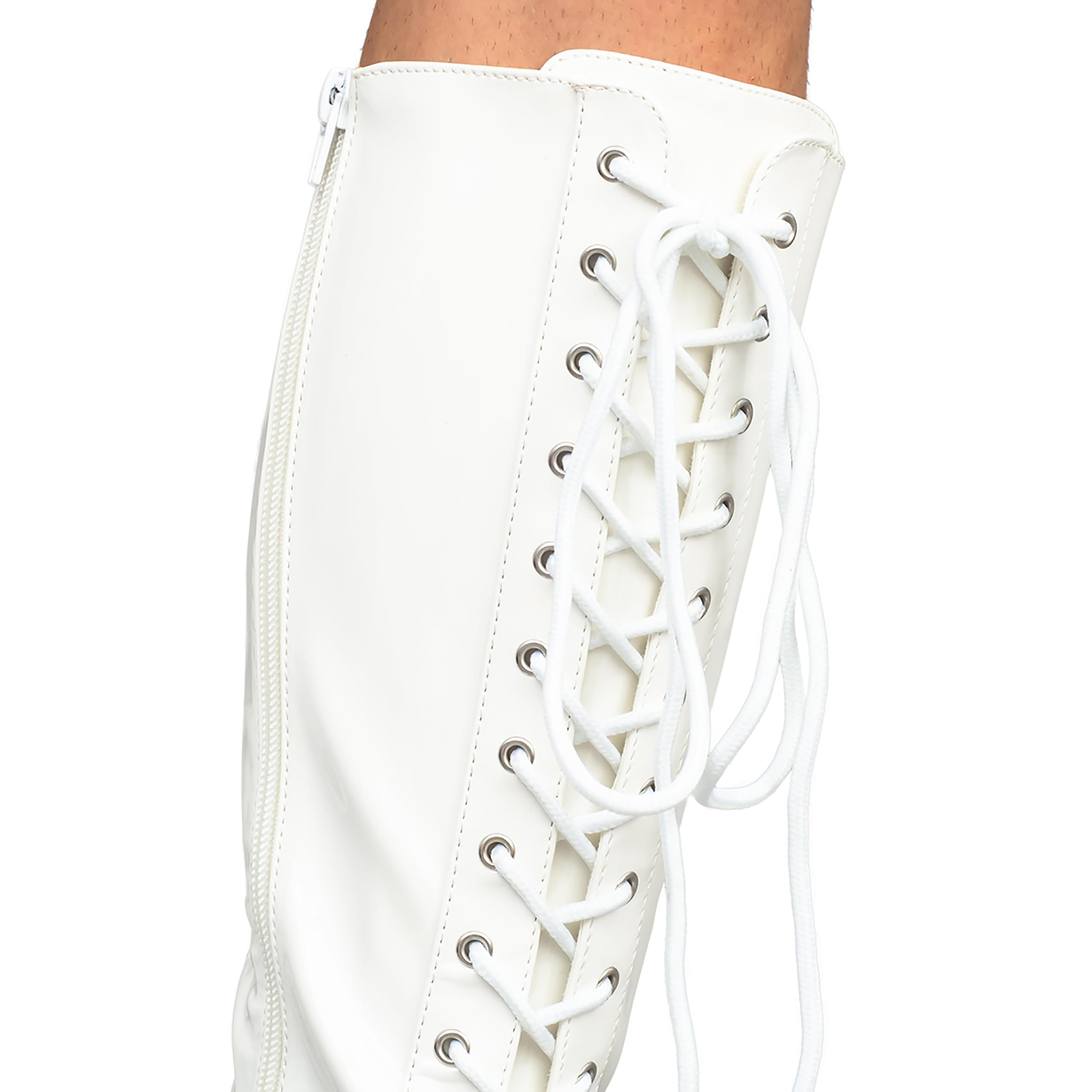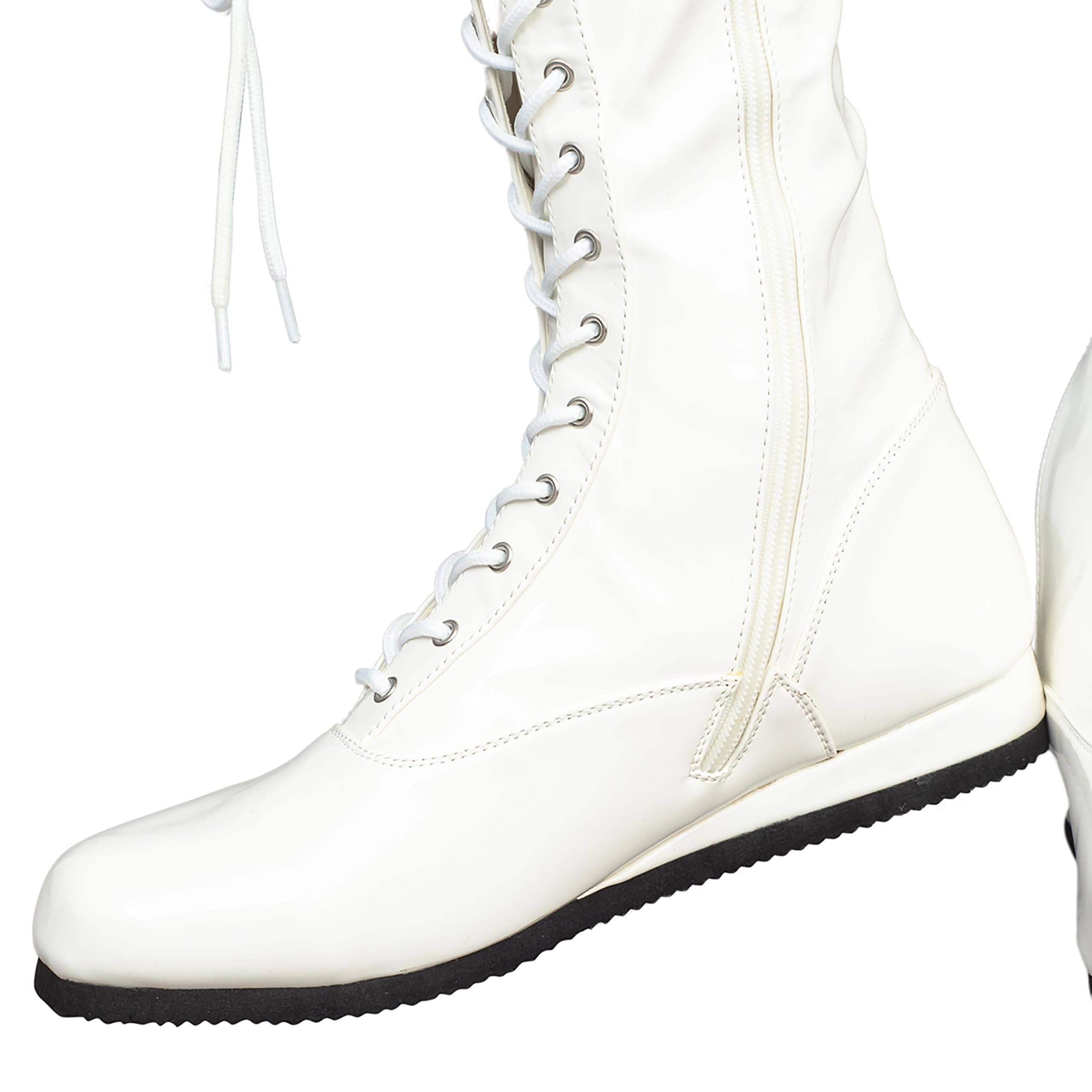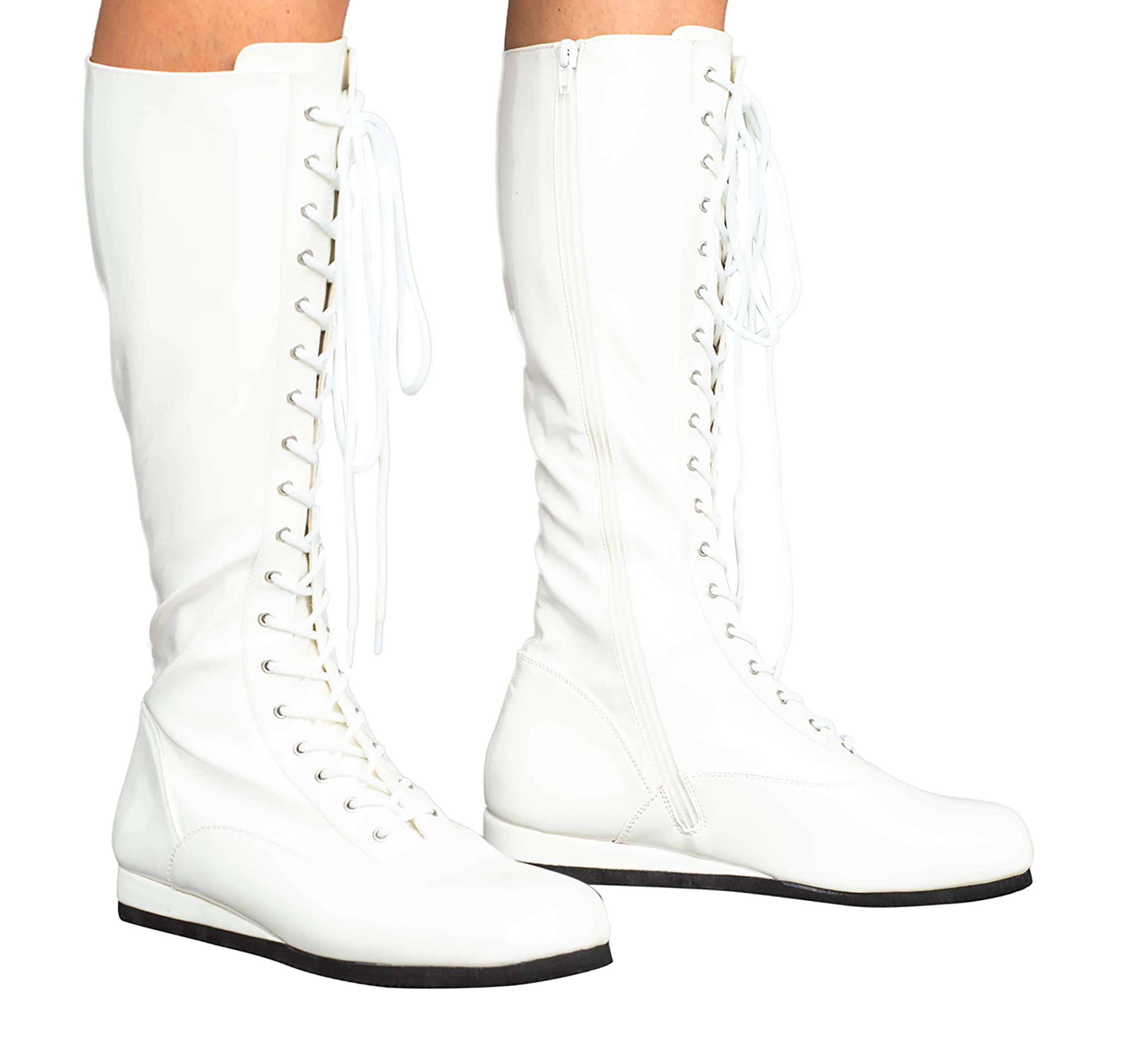 Vinyl drawstring and zipper unisex superhero and pro wrestling boots are available in sizes 8 to 14; available in black, blue, red, and white colors