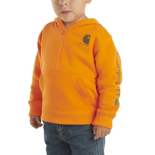 Description Keep your active kiddo warm all season long. This boys' fleece hoodie is the next best thing to wearing a blanket. Because it's Carhartt, you know it's going to be as durable as it is comfortable. A half zip makes it easy to get him into and out of it in a flash.