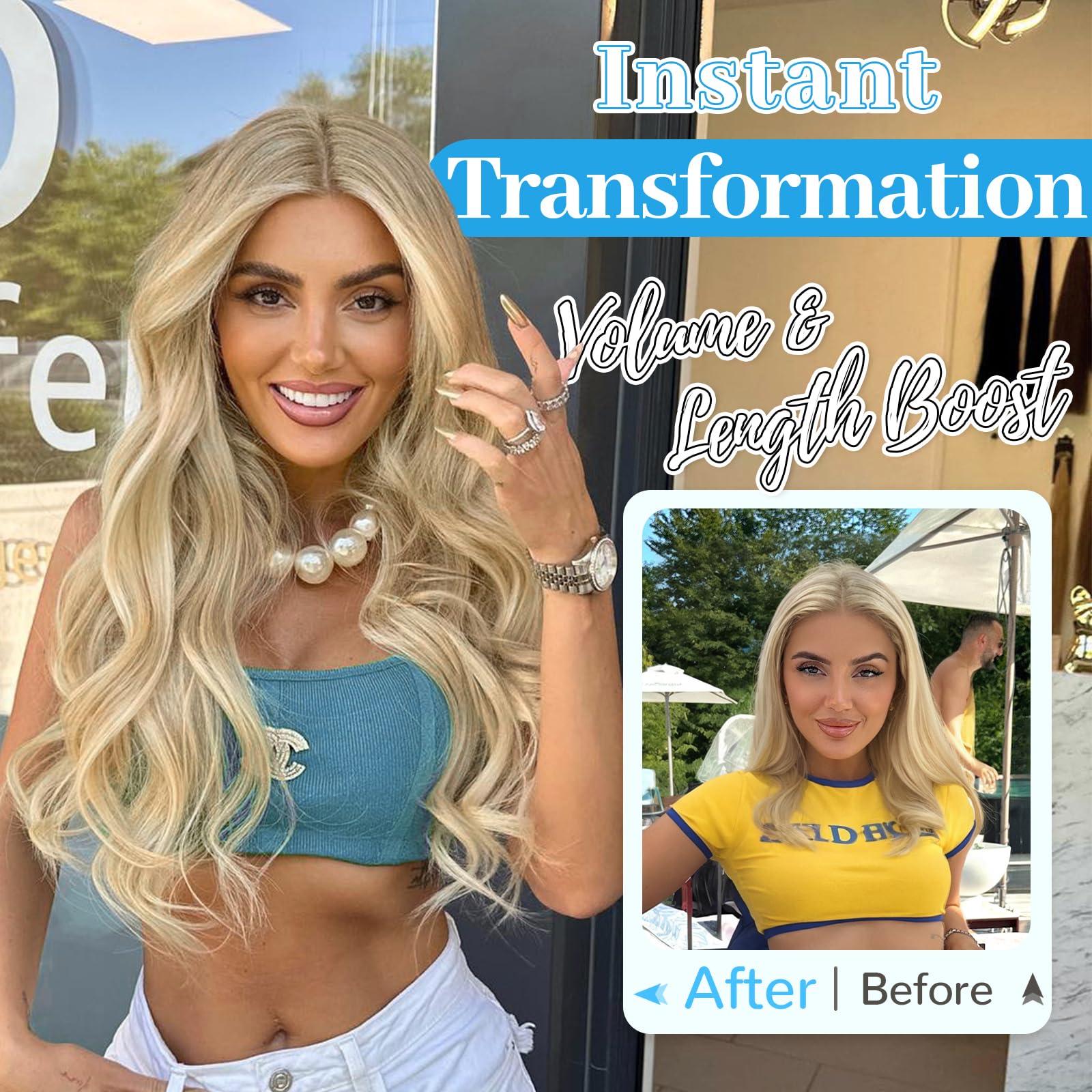 【User-centered Design】Designed for fragile hair, in addition to four Secure clips, we have added two more Secure clips to evenly distribute them.At the same time, we have widened the double weft, truly achieving full coverage of hair.Make your hair look natural and fluffy at any angle.