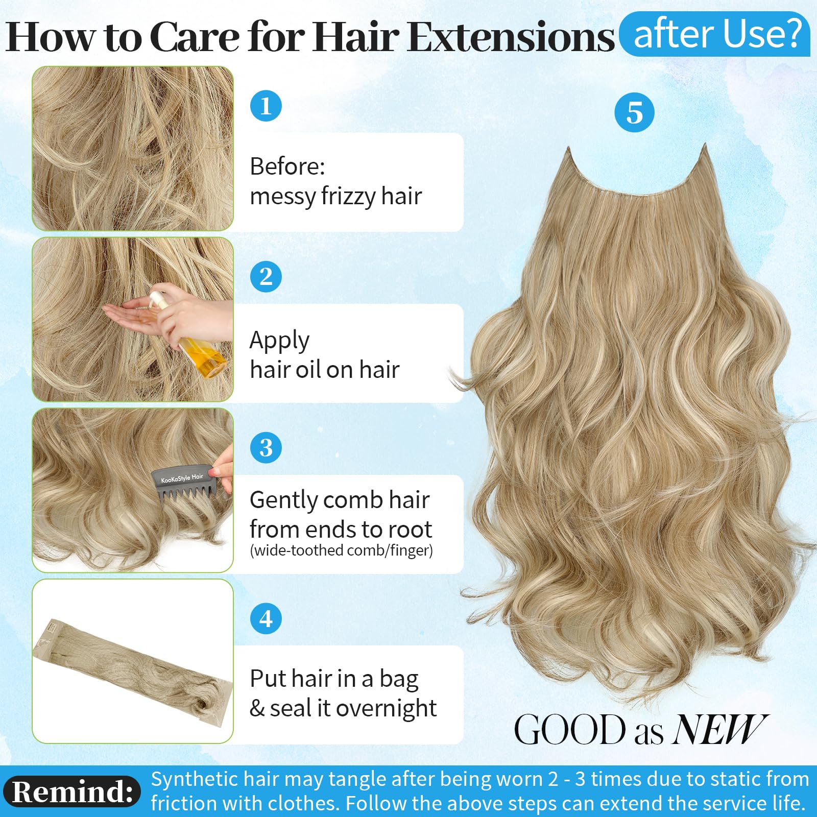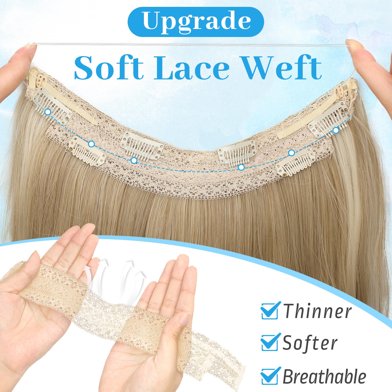 【Get Layered Hair In Seconds】 Invisible wire hair extensions is the easiest and quickest tool for adding volume and length. Anyone can do it!KooKaStyle invisible wire hair extensions with new upgrade!Thinner&softer&Breathable double weft,lighter&fluffier Synthetic heat-resisting fiber,Make it perfectly blend with our hair and create a hair salon effect at home.