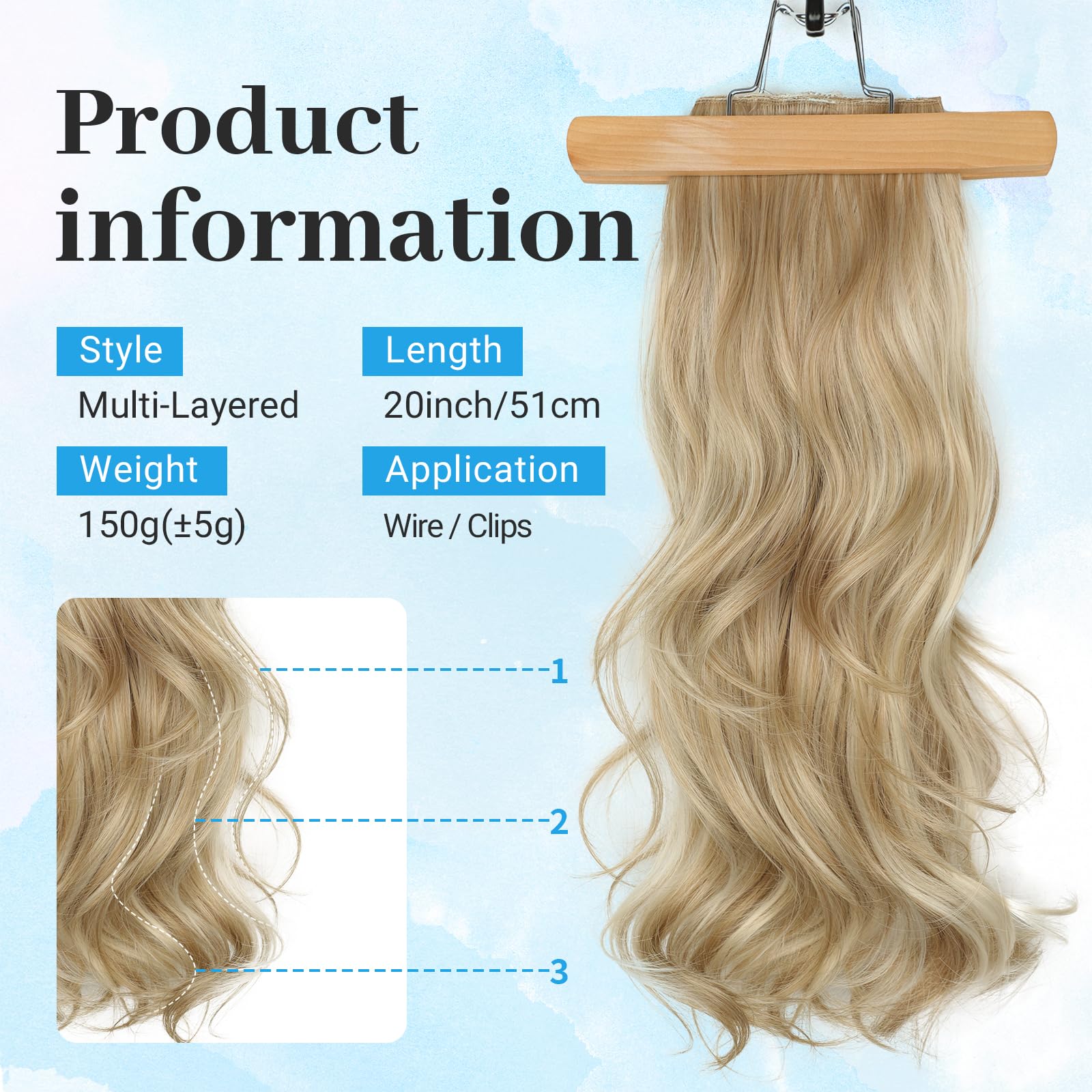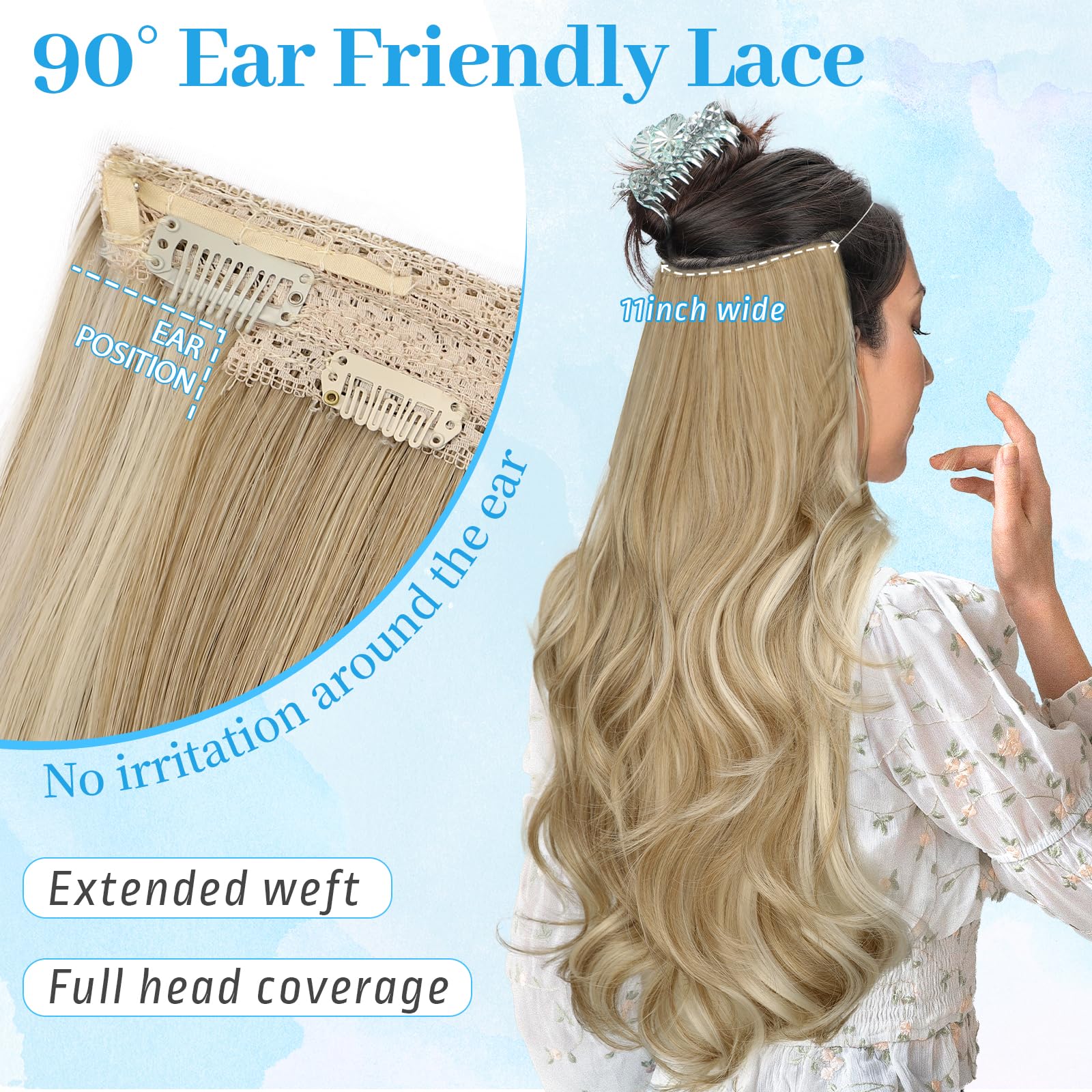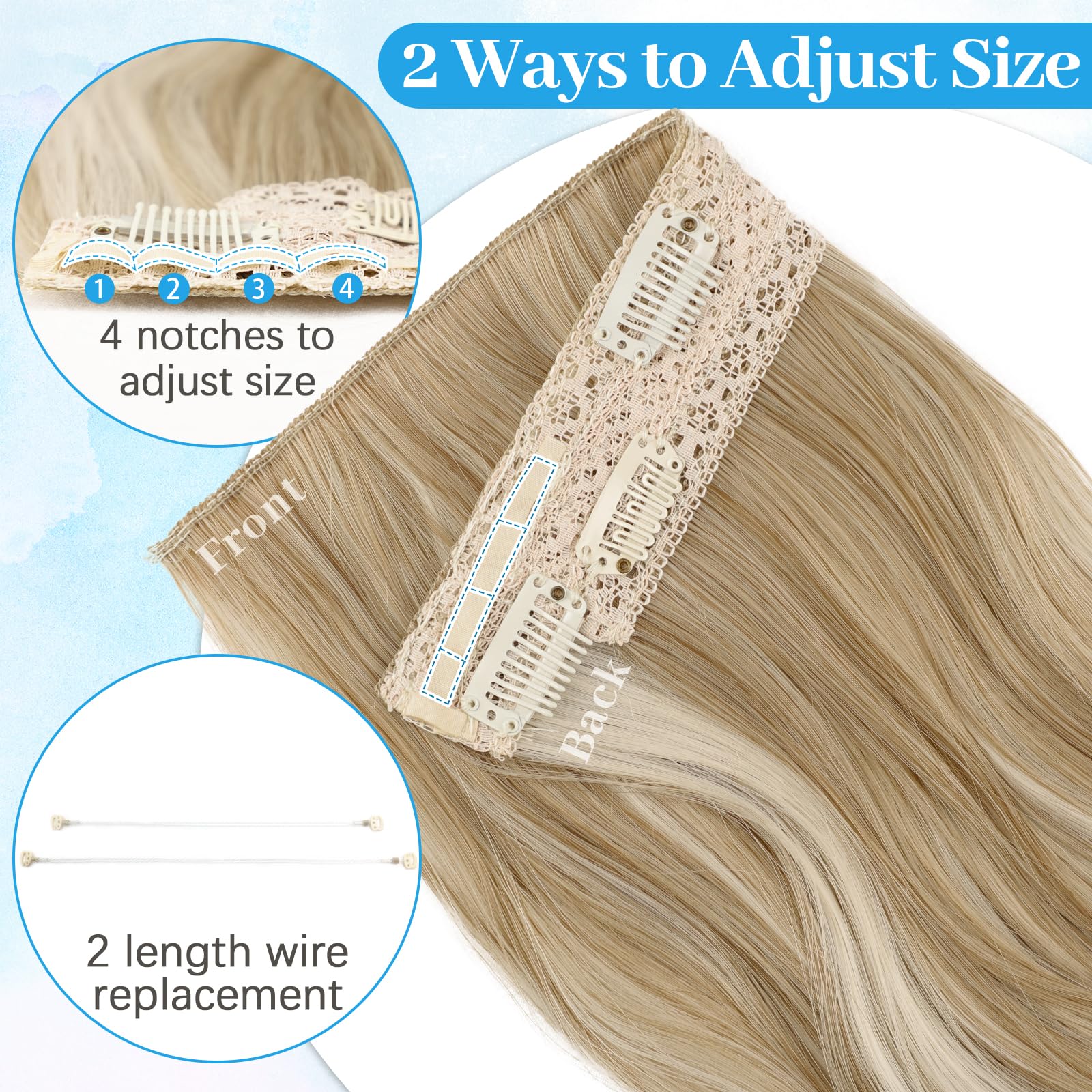 【Easy to Wear】Just 3 steps increase your hair volume quickly.Separate your hair above your ears, about 1-1.5 inches from your hairline, and leave it on top;Place the hooks in different positions to adjust the size to your head, then place the extensions with the wire in the back;Place 4 clips onto the hair for further security, then release the top of the hair;Finally, Use your own hair to hide the wire.