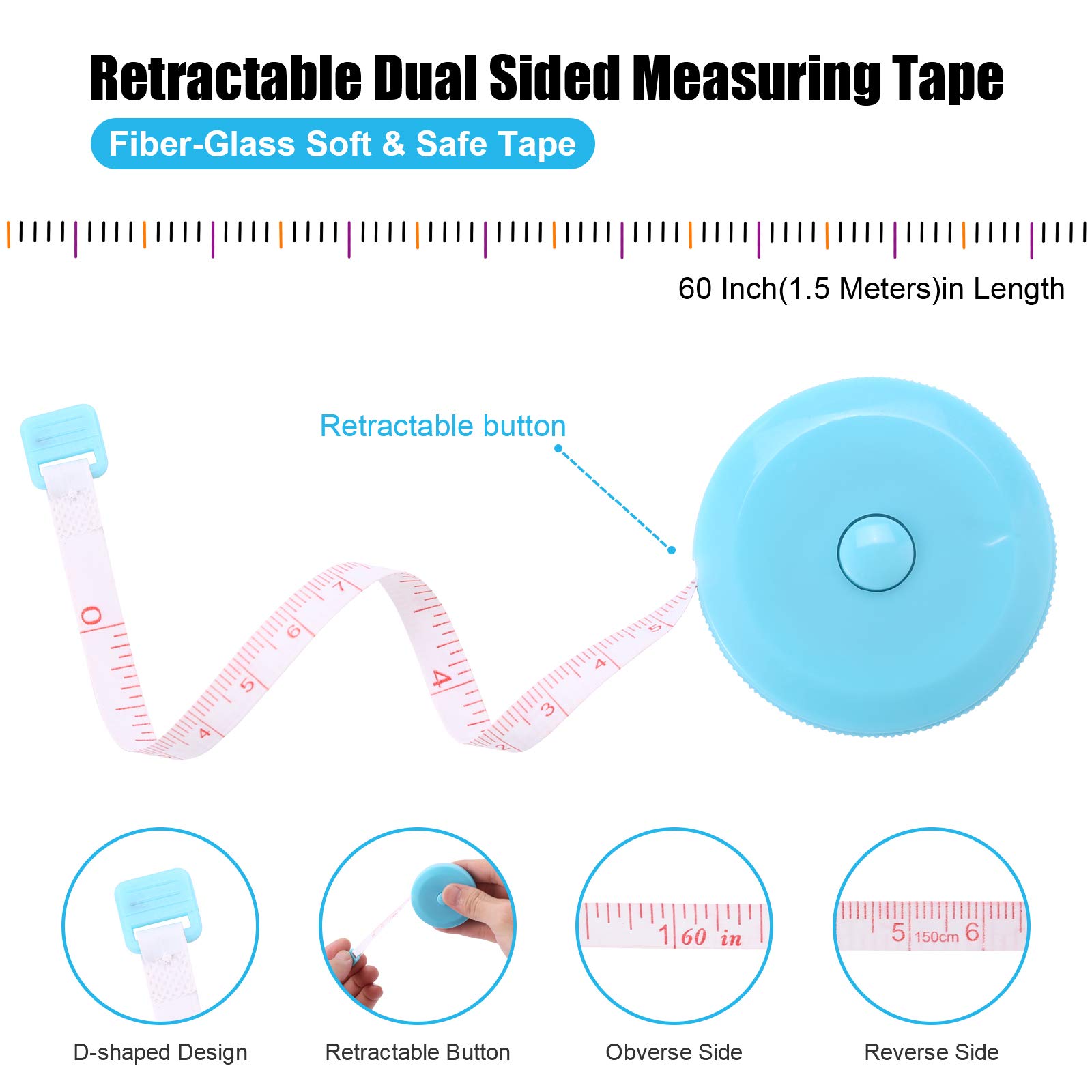 【Non-Stretch Durable Material】- The measuring tape is made of non-stretch fiberglass material, which is durable and wear resistant. With a portable handy plastic case outside, the inside flexible vinyl tape measure is 1.5M/60IN in length, which totally meet your requirements for measure stuff.