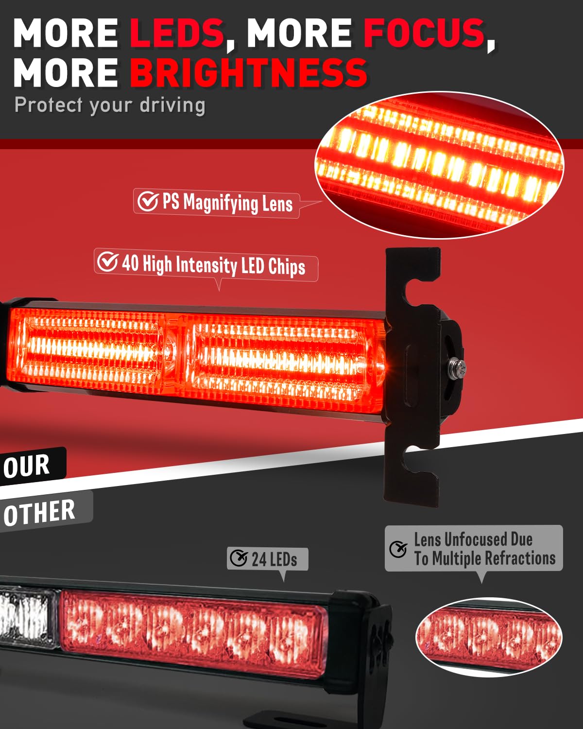 【MORE LEDS, MORE FOCUS, MORE BRIGHTNESS】: HLauto 1002L traffic advisor strobe light bar is designed with 40 high-intensity LEDs and PS magnifying lens, making it brighter than the other 24 LEDs traffic advisor strobe light bars. Ensuring your safety in any driving conditions