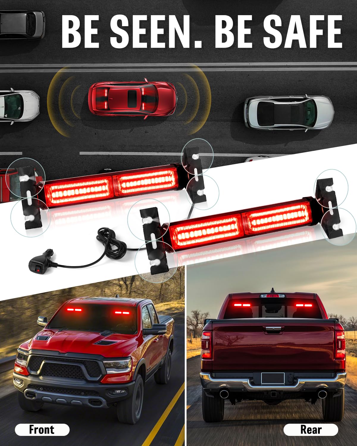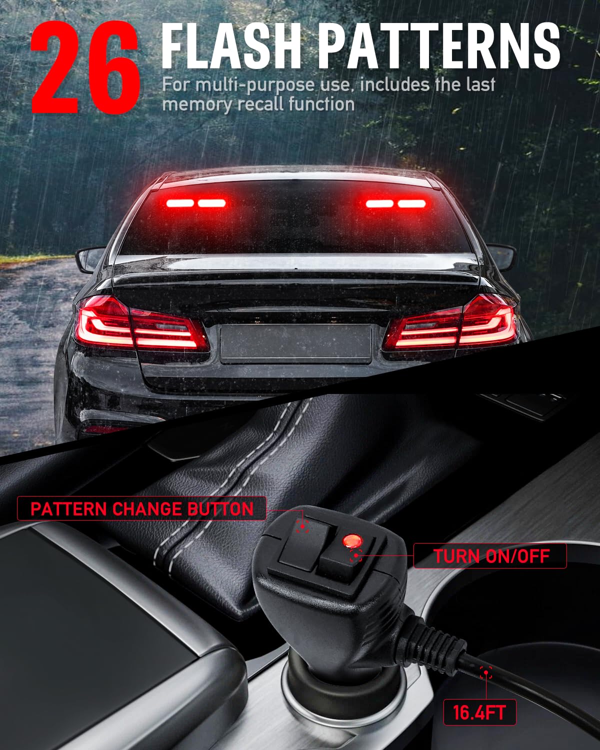 【26 FLASHING PATTERNS WITH LAST MEMORY RECALL】: Just plug in the 12V cigarette lighter, and choose the strobe mode you need. This LED strobe light bar can be widely used for Hazards Warning, EMS, Law Enforcement, First Responders, Emergency Vehicles, Construction Vehicles, Police, Tow/Work Truck, Snowplow, Postal and City Service Workers, etc