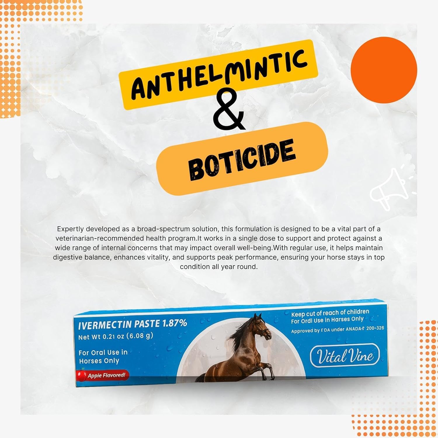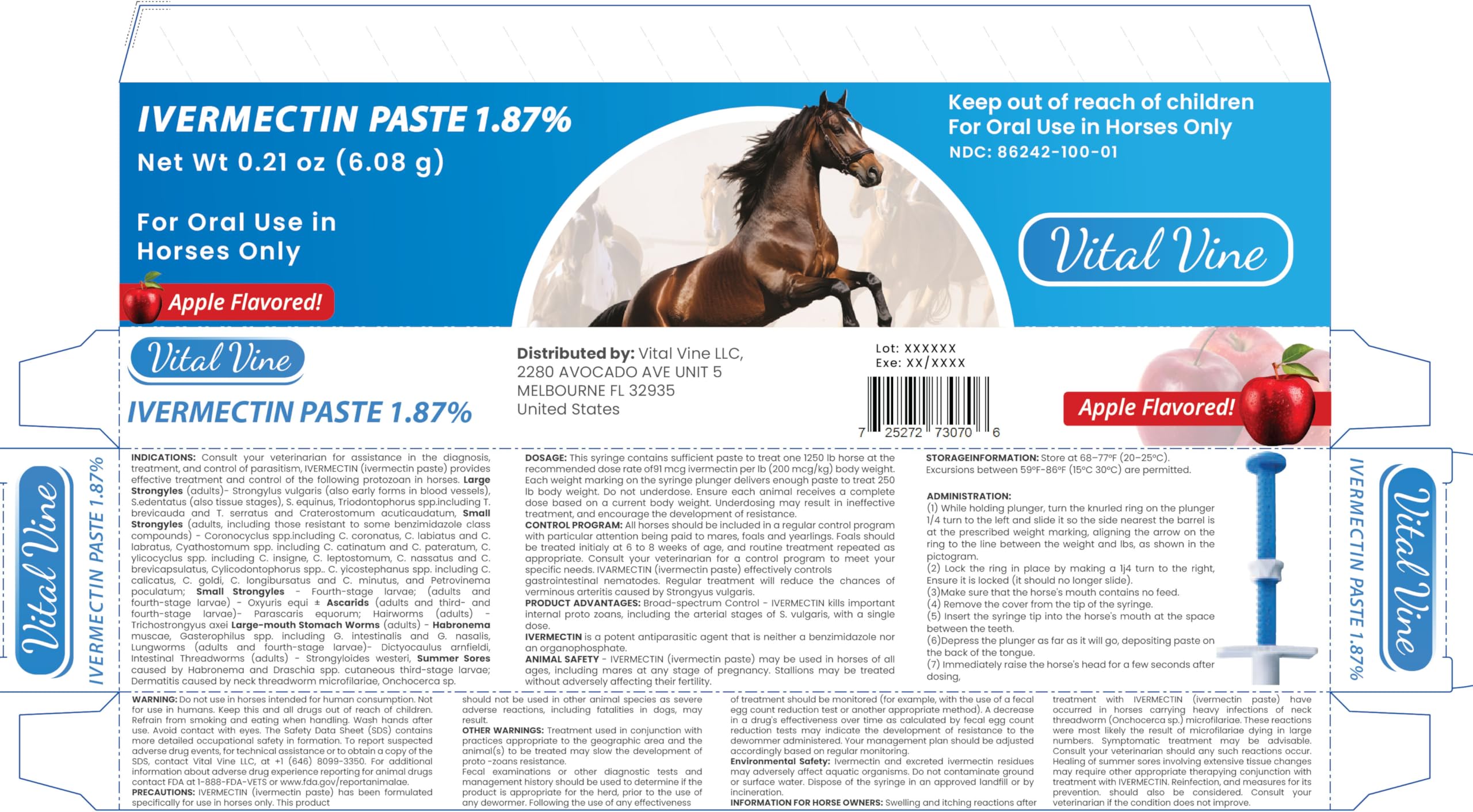 Ivermectin 1.87% Horse Paste is designed for horses weighing up to 1,250 lbs. Each 6.08 g tube contains a pre-measured amount of ivermectin 1.87% with a pleasant apple flavor. The paste allows for clear, weight-based dosing and simple oral administration as part of normal horse-care routines. NDC: 86242-100-01