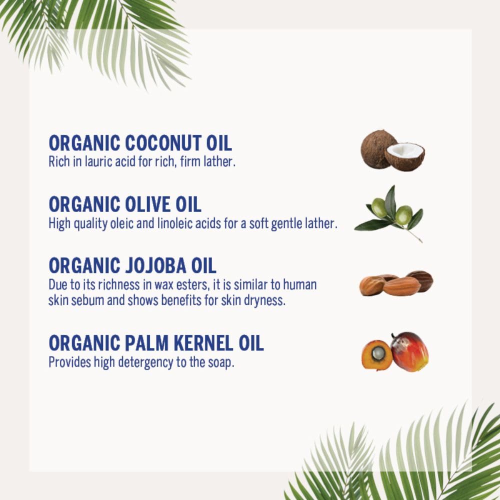 ORGANIC & FAIR TRADE PALM KERNEL OIL: Grown by fairly-paid smallholder farmers in Ecuador to ensure sustainable harvesting techniques that won't damage local habitats—providing the smooth & creamy lather of our soaps while benefiting people & planet.