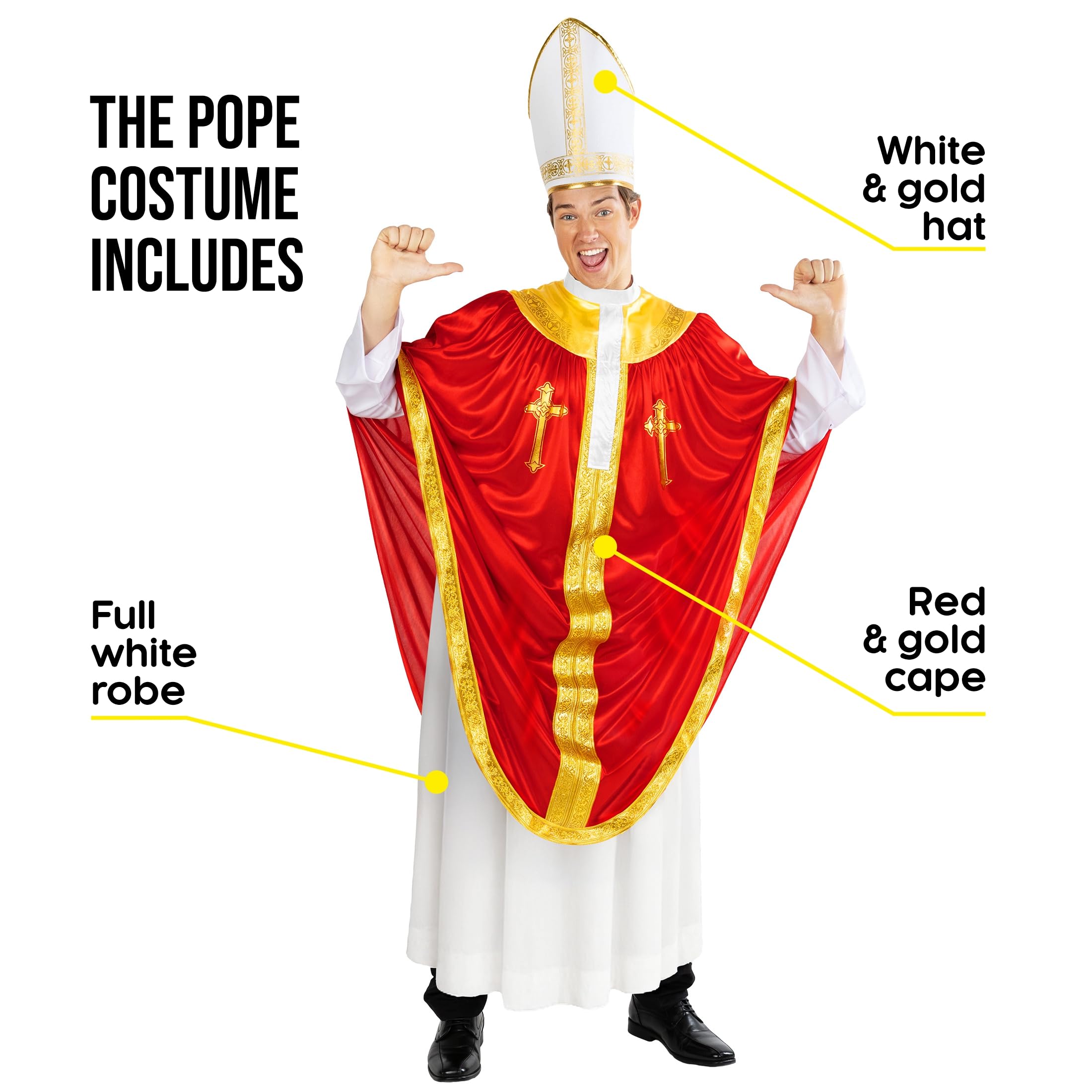 Description Step into the spotlight and bless the party with style in our Pope-Inspired Costume for Adults, the perfect combination of humor, flair, and holy fashion. Whether you're looking to get laughs at a Halloween bash, turn heads at a bachelor party, or add a theatrical touch to a themed event, this bold ensemble delivers an unforgettable presence. The set includes a white robe with striking red and gold accents, a matching ceremonial cape, and a classic tall mitre hat, transforming you instantly into a commanding religious figure. With ornate detailing and vibrant colors, this look is ideal whether you're going as the pope, a high priest, or even in need of a showstopping bishop costume. Available in two flexible adult sizes, M and L, this pope costume for adult men is crafted with stretch fabric to comfortably suit a variety of body types. Be sure to consult the size chart to find your best fit. Beyond its dramatic appearance, this priest costume is also incredibly wearable, made with lightweight, breathable fabric to keep you comfortable whether you're leading a procession or the conga line. Thereโs even room to layer underneath if you're celebrating in cooler weatherโperfect for Halloween nights or outdoor festivals. This is not just a costumeโitโs a holy head-turner. Whether you're looking for a priest costume for adult men, a men's pope costume, or simply an unforgettable pope Halloween costume, this outfit delivers. From the flowing robe to the golden accents, it channels everything you need for a convincing and comedic take on a priest or pope character. Pair it with optional pope costume accessories like a staff or rosary to complete the look. Great for mens priest Halloween costume ideas, themed events, photoshoots, or church skits, this costume promises laughs, gasps, and divine fun. Say amen to the ultimate party entranceโyour mens pope costume miracle is here!