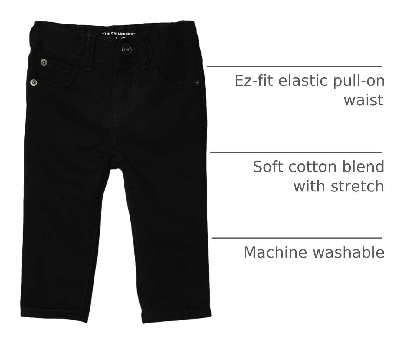 CLOSURE: EZ-Fit features snap closure, no-zip fly, elasticized back waist, inner adjustable tabs