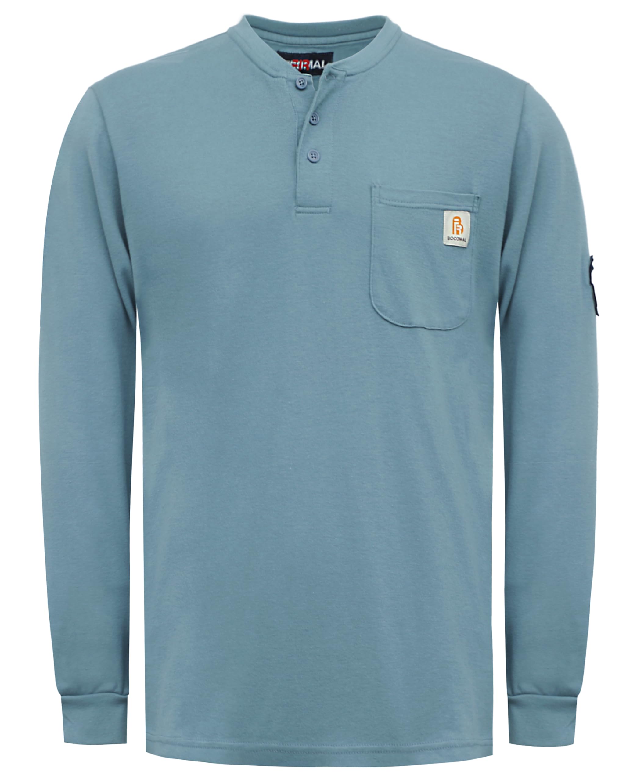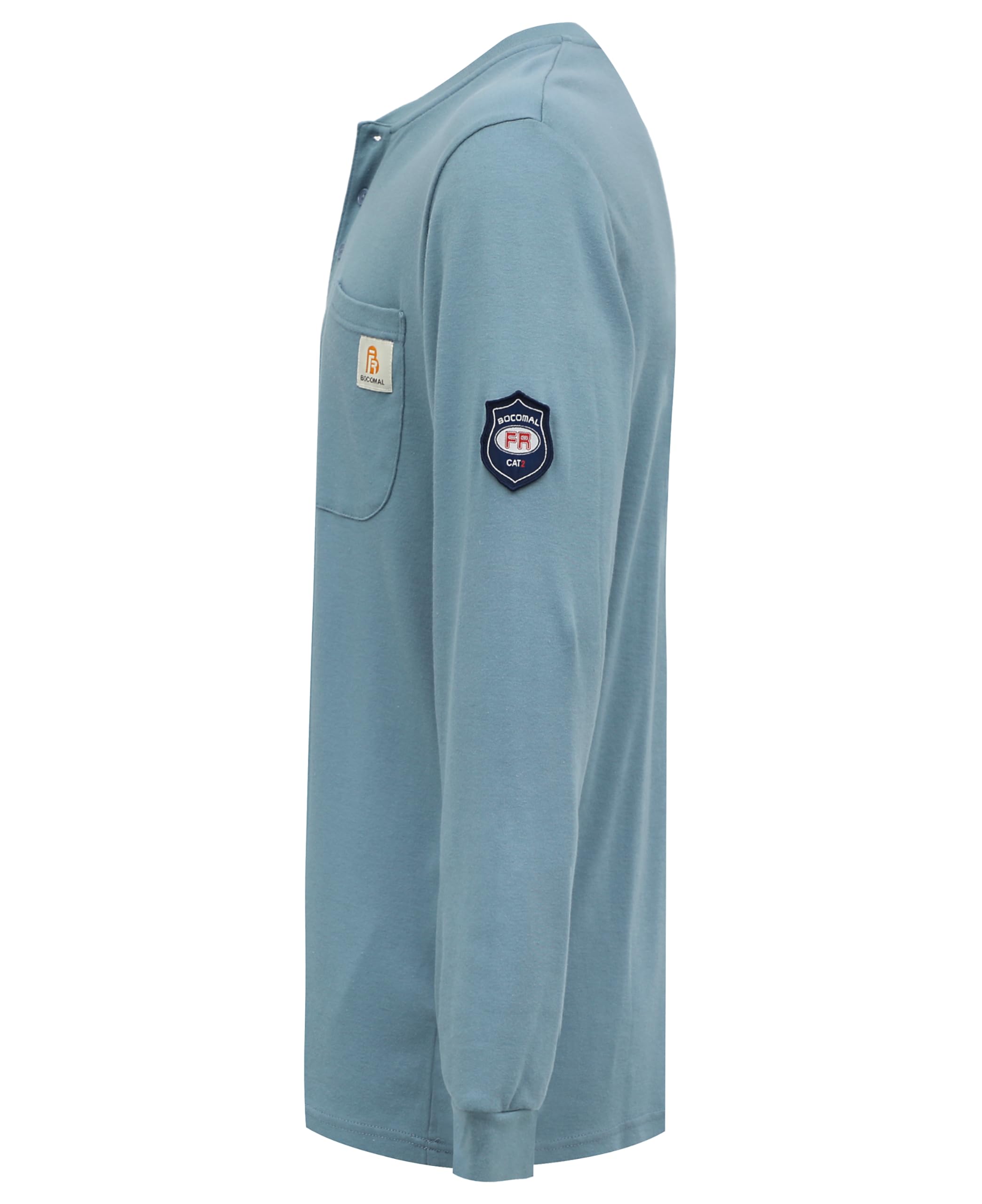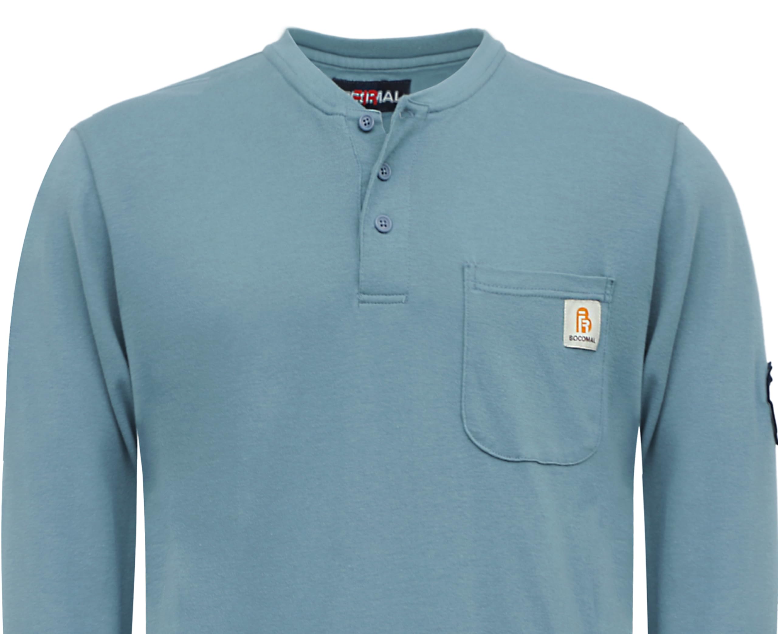 FR MATRIALS:5.5OZ Cotton Knit FR Treated,FR Buttons,FR Sewing Threads!Clear FR Tag on arms and bottom front.More FR info On Neck Tag About UL Certification.We Attached A Small Sample Inside Package For Cunstomers Simple FR Try