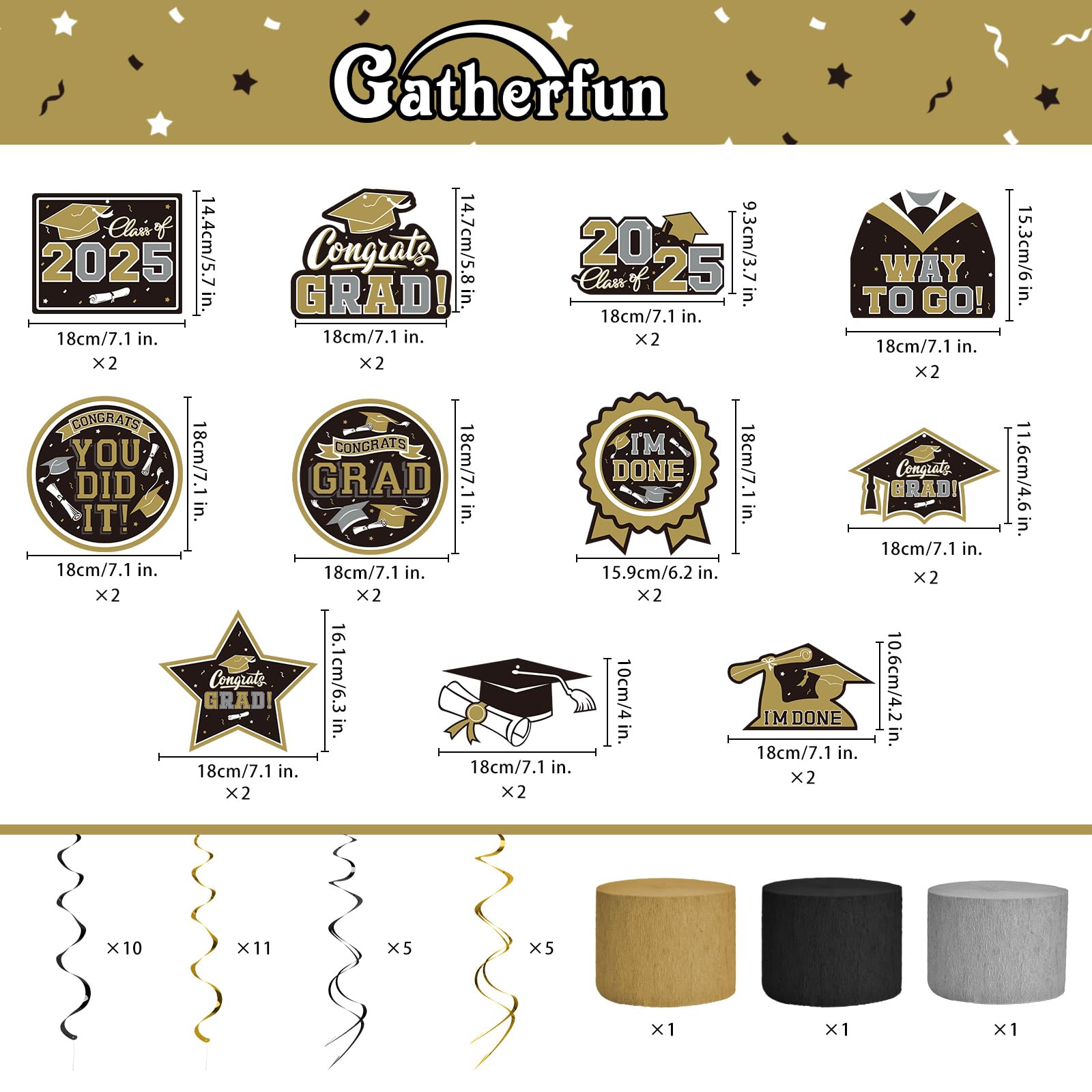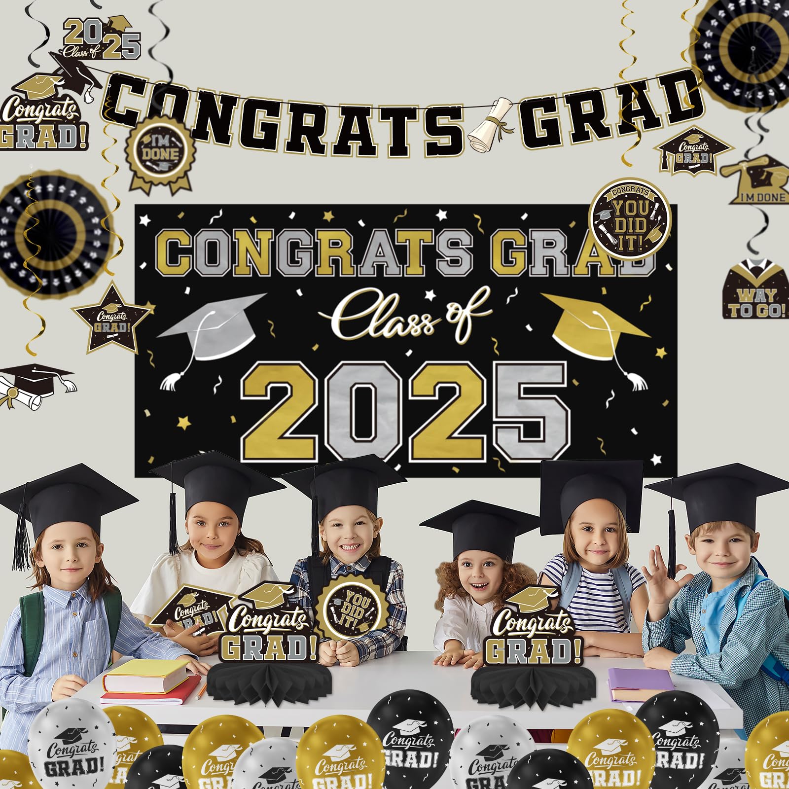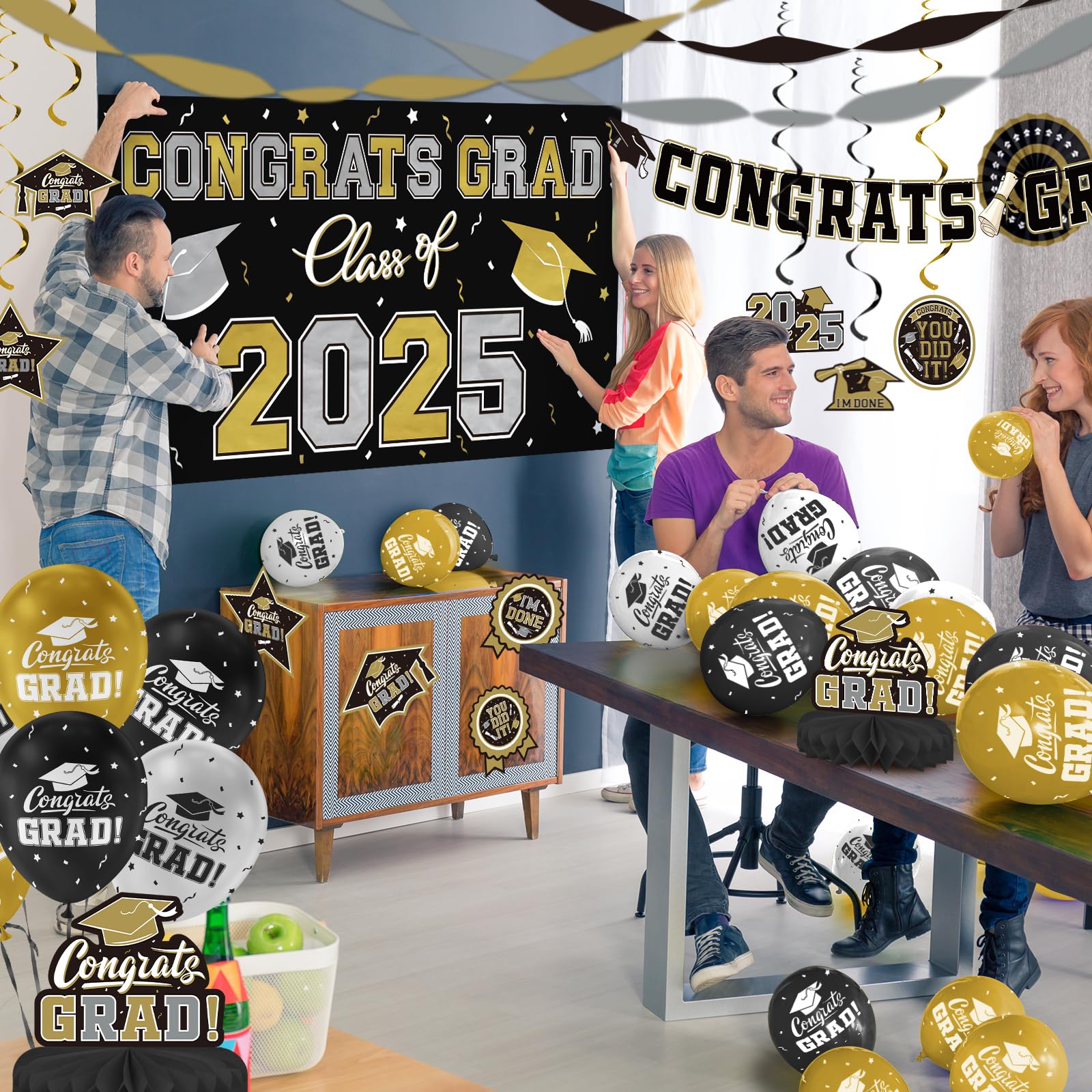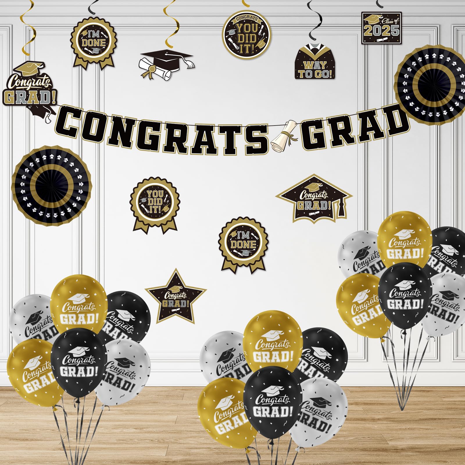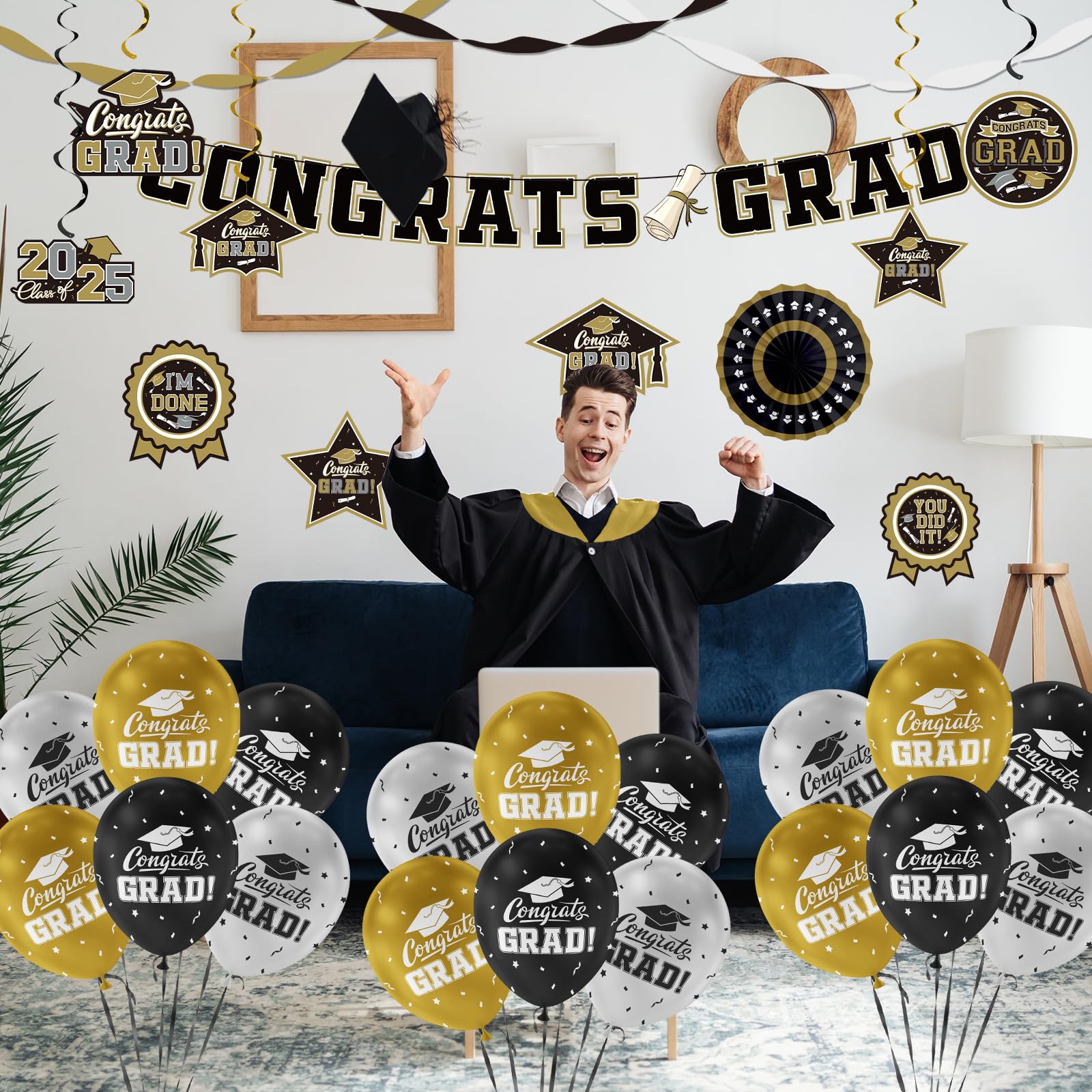 Graduate in Glamour: Our 2025 graduation decorations set the stage for a celebration to remember. With an array of Black and Gold "Congrats Grad" latex balloons and shimmering Gold ,silver and black streamers, you'll have everything you need to create a stylish atmosphere that reflects the stellar achievement of the Class of 2025 . Whether it's matching school colors or personal preference, the versatility of our decoration kit makes it a must-have for any graduation party supply list.