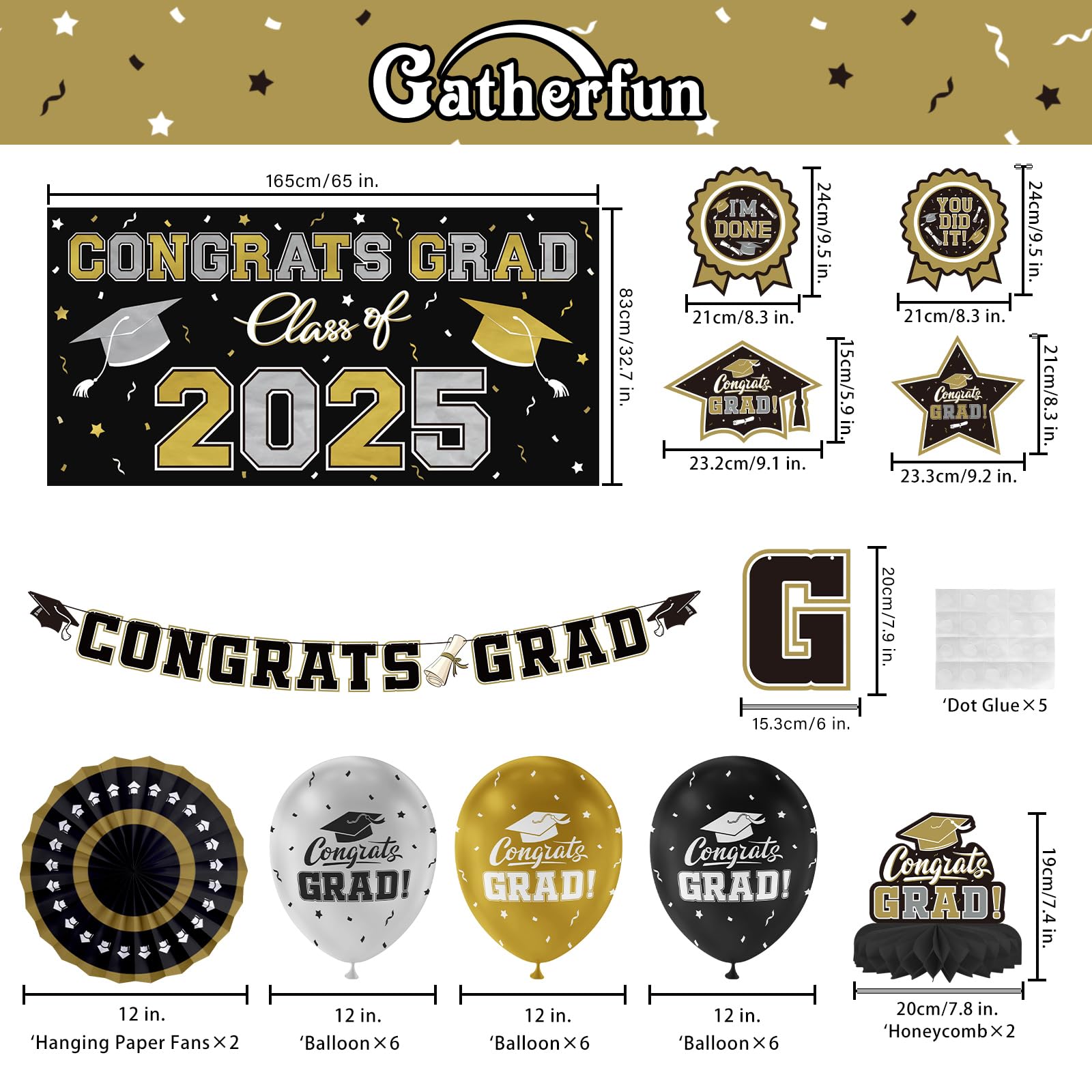 Banner of Brilliance: Declare your pride with our “Congrats Grad 2025 ” banner, an eye-catching piece among graduation party supplies. Spanning over 5 feet, this spectacular Black and Gold banner is embellished with celebratory motifs honoring the achievements of the Class of 2025 . From the pomp of graduation caps to the sparkle of confetti, this backdrop is the centerpiece for an unforgettable graduation celebration.
