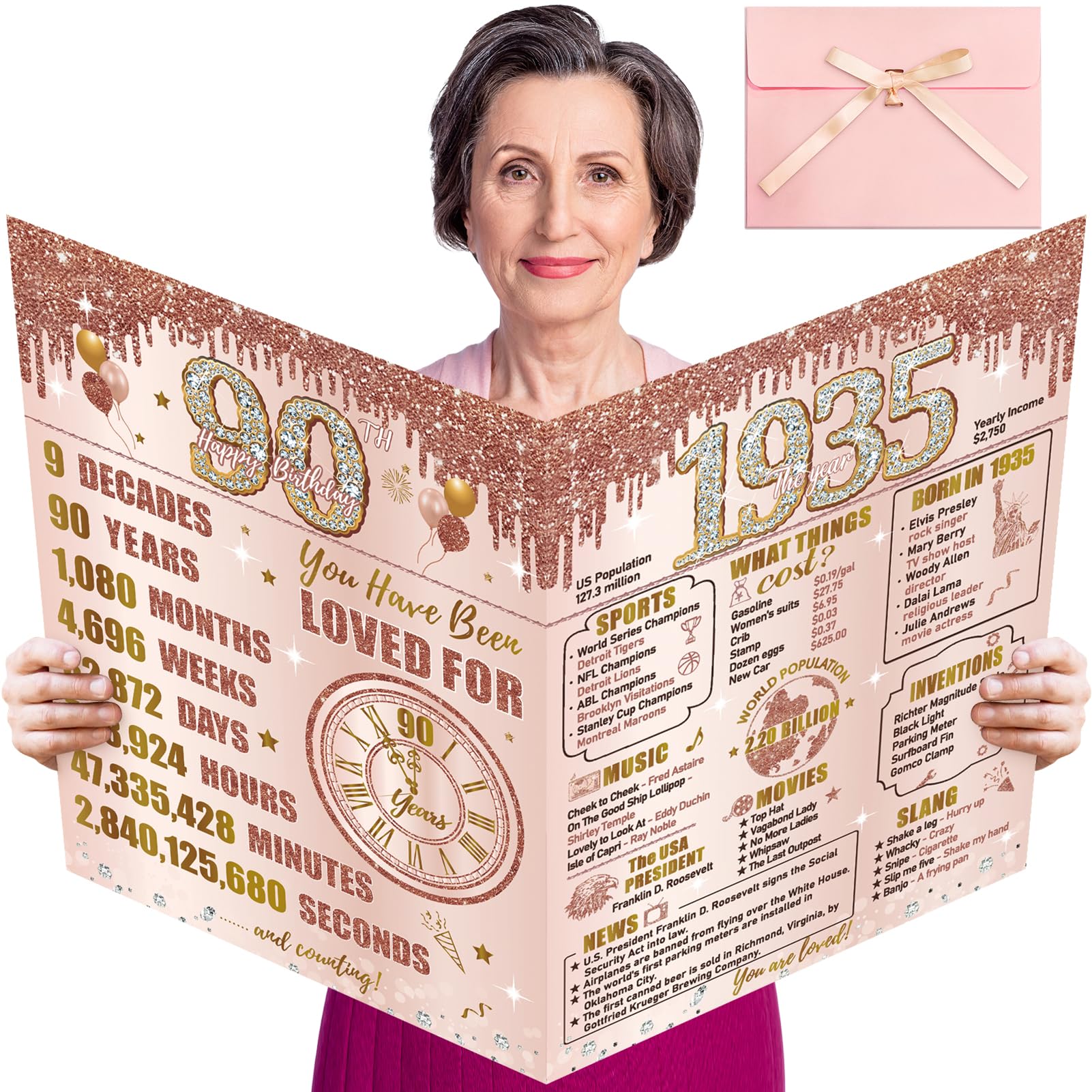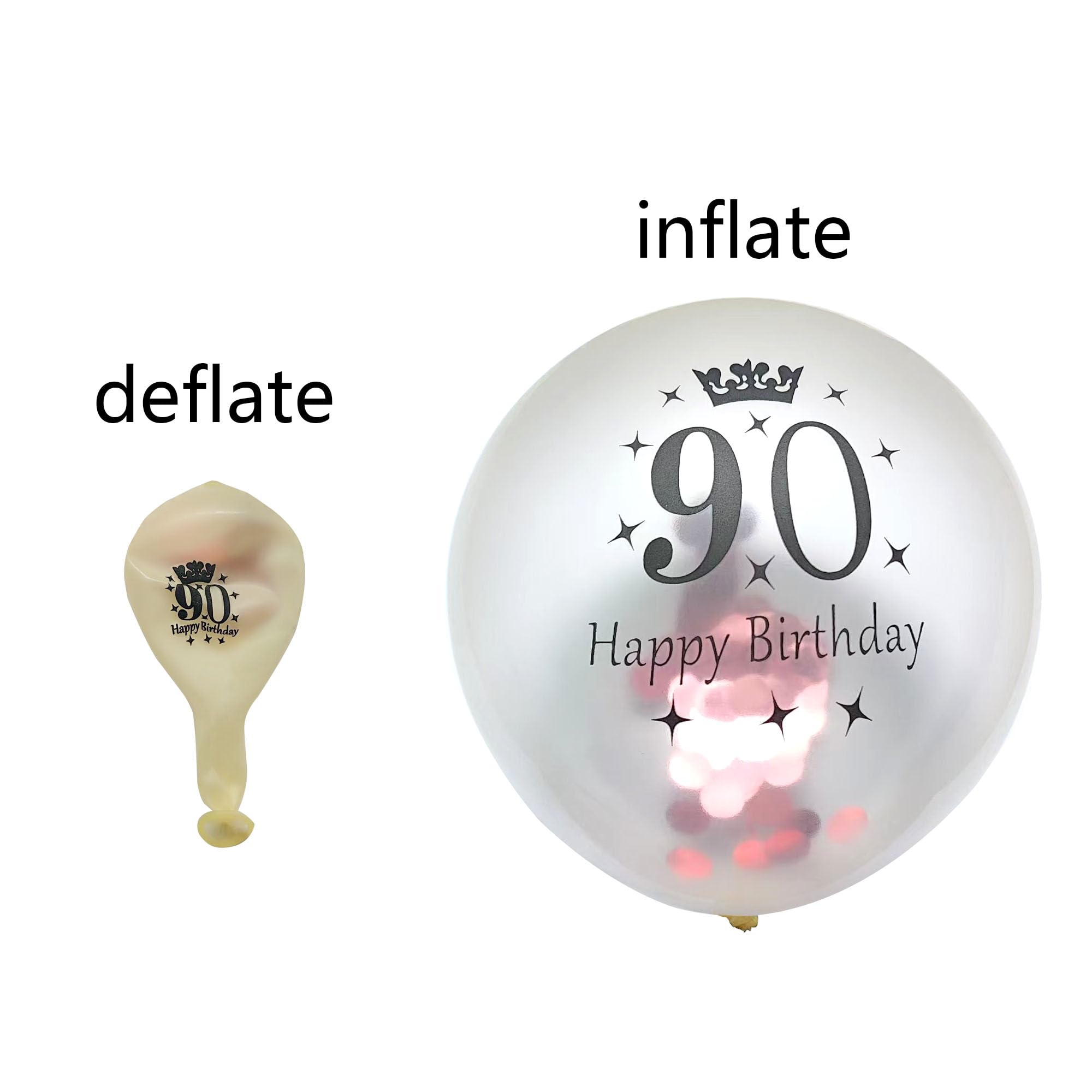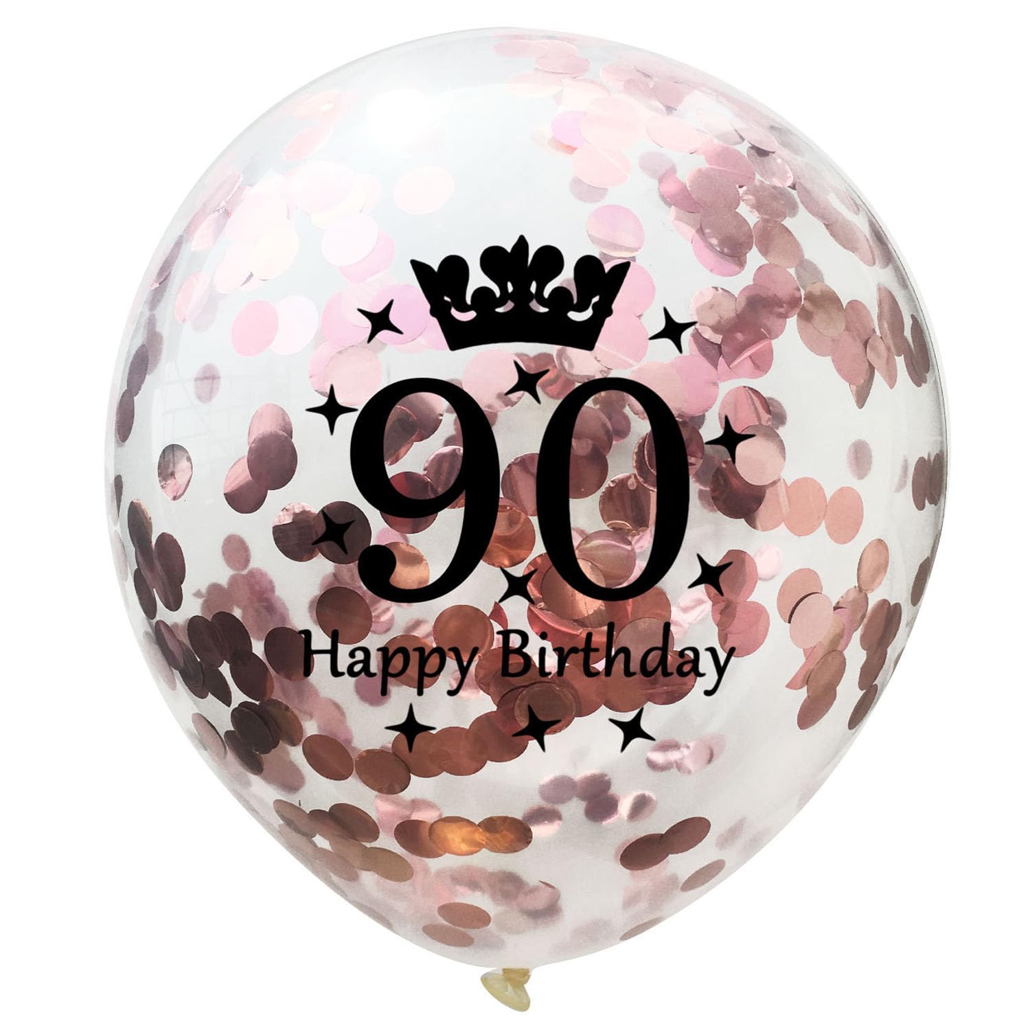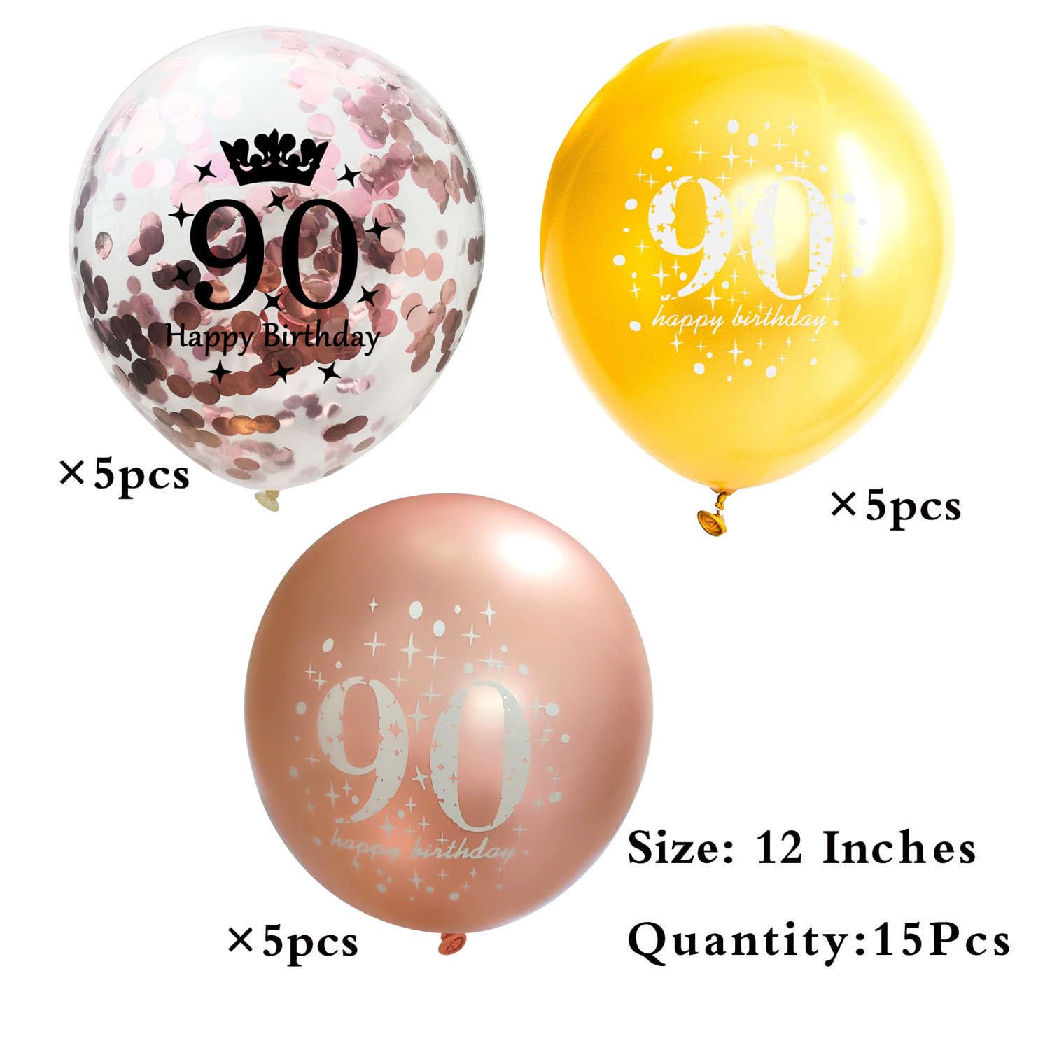 Package:5 pieces 12 inch rose gold latex balloon printed with the words "90 Happy Birthday",5 pieces 12 inch gold latex balloon printed with the words"90 Happy Birthday",5 piece 12 inch rose gold confetti balloons printed with the words"90 Happy Birthday",very suitable for women 90th birthday party decorations