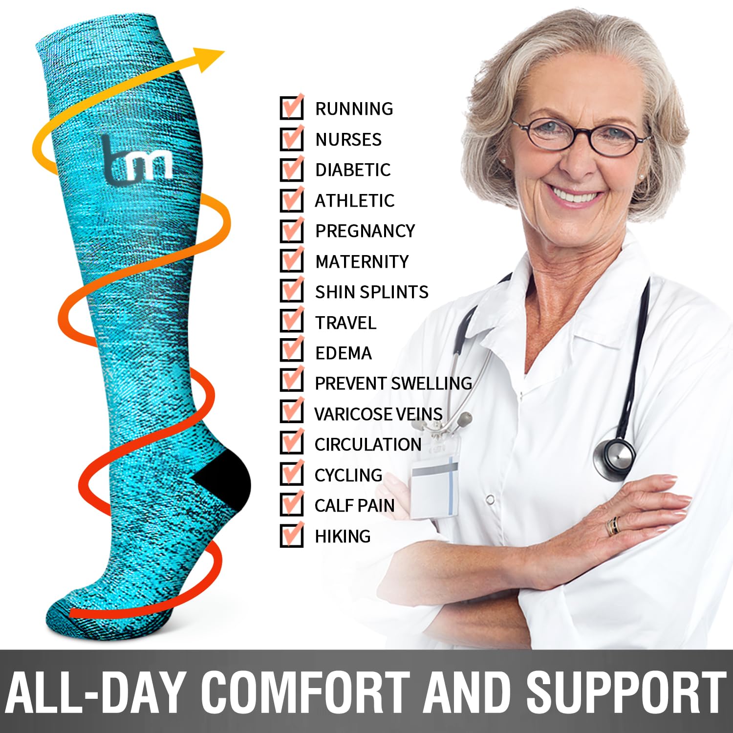GIVE LIFE TO YOUR LEGS! - More improve circulation means more Healthier legs and less pain+swelling.Our Graduated Compression Socks put pressure in just the right spots.Provides true graduated compression to support your legs,reduce fatigue,soreness,and prevent injuries at the same time.Progressive compression technology has been recognized by many users Our copper compression socks is self-care staples.Make you feel great-no matter where,no matter when,and no matter what you're up to!