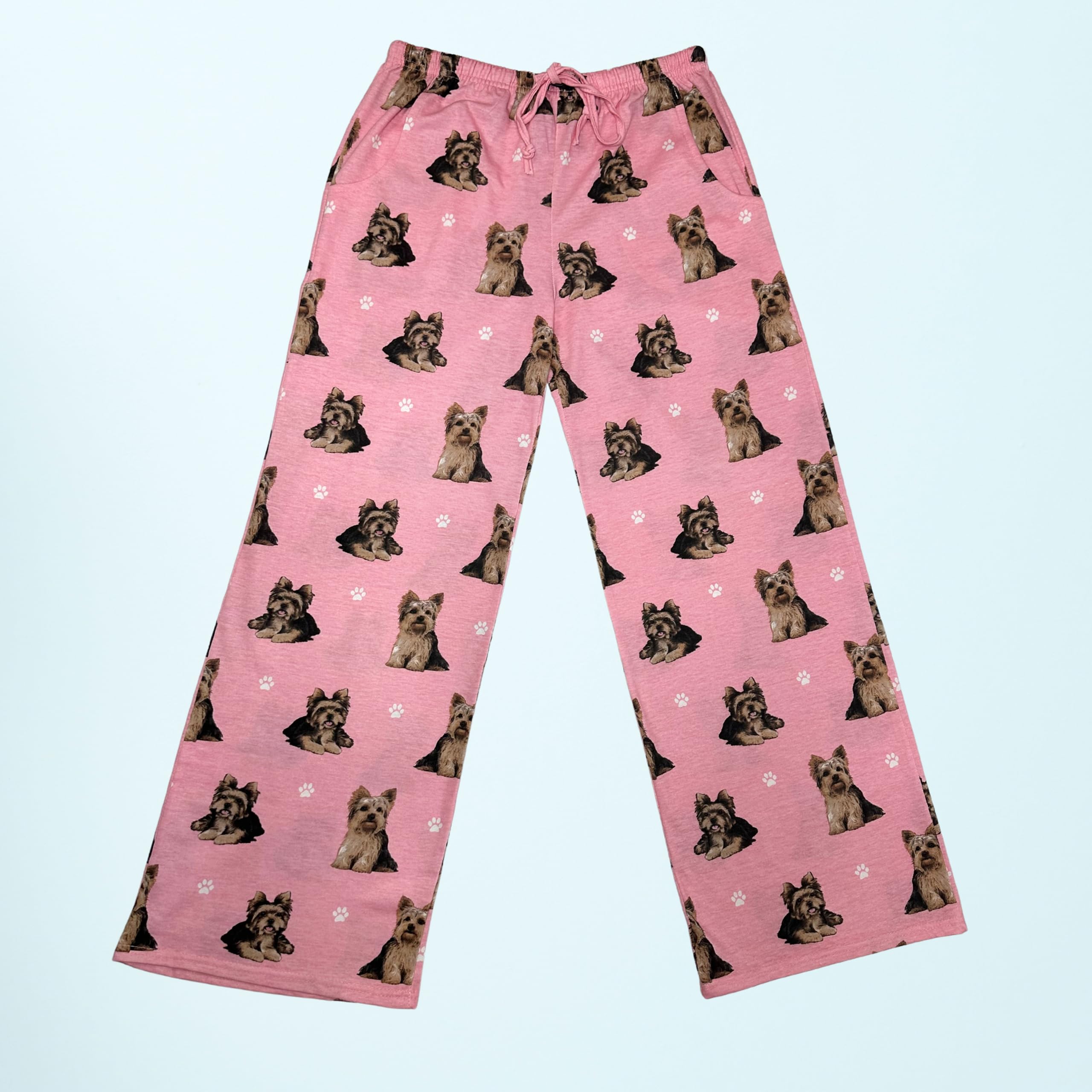 Description Pet Pajama Pants. Sleep in style and cozy comfort with these classic cotton blend Pet PJs. Fits a wide range of people with two pockets on the sides and drawstrings. We focused on creating high quality and affordable and long lasting everyday clothing you can rely on. Our pajama bottoms are stylish with amazing colors. The pictures of the Dogs and Cats are screen printed. You can wash them over and over again but they won’t fade or lose shape. Each piece is put to the test to maintain the highest standards in quality and comfort. If you have a dog or a cat, you owe it to yourself to buy these pajama bottoms. These pajama bottoms also make a perfect gift for anyone that has a Pet. These pajama bottoms will keep you relaxed after a whole day of hard work. Our Pj bottoms are made from high quality fabric and they will last you a long time. Put them in your morning and evening routine will be more pleasurable. They are made with imported 65% Cotton, 35% Polyester - Straight-leg lounge pants with elasticized waist and drawstring tie and two pockets. Best of all Our PJ’s are for Men and Women both. These PJs make a perfect Pet Gift.