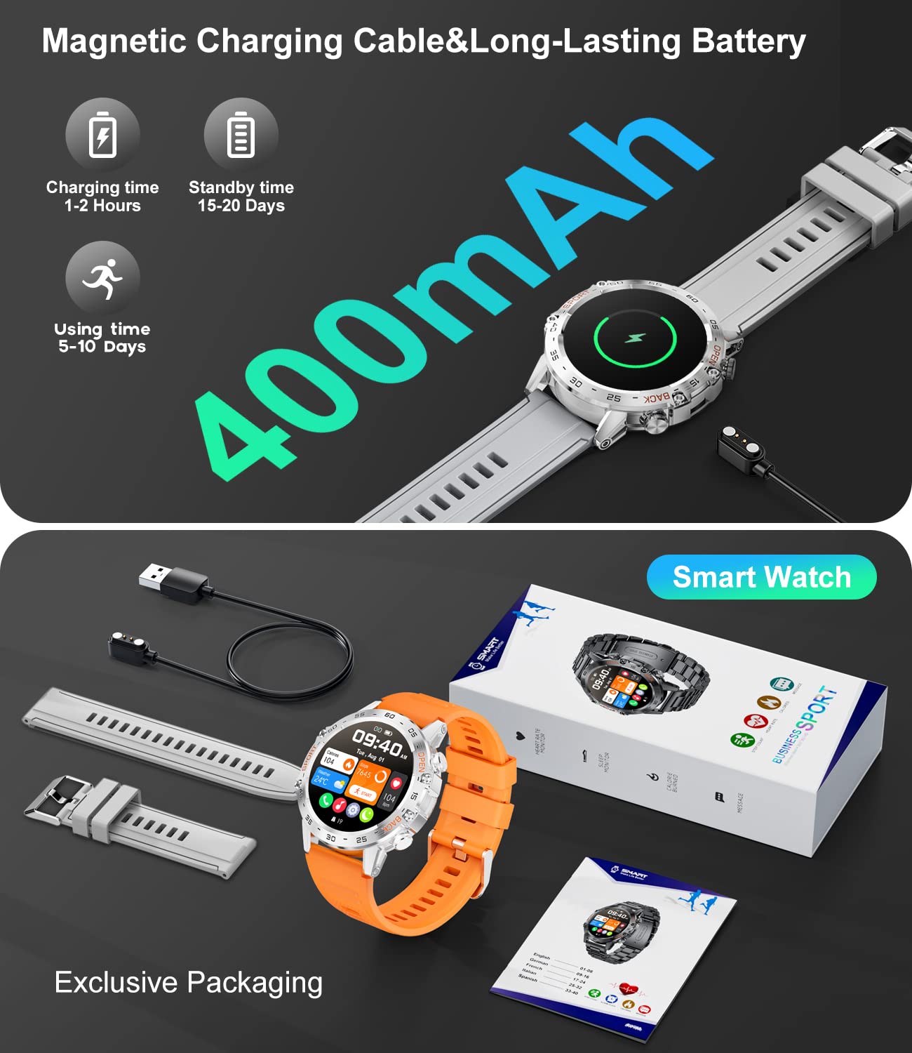 【400mAh Large Battery Capacity & DIY HD Touch Screen】Military tactical sports smart watch has 400mah battery capacity with standby time up to 30 days and normal working time up to 7-10 days. 1.39'' HD touch screen with 360*360 pixels. Adjustable 5 brightness levels, so you can see the content of the watch in strong outdoor light. Built-in rich UI, 7 local classic UI, and close to 200 UI in the APP store to choose from. Customize your personal UI to show your personality.