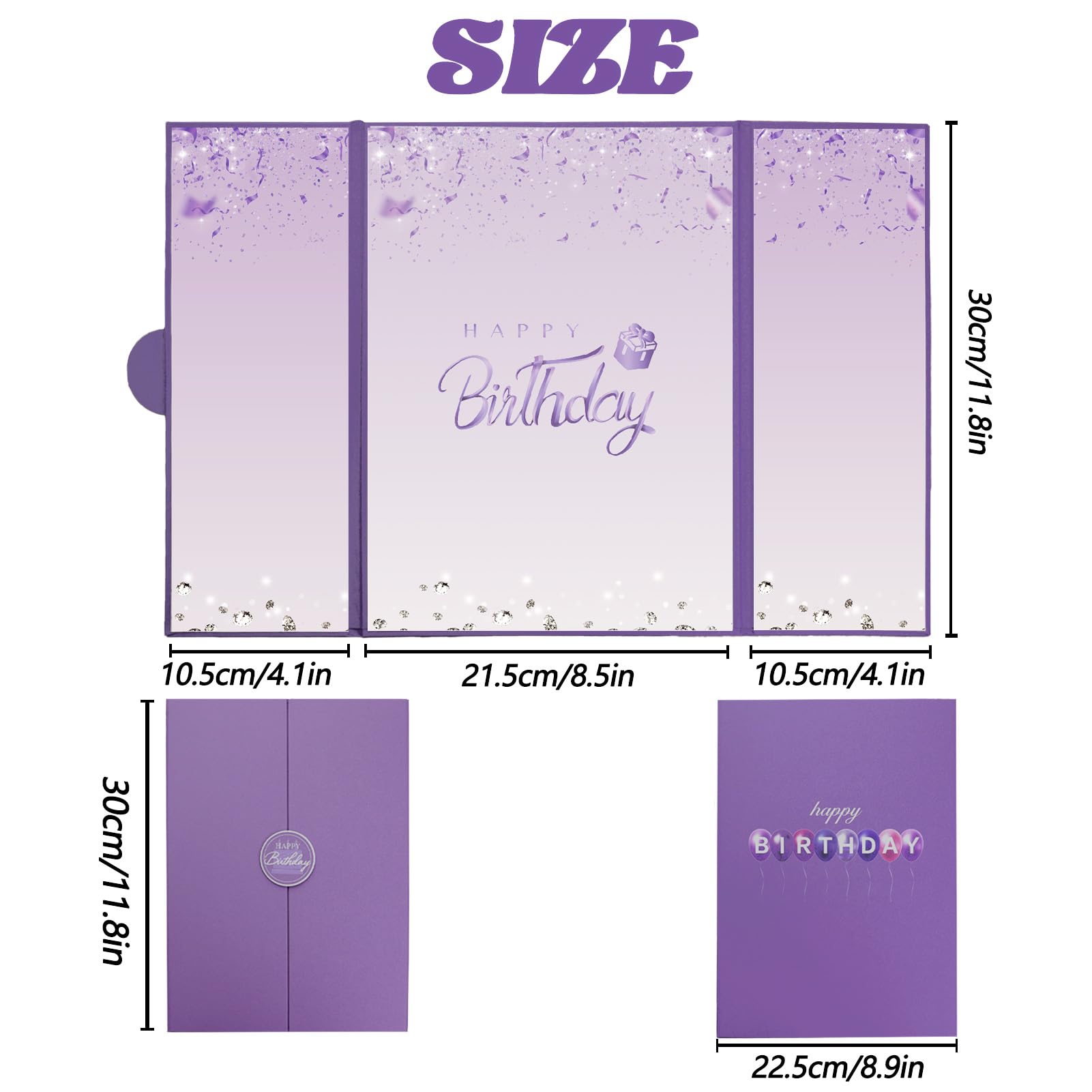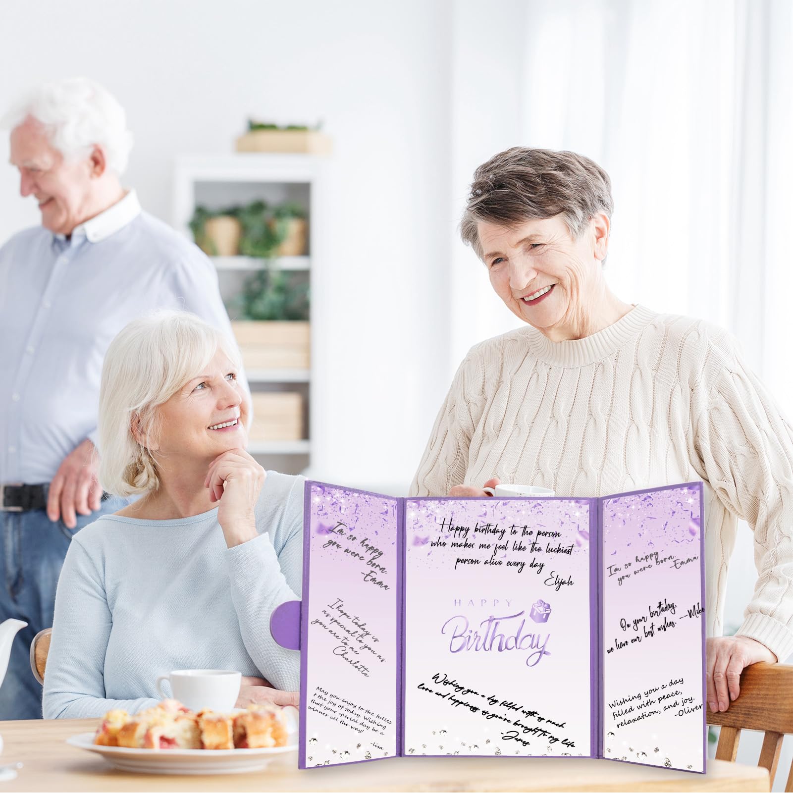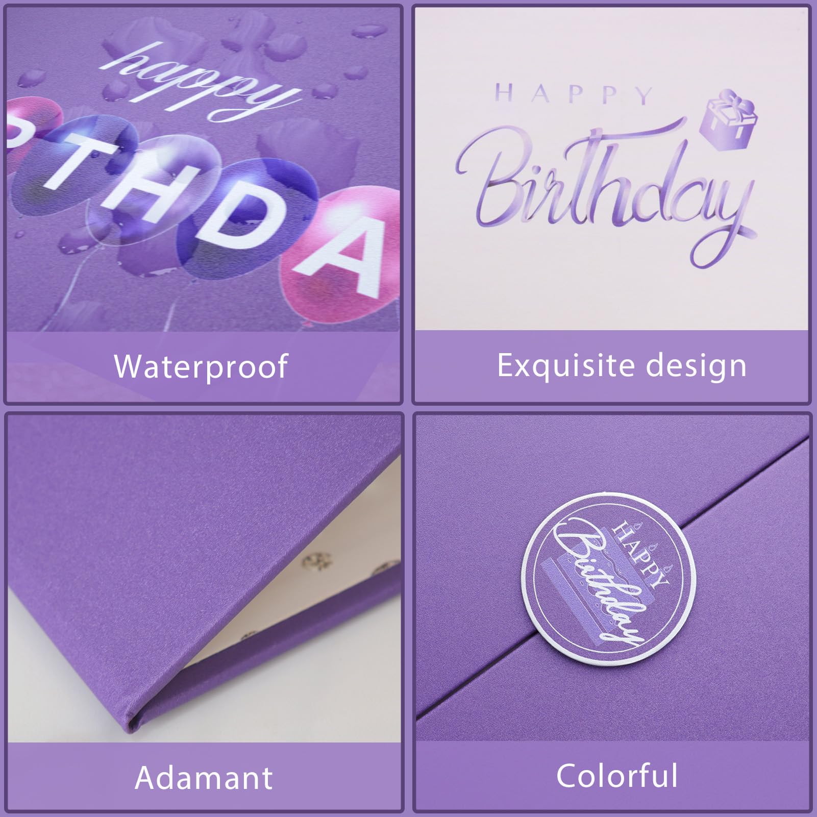 【Exquisite Design】- The purple certificate has a badge on the cover, and the inside of the signature certificate is divided into three parts, the middle page is printed with the message 'Happy Birthday'. This purple birthday signature board can be opened directly and stand on the table. Tips: No pen.