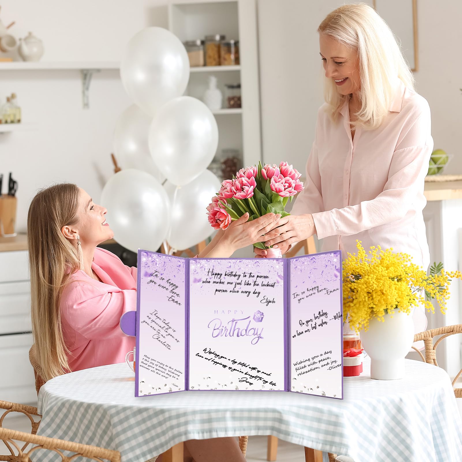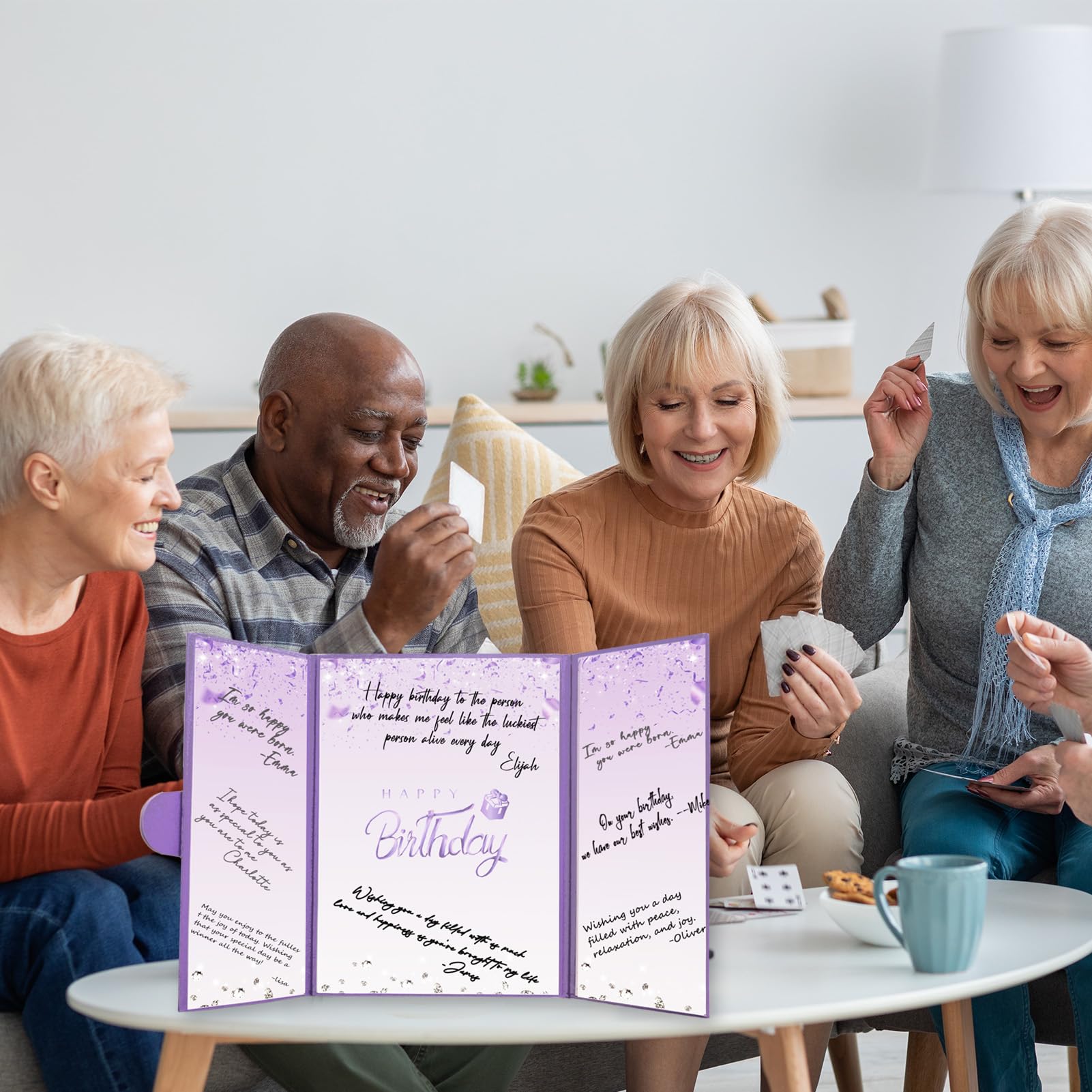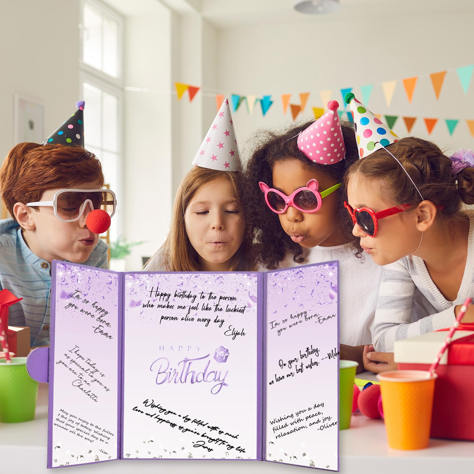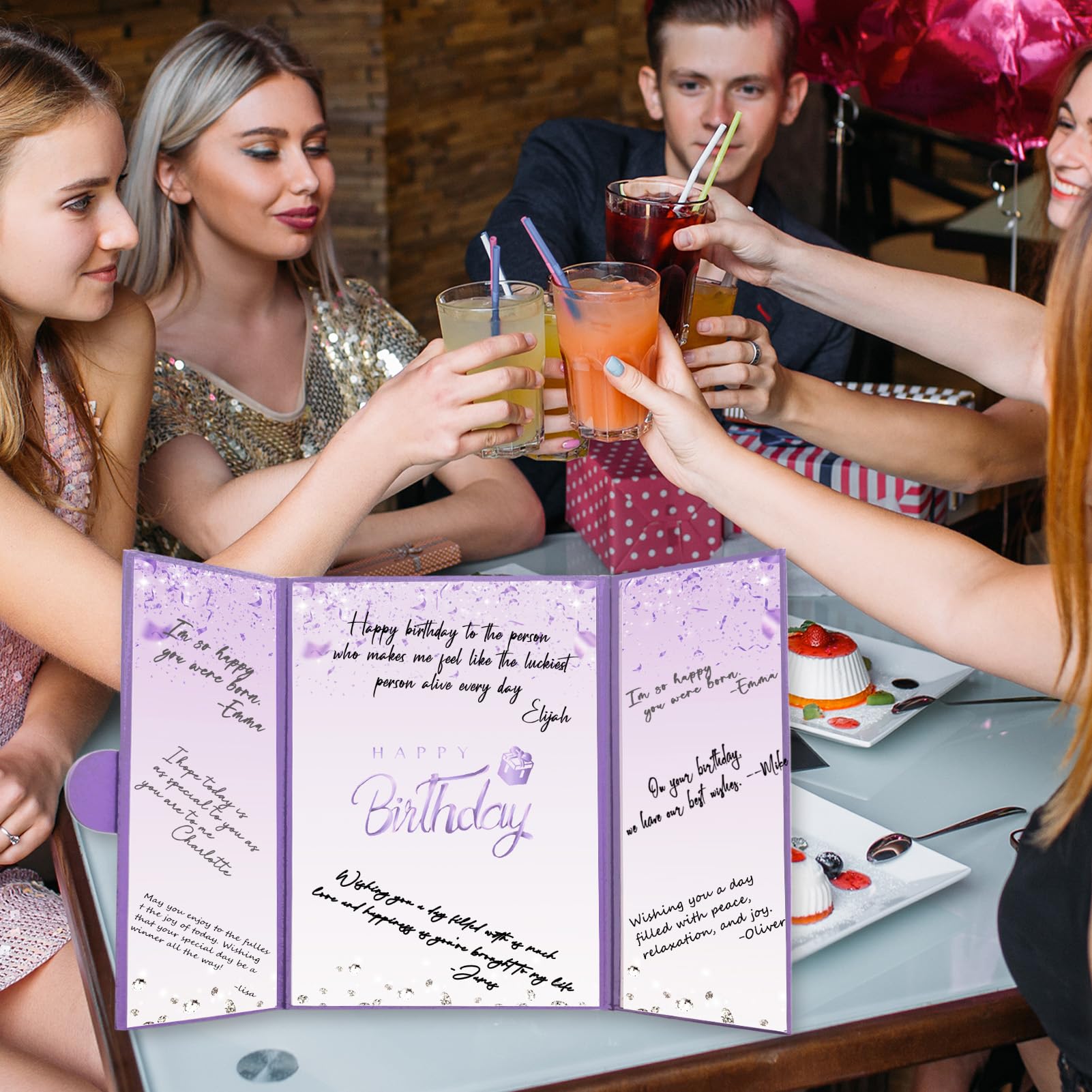 【Exquisite Design】- The purple certificate has a badge on the cover, and the inside of the signature certificate is divided into three parts, the middle page is printed with the message 'Happy Birthday'. This purple birthday signature board can be opened directly and stand on the table. Tips: No pen.
