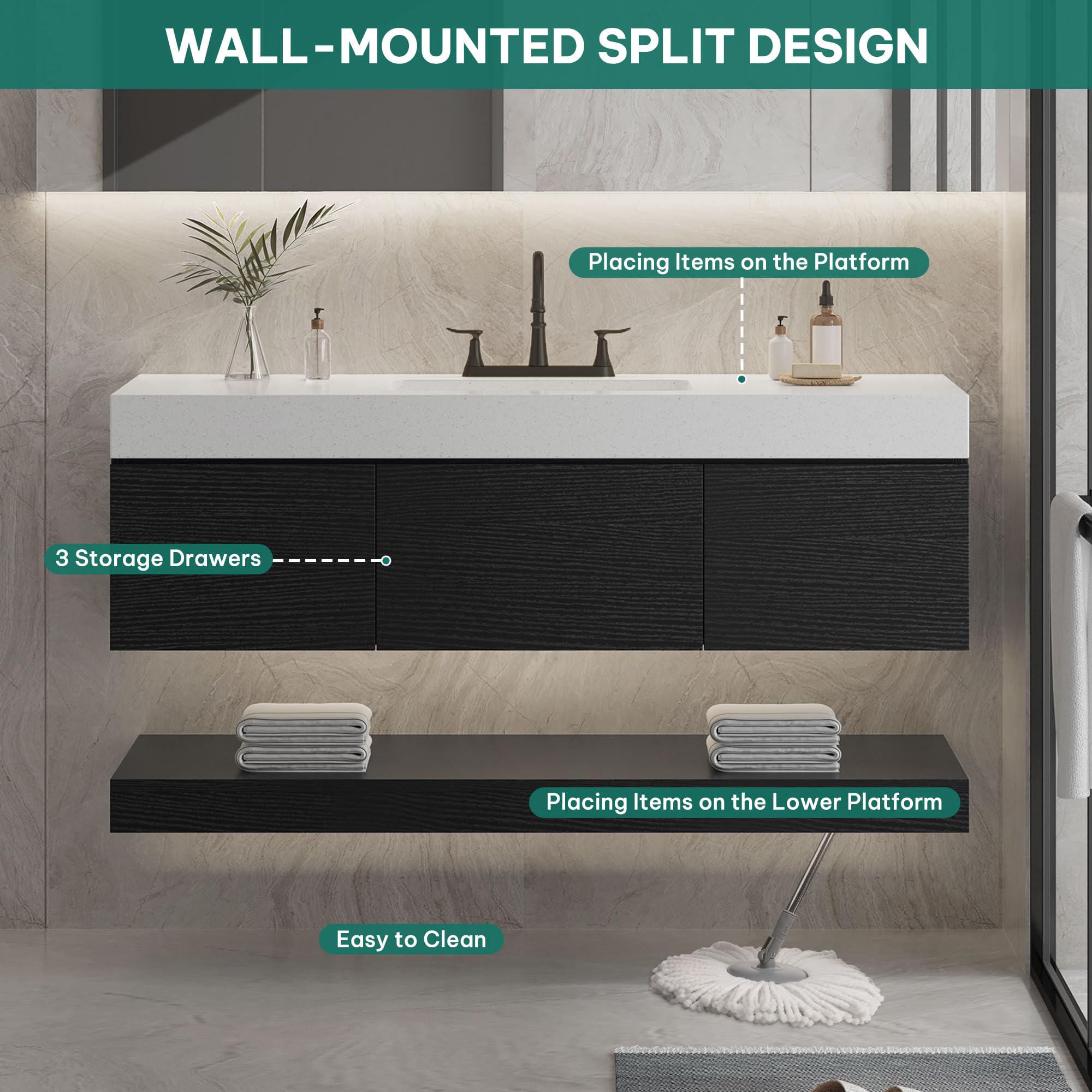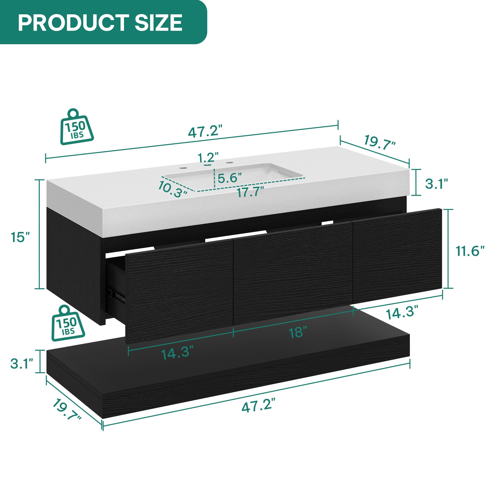 Big Space Storage with 3 Deep Drawers: Maximize organization in your YITAHOME 48-inch floating vanity! Three extra-deep, smooth-gliding drawers offer effortless access and ample space for all toiletries, towels, and essentials. Big space storage designed for your wall-mounted vanity