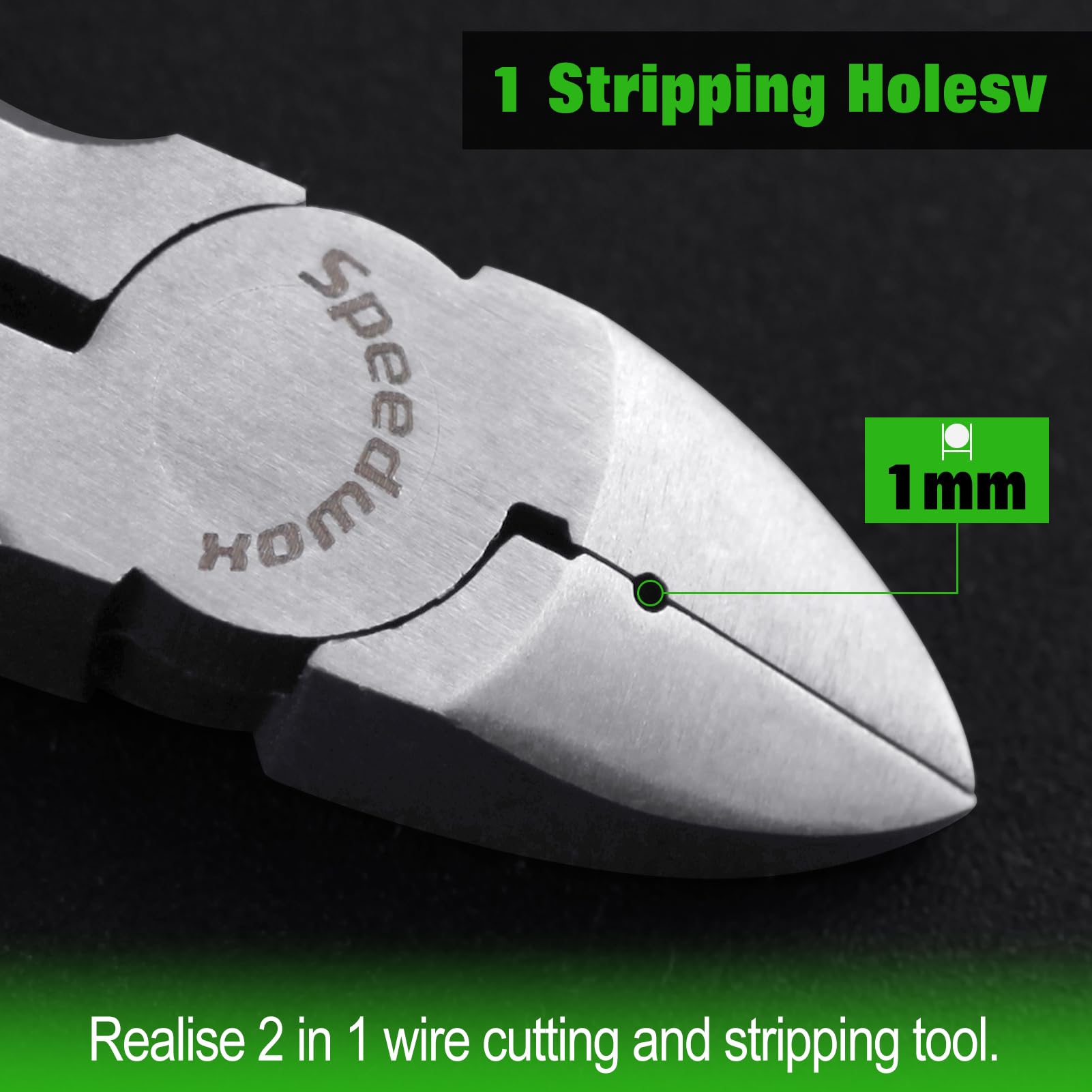 【DESIGN】Short jaws and cutting edges allow for tight cutting of wire, and a stripping slot is added to the cutting edge with a hole diameter of about 1mm, making it a two-in-one tool for cutting and stripping wire. Spring returns tool to open position to reduce operator fatigue. Small size and light weight, easy to carry and use with one hand.