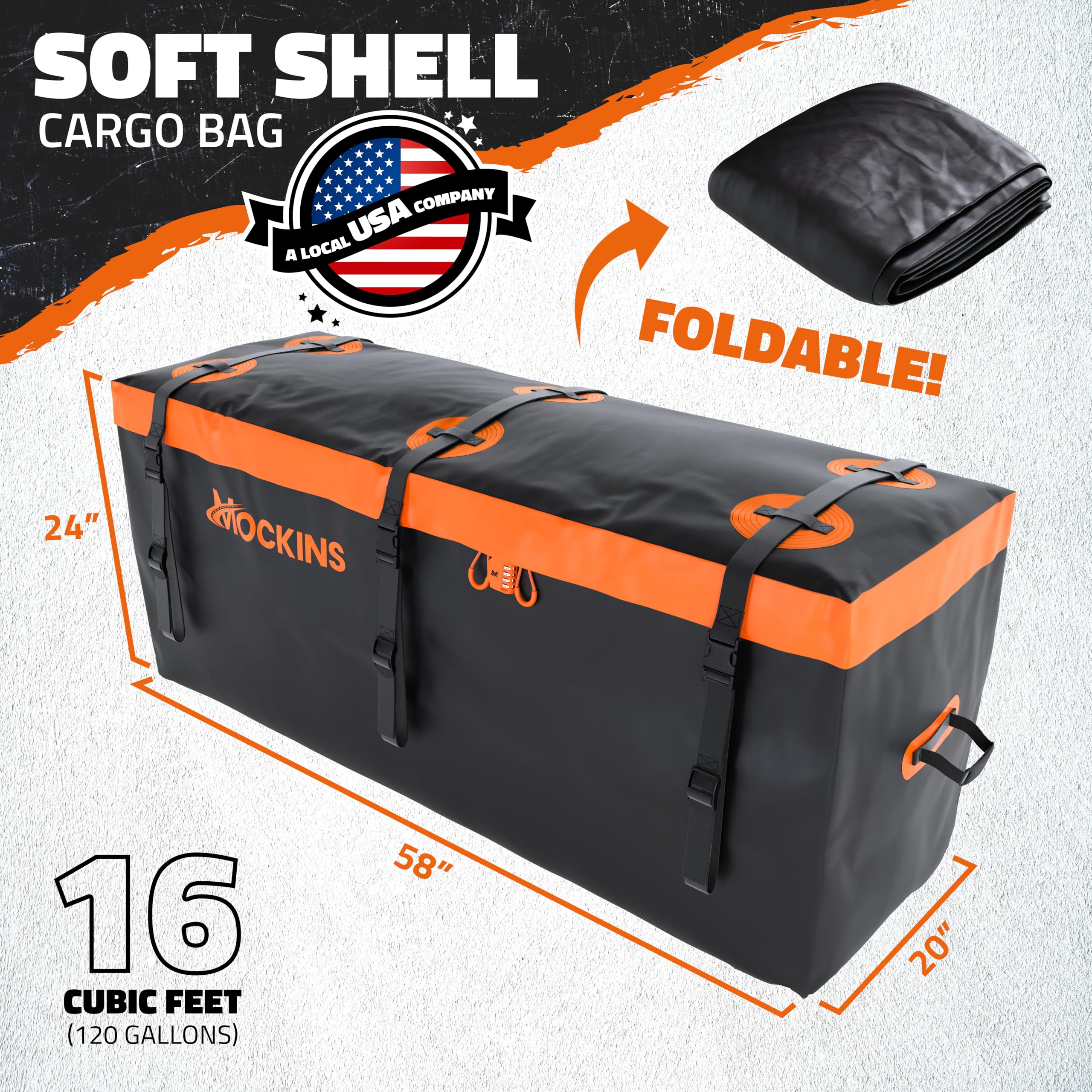 With Cargo Hitch Bag Accessories: Expand your hauling options with our car hitch & pickup bed storage solutions! Featuring 3 heavy-duty buckle straps, the Mockins Cargo Carrier bag secures your belongings & helps prevent shifting during transport. The truck bed luggage carrier bag comes in a bold black with orange trim & includes a combination lock for added anti-theft protection. When not in use, the soft-shell truck bag folds neatly into the included carry bag for convenient, compact storage.