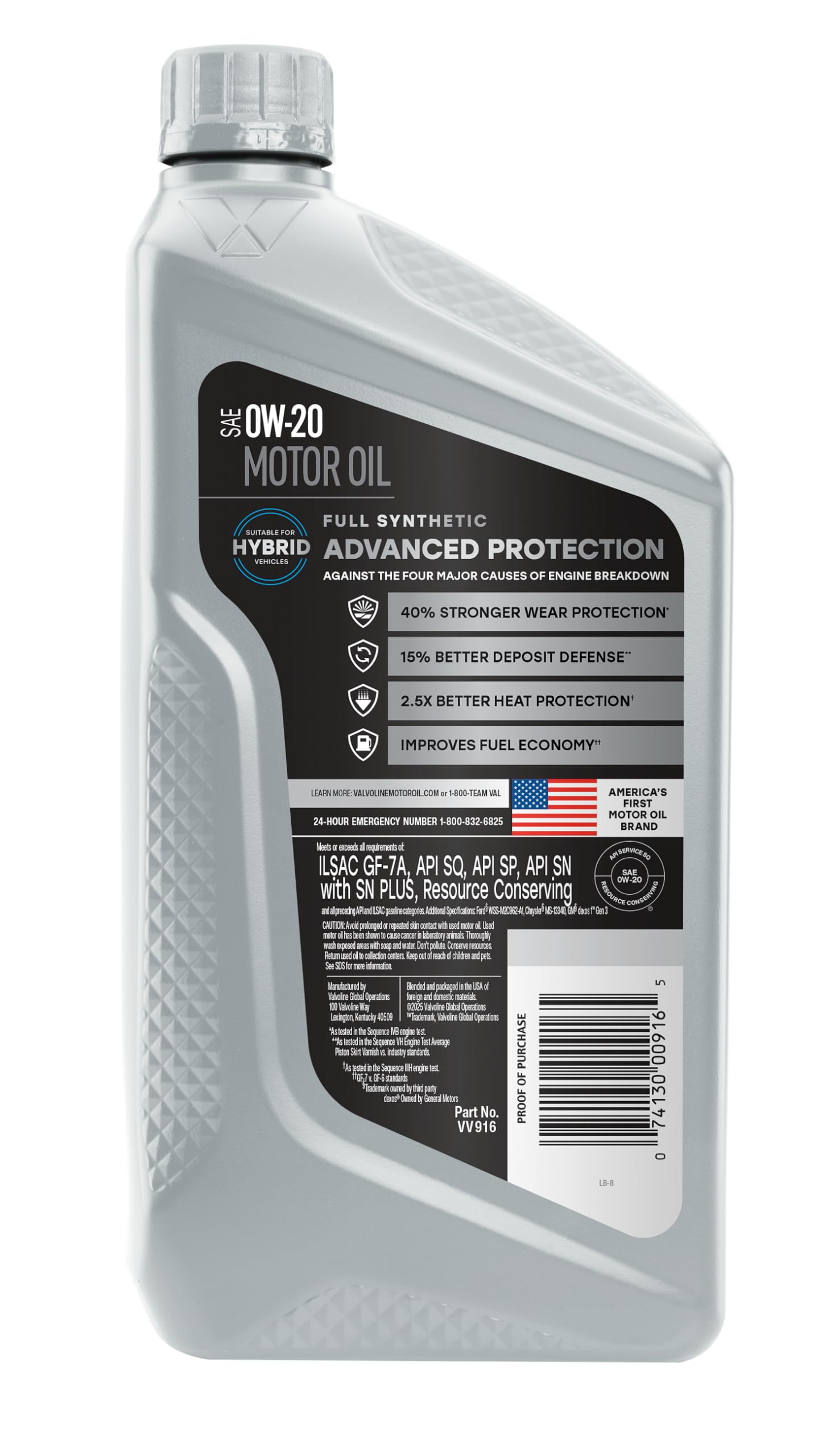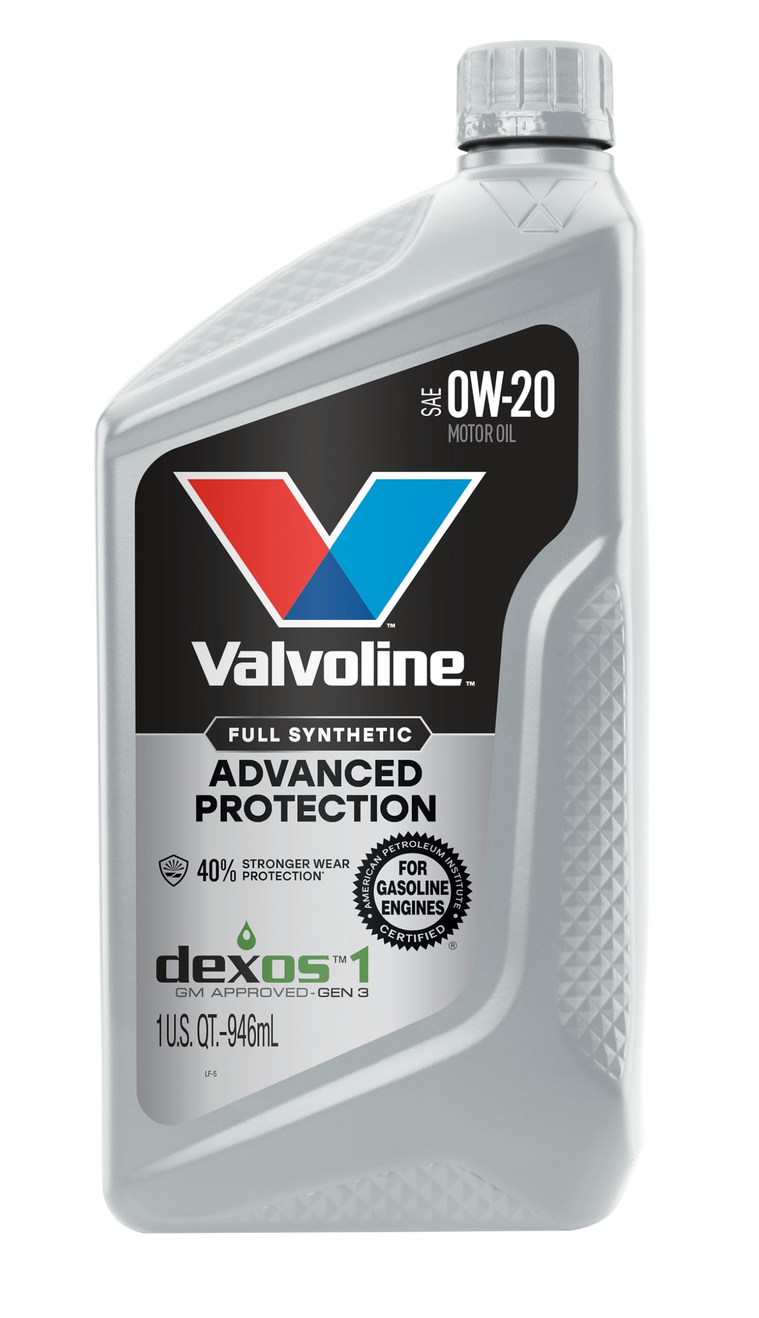 Anything a conventional motor oil can do Valvoline Advanced Full Synthetic can do better. Designed with the highest quality base oils and additives, it delivers 25% better deposit protection and 40% better protection against wear than industry standards. With less wear, you can expect stronger performance, optimal fuel efficiency, and a longer-lasting engine. Driving conditions like short trips or stop-and-go traffic are hard on a vehicle and the car’s engine oil, causing extreme heat and temperature fluctuations inside your motor that can lead to harmful sludge and extra friction. Valvoline Advanced Full Synthetic Motor Oil includes additional boosters to minimize the effects of heat. And for enhanced cold start protection, it flows easily at low temperatures. Step up to one of our best motor oils for superior performance in all types of weather and conditions. GM dexos 1 Gen3 certified and approved in SAE 0W-20 and 5W-30, Valvoline Advanced Full Synthetic Motor Oil provides 24X stronger protection against engine-killing contaminants than the leading full synthetic, keeping your motor running smooth whether it’s a Ford, Toyota, Dodge, Jeep or Honda. Valvoline Advanced Full Synthetic, from the Original Motor Oil brand trusted for more than 150 years.
