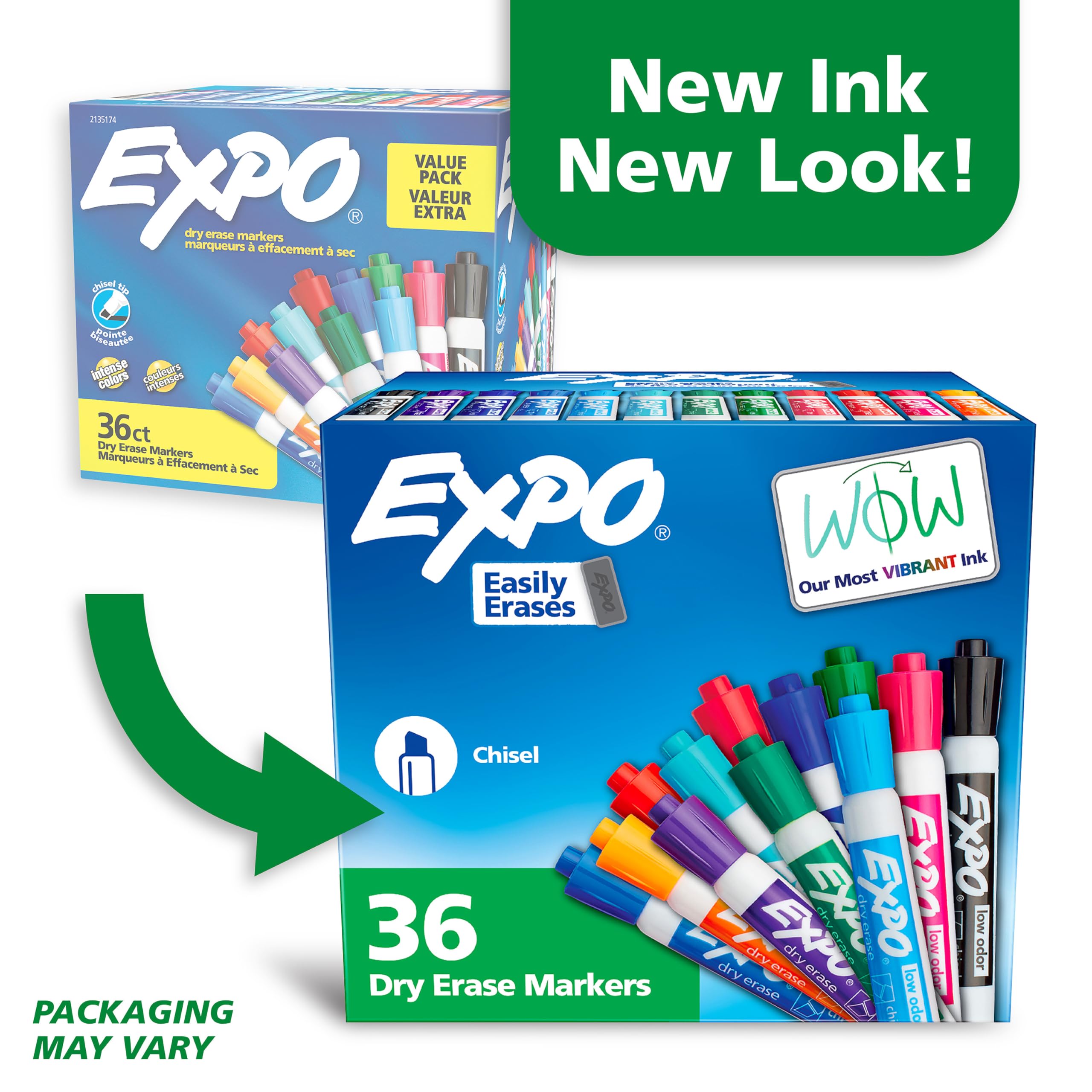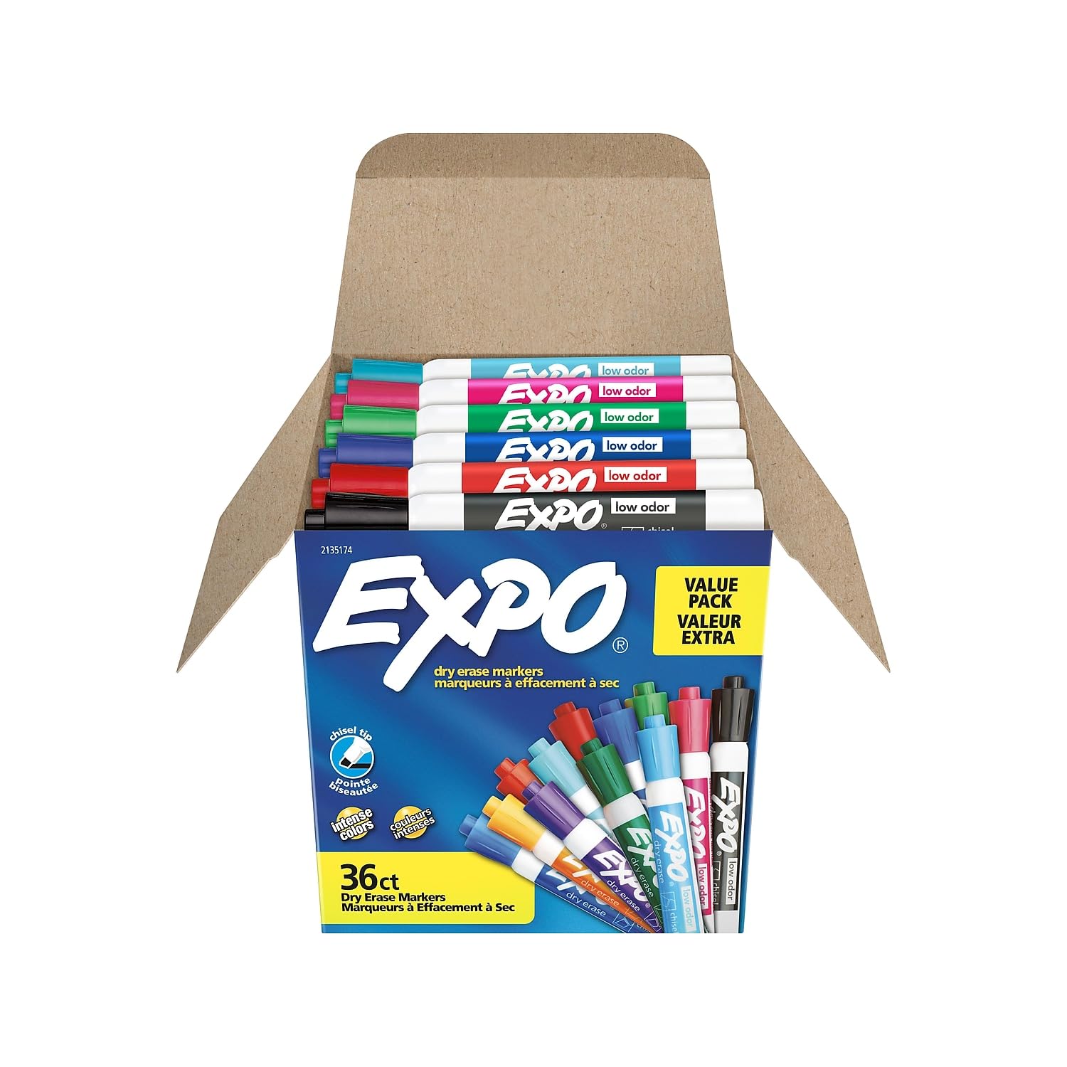 The EXPO Low Odor Dry Erase Markers feature a chisel tip for broad, medium, and fine lines, making them versatile for all your writing needs. With a low-odor ink formula, they are ideal for classrooms, offices, and home offices. The vivid, quick-drying ink is easy to erase and see from a distance and offers the best solution for marking on whiteboards and most non-porous surfaces.