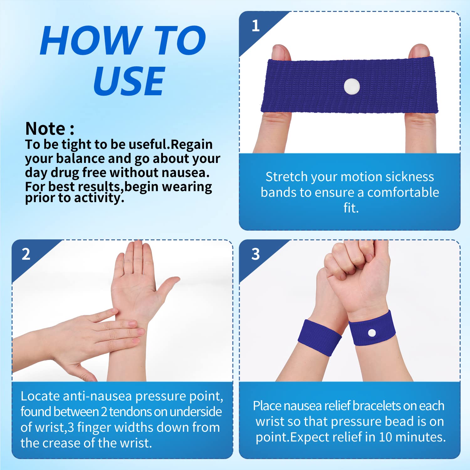 š¬ćHealthy & No Side Effectsć:Seasickness wristbands are clinically tested and recommended by healthcare experts to relieve nausea.It works by pressure on the Nei-Kuan acupressure points on each wrist by means of a plastic button that work to restore balance in the body.
