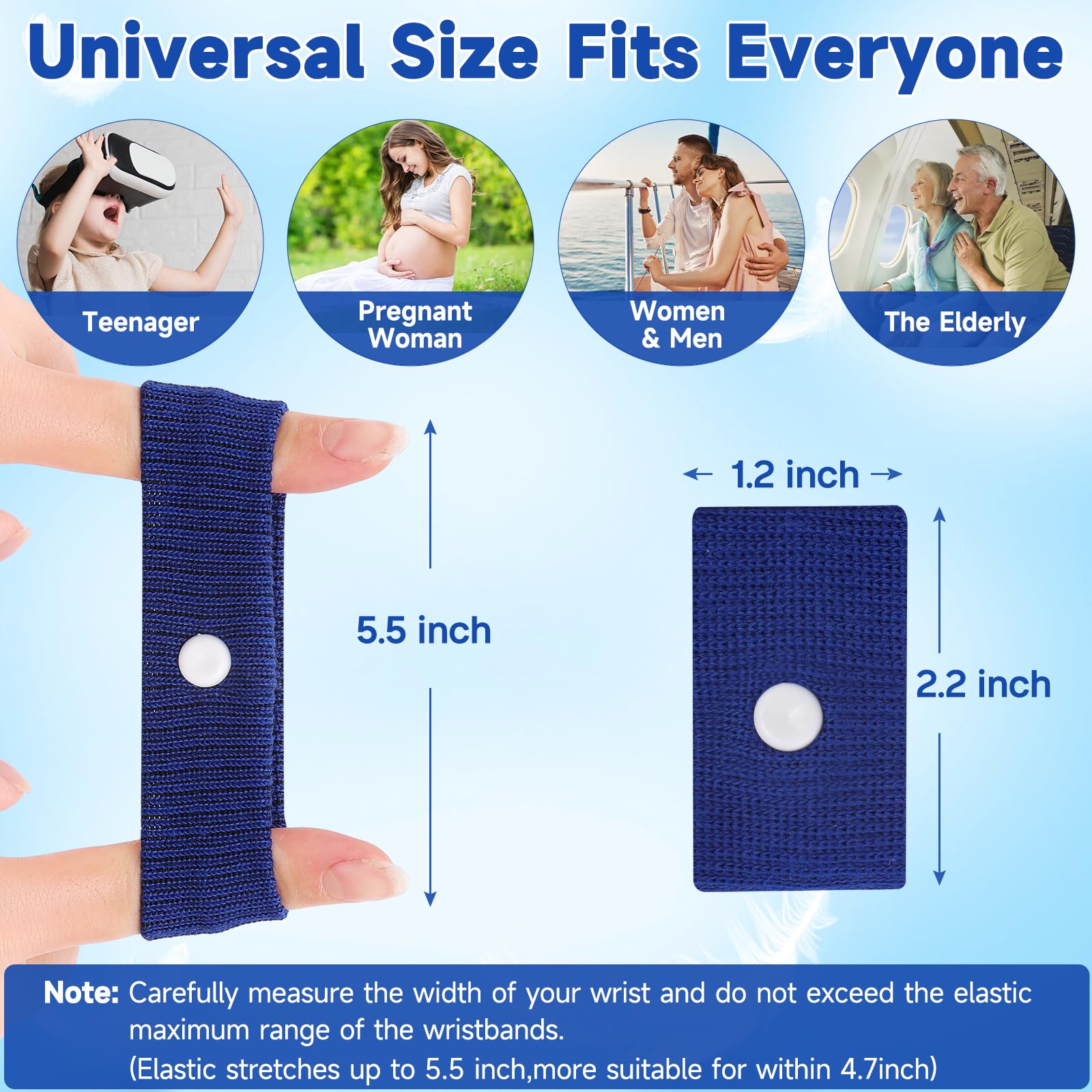 š¬Comfortably with soft cotton material and strong elastic designs.Motion sickness wristbands size:2.2*1.2inch (maximum stretch is 5.5inch) fits for adults;2*1.2inch (maximum stretch is 4.7inch) fits for kids. Please measure your wrist or ask our customer service before your order this nausea relief bracelets.