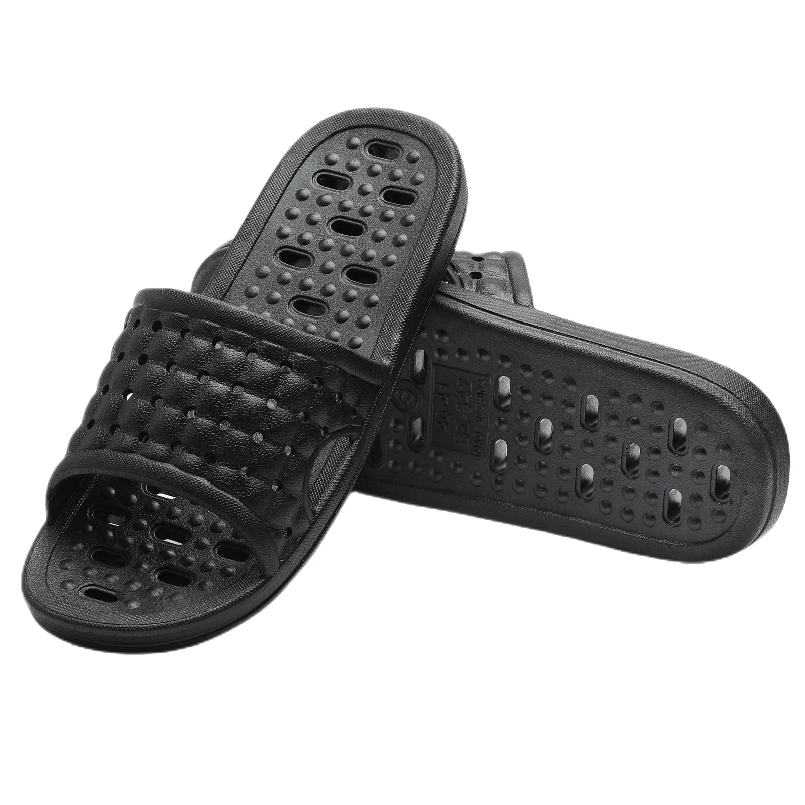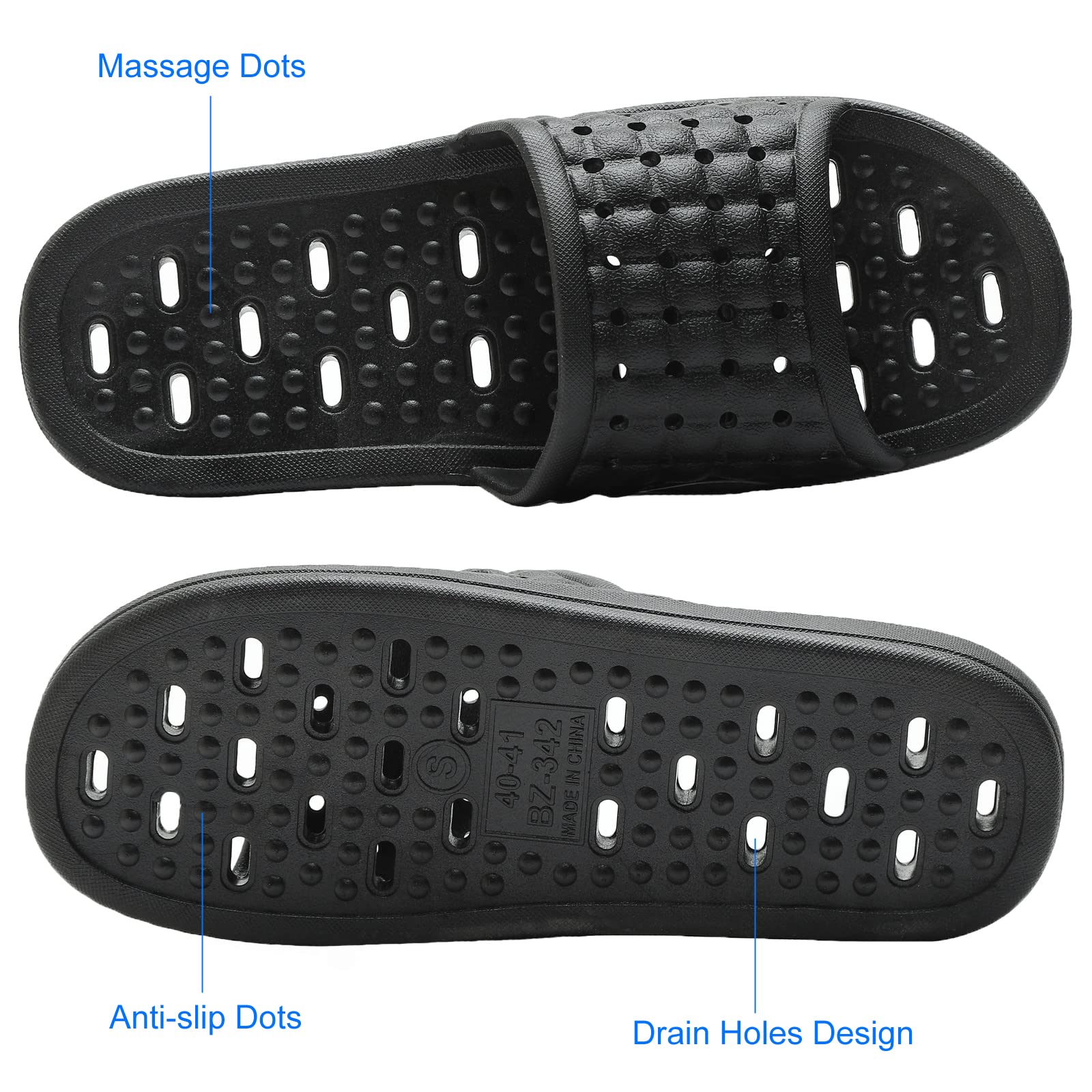 COMFORT & RELAX – The shower slides have soles with a upwarp designed for ergonomic support, relieve the pressure brought by toes when walking, they are comfortable to wear. The upper soles have tiny little bumps that stimulate your feet a little bit which helps to get the blood flowing, help to make your feet feel better and more relaxed.
