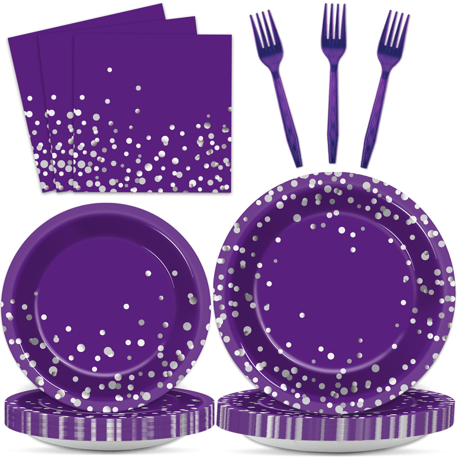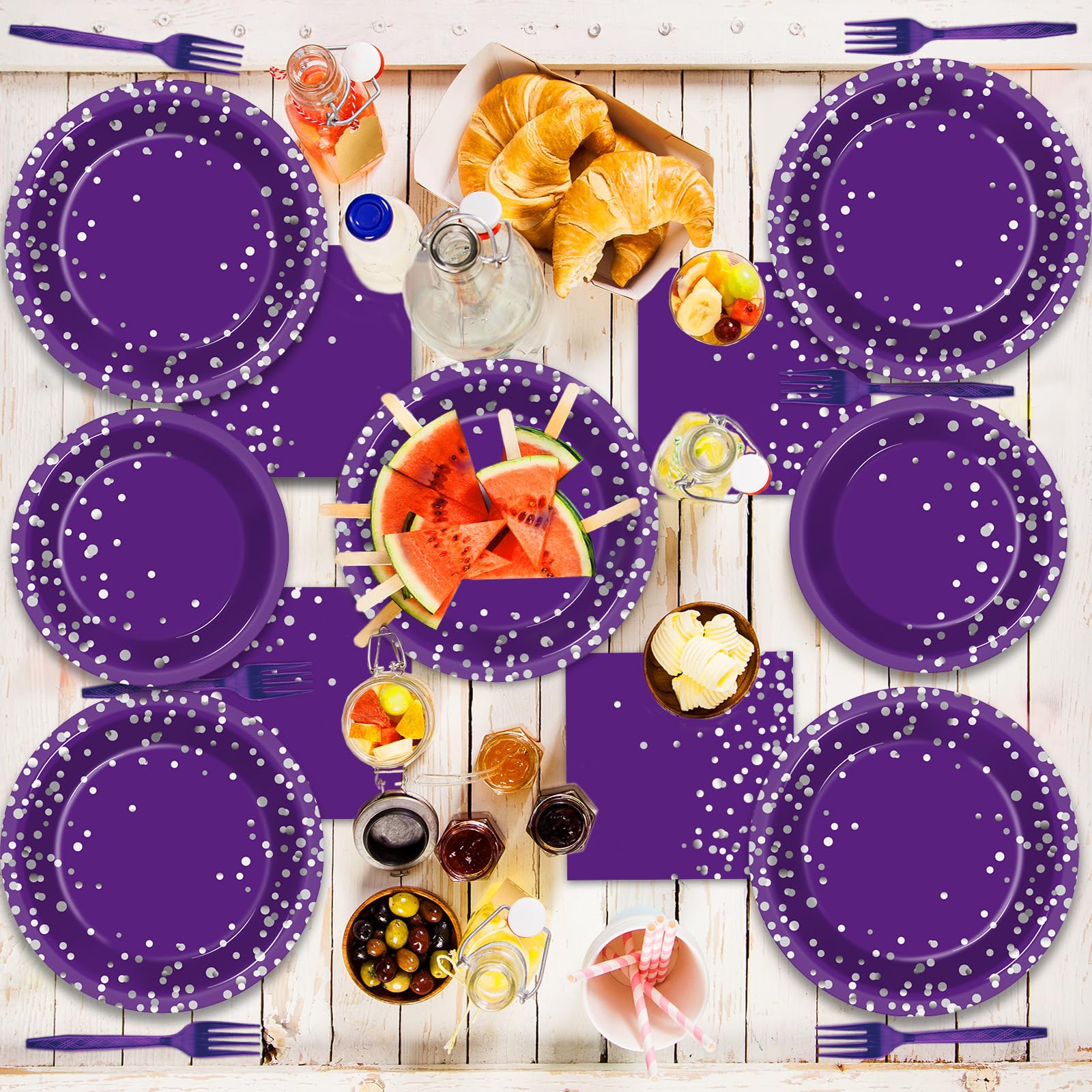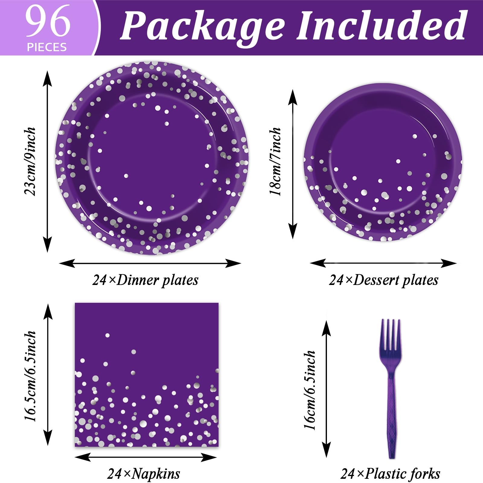 【Purple Party Supplies】You will receive 24 pieces purple silver dot party paper dinner plates of 9’’, 24 pieces plates of 7’’, 24 pieces purple birthday napkins of 6.5’’ and 24 plastic forks for each set that can serve 24 guests.