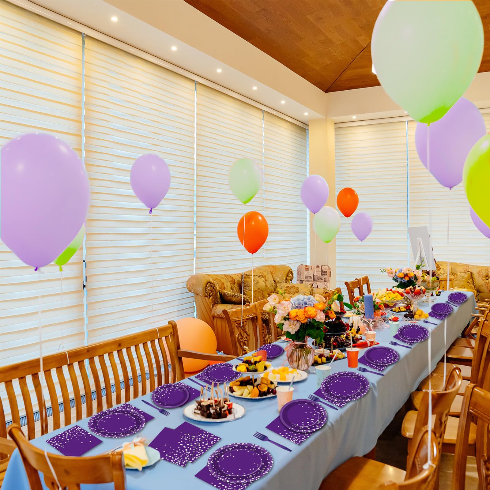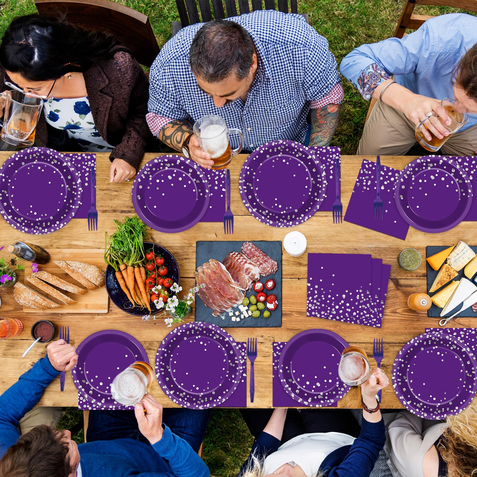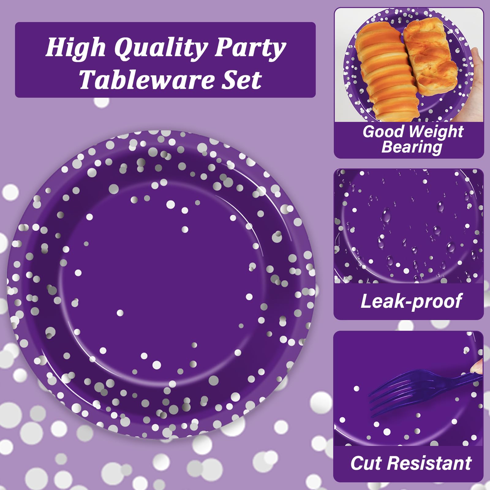 【Purple Party Supplies】You will receive 24 pieces purple silver dot party paper dinner plates of 9’’, 24 pieces plates of 7’’, 24 pieces purple birthday napkins of 6.5’’ and 24 plastic forks for each set that can serve 24 guests.