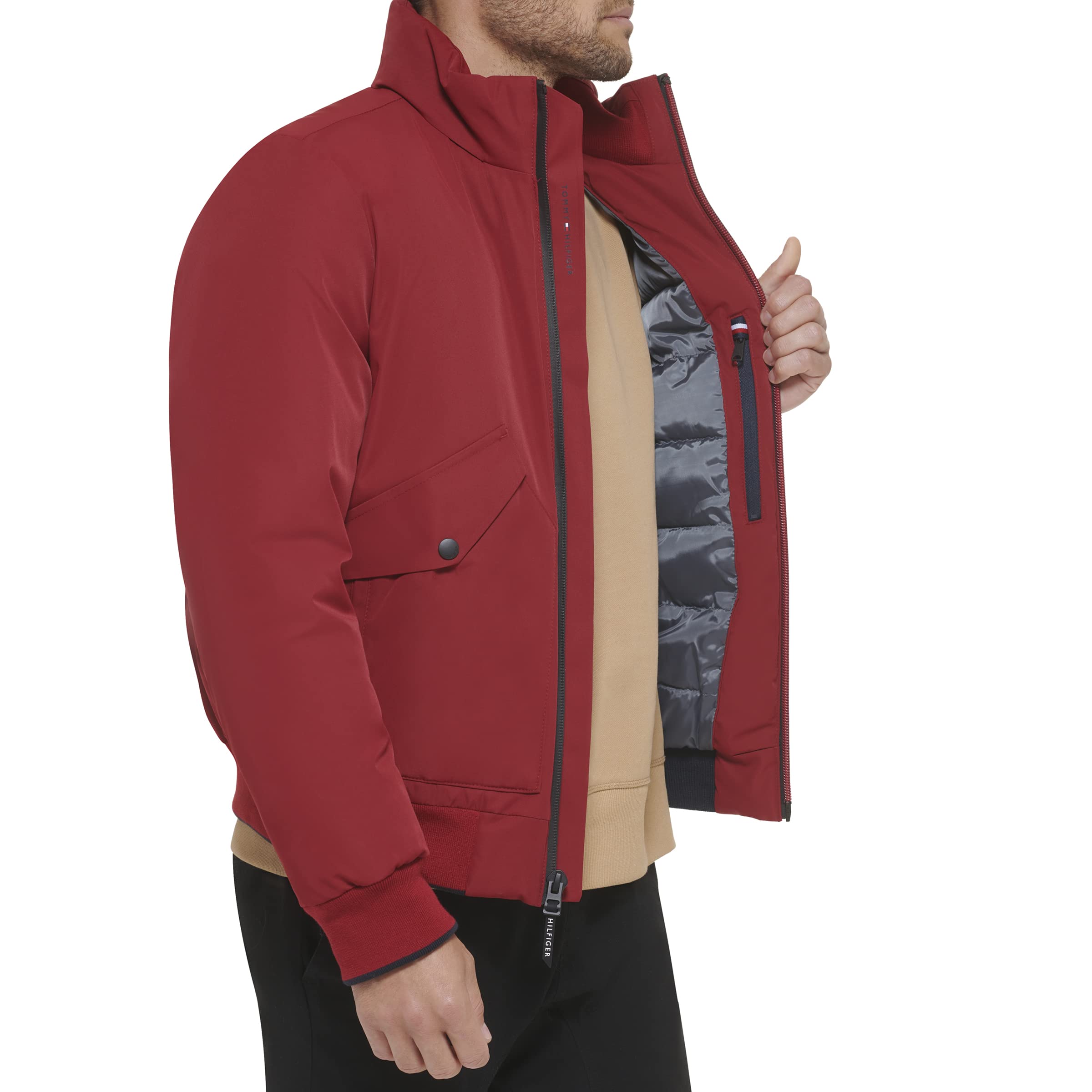 Description Stay sleek, stylish and warm with Tommy Hilfiger's Flex Stretch Performance Bomber. This outer jacket is designed with a stand collar, soft rib knit cuffs and hem, and quilted interior lining.