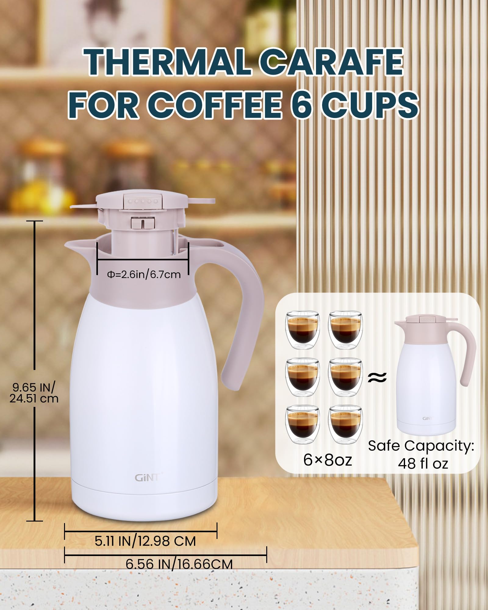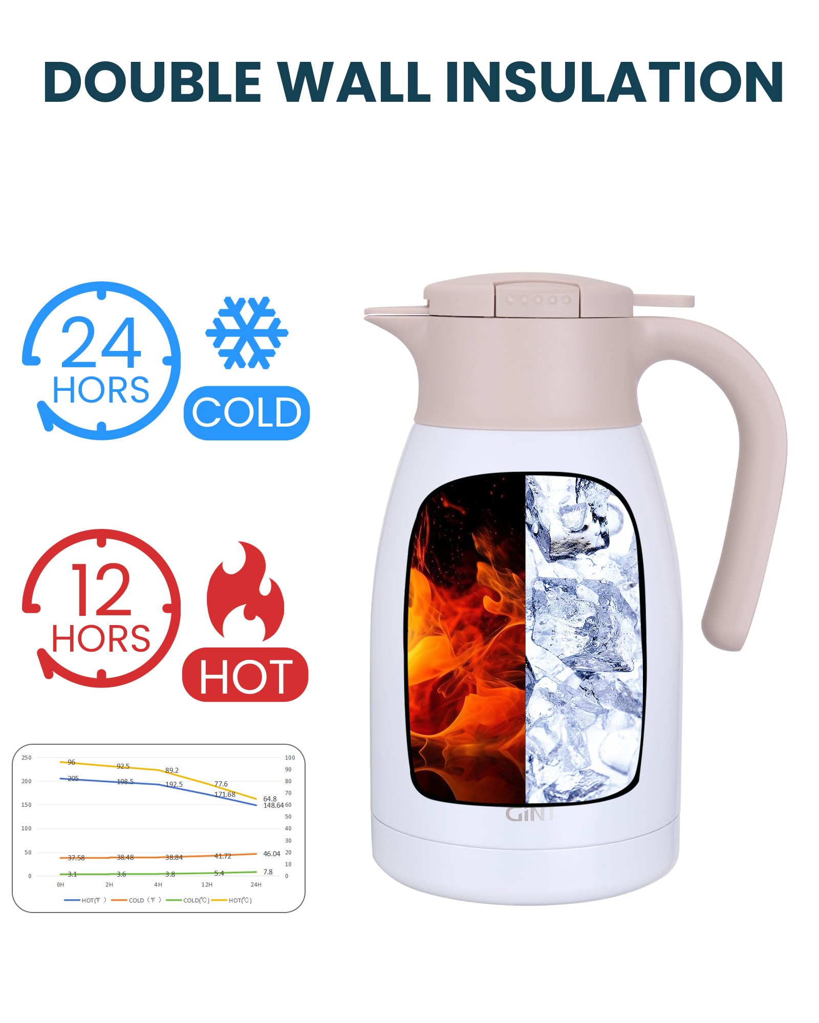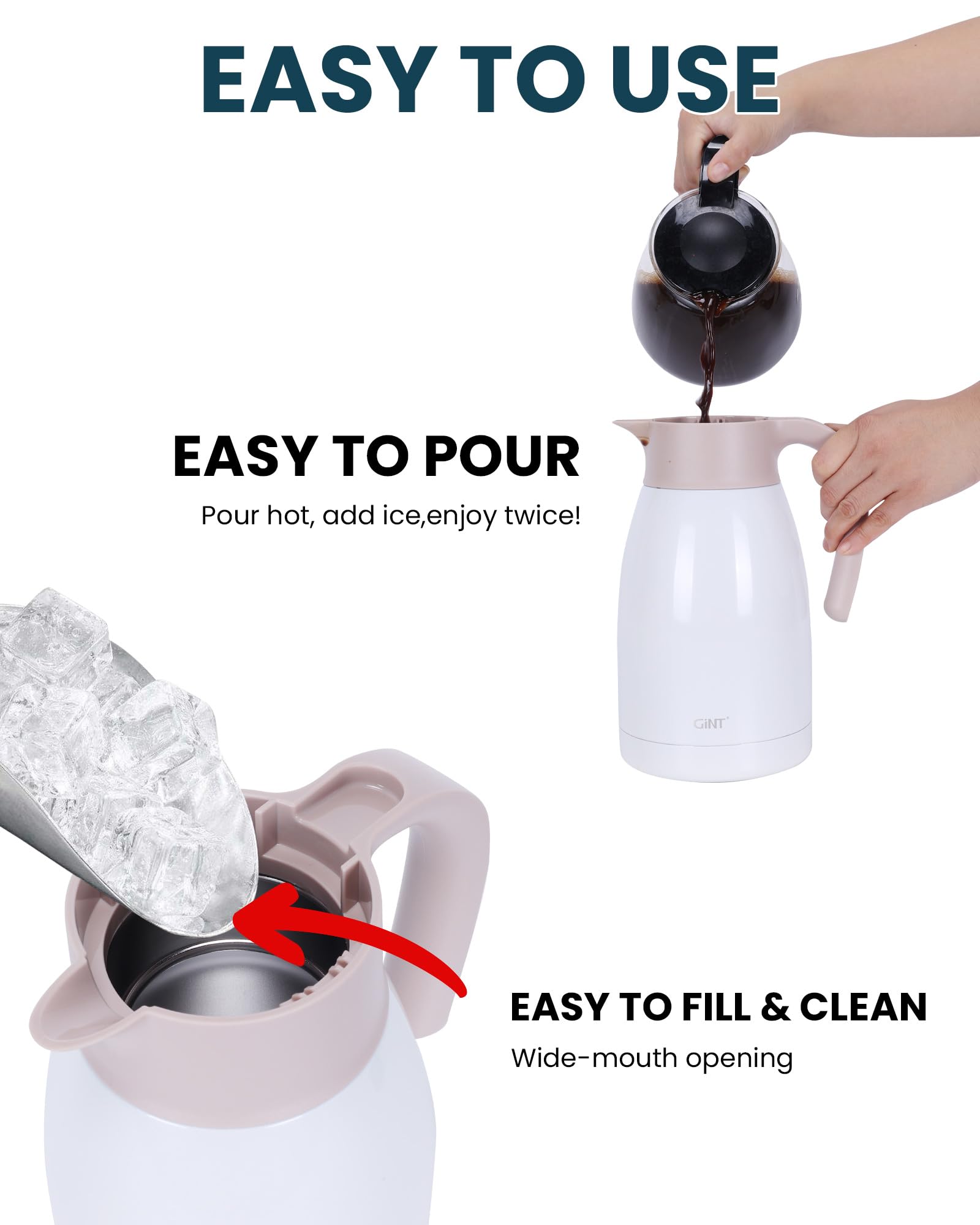 USER FRIENDLY: GiNT thermal carafe features extra wide top opening, easy for cleaning and adding ice cubes; Simple-push button enables single-hand pouring without leaking, dripping or spilling; Ideal used for bedside, restaurant, office, party, camping, travel insulated coffee carafes.