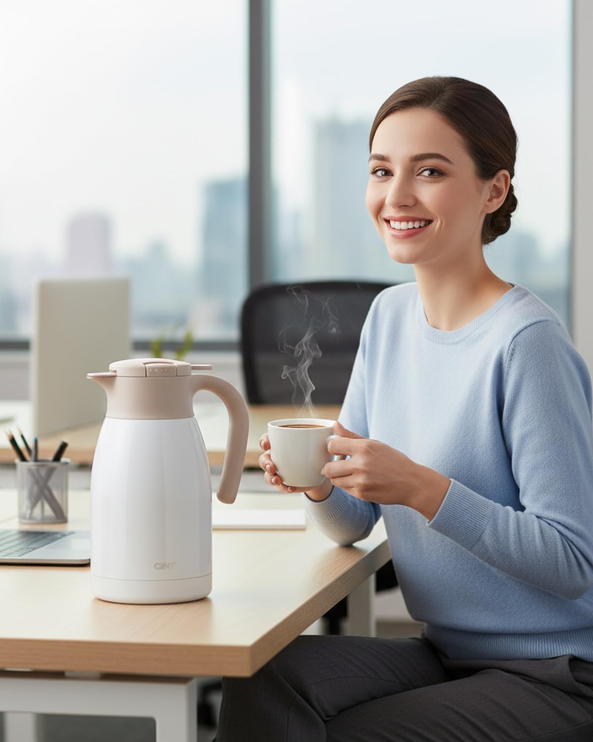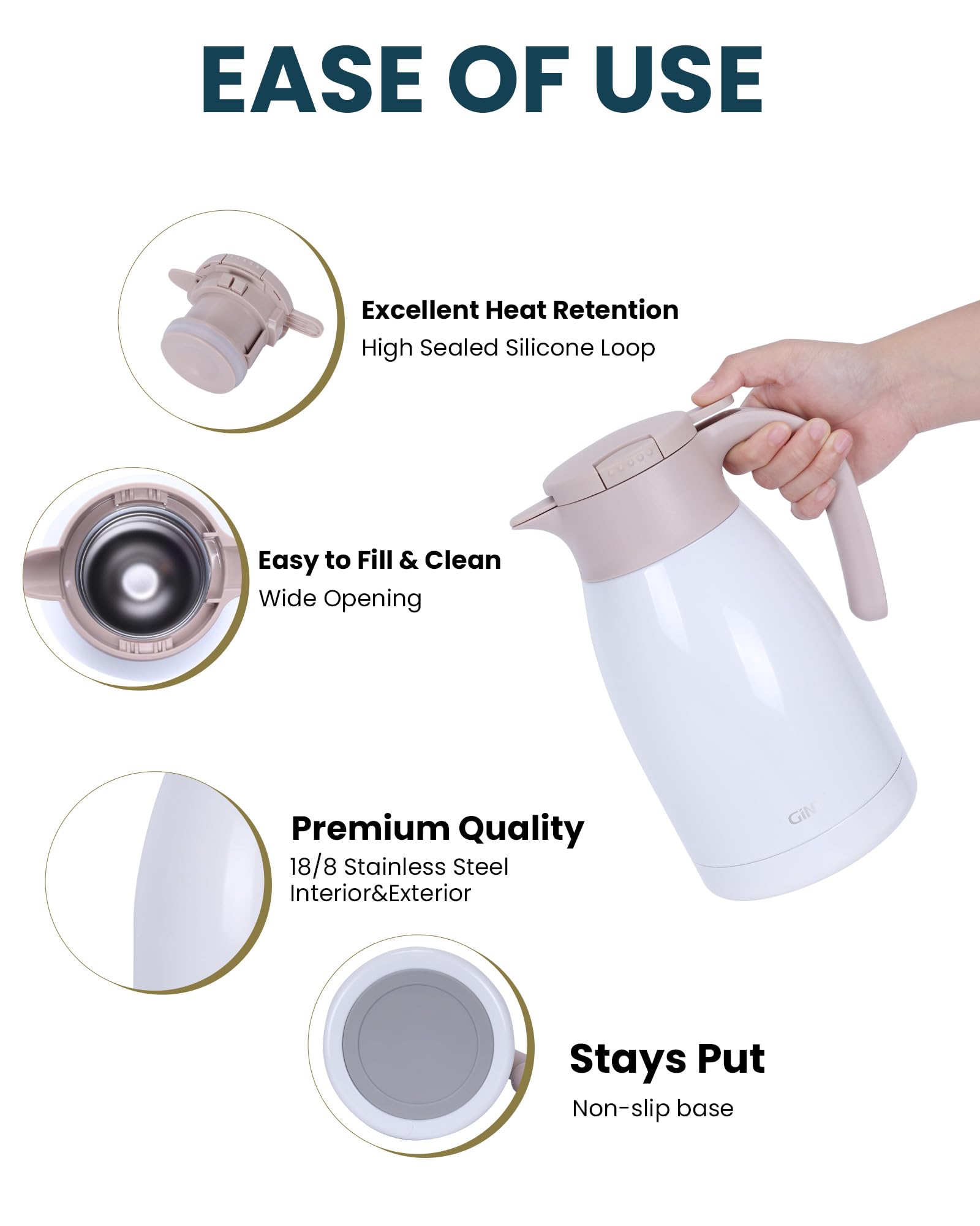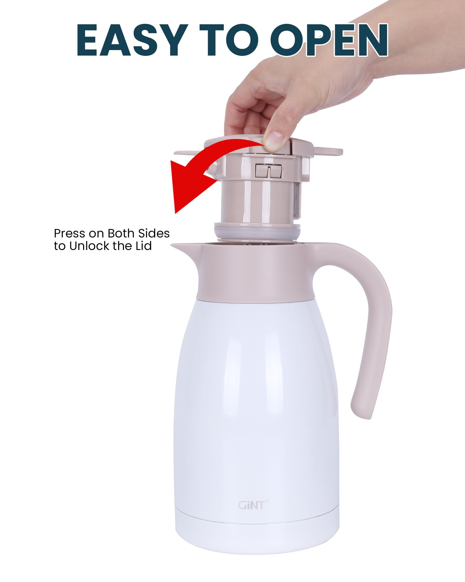 USER FRIENDLY: GiNT thermal carafe features extra wide top opening, easy for cleaning and adding ice cubes; Simple-push button enables single-hand pouring without leaking, dripping or spilling; Ideal used for bedside, restaurant, office, party, camping, travel insulated coffee carafes.