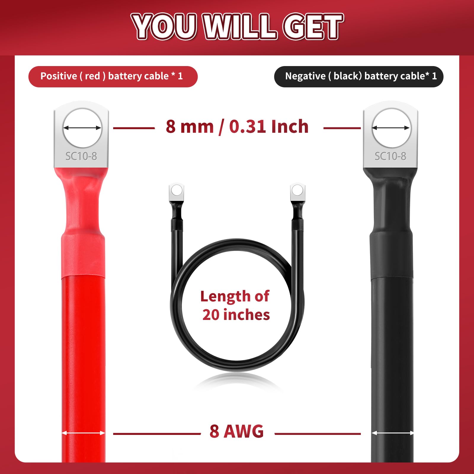 【YOU WILL GET】Positive (red) battery cable * 1, negative (black) battery cable * 1. Battery cables with terminals are 20 inch in length, 8 AWG. Marine battery cables are equipped with 8mm inner diameter rings at the end of the cables. The terminal of the marine battery cable is equipped with 8 mm inner diameter ring terminals, which can be connected and used to complete the project easily.