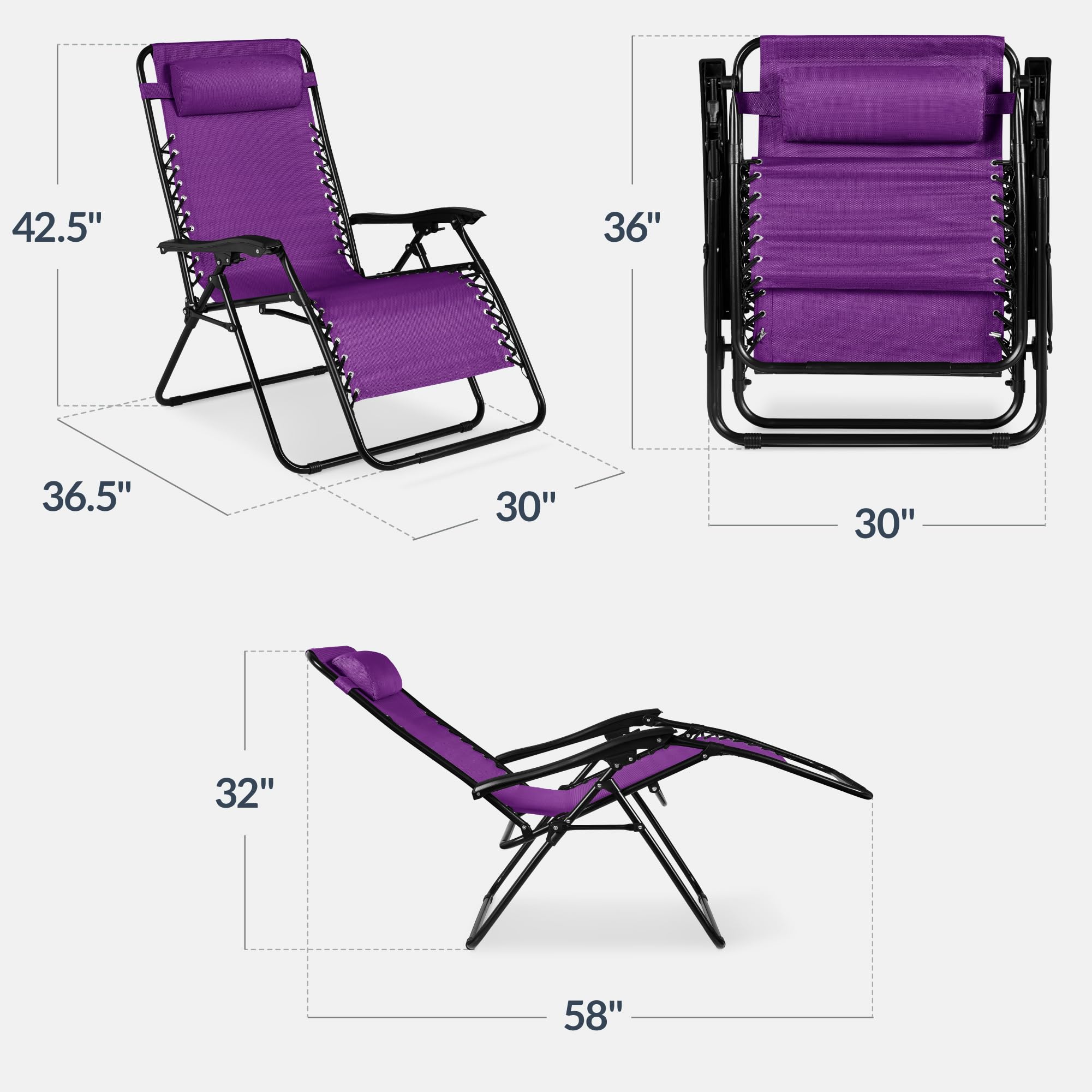 PERFECT FOR PAIRS: Two matching zero-gravity chairs provide comfortable seating for couples, guests, or shared outdoor spaces; OPEN DIMENSIONS: 36.5"-58"(L) x 30"(W) x 32"-42.5"(H); FOLDED DIMENSIONS: 36"(L) x 30"(W) x 4.8"(H); WEIGHT CAPACITY: 440 lbs