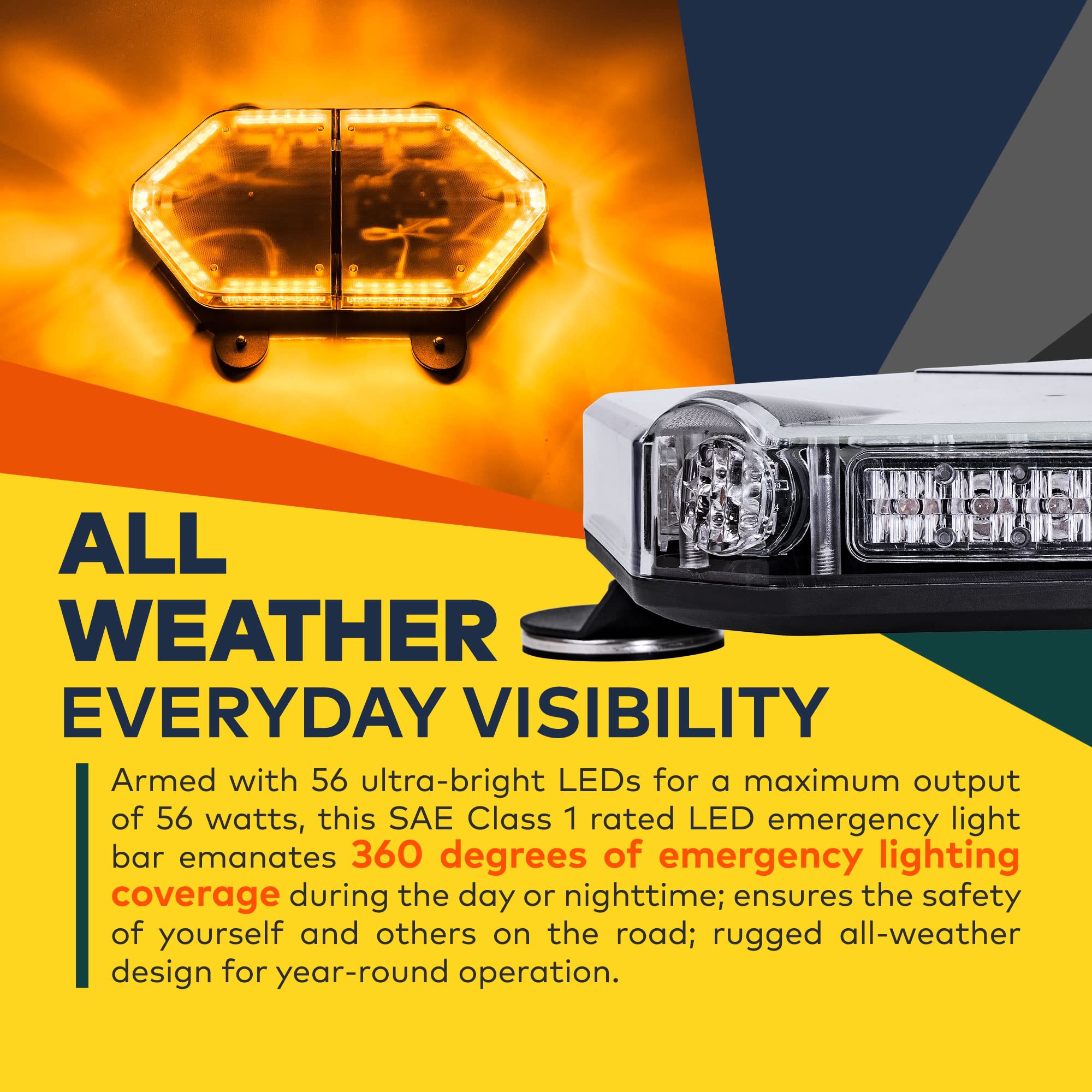 ALL-WEATHER EVERYDAY VISIBILITY - Armed with 56 ultra-bright LEDs for a maximum output of 56 watts, this SAE Class 1 rated LED emergency light bar emanates 360 degrees of emergency lighting coverage during the day or nighttime; ensures the safety of yourself and others on the road; rugged all-weather design for year-round operation.