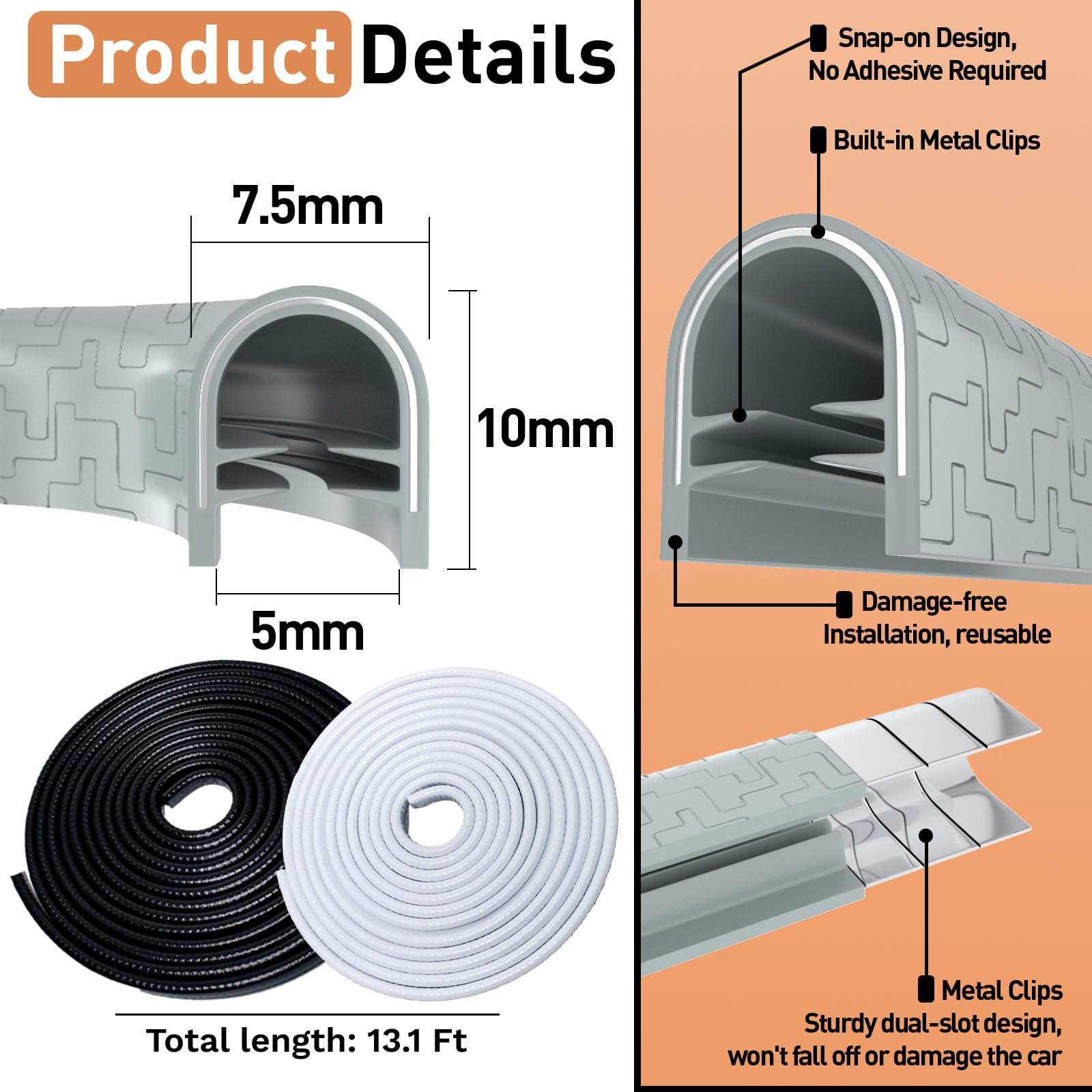 Built-in Metal Clip Fastening: Metal clips are built into the soft rubber and U-shaped aluminum parts provide rigidity. Door edge protector do not come off easily, even in direct sunlight, storms or multiple car washes