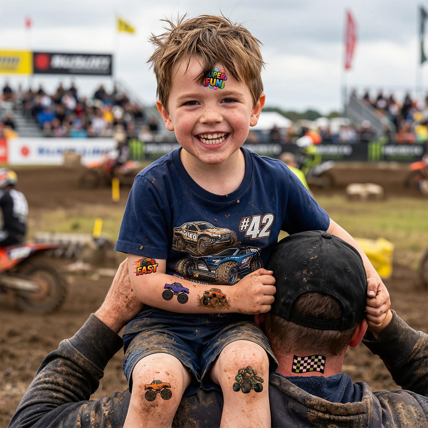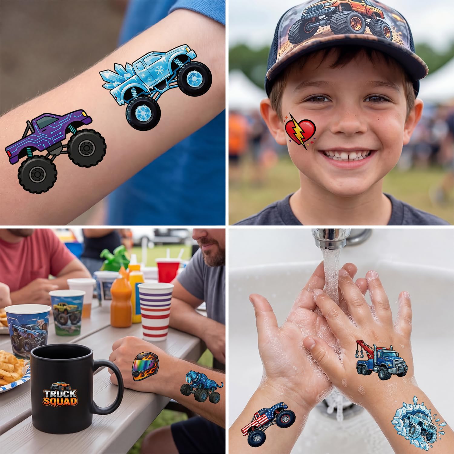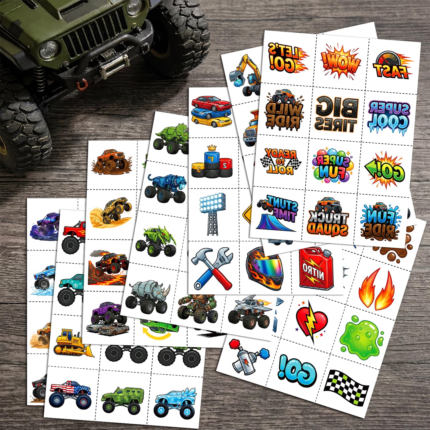 LARGER 1.6"x1.6" SIZE FOR CLEARER PRINTS: Each square measures a generous 4x4cm (1.6"x1.6"), making it the perfect size for little arms and cheeks. This larger tattoos ensures every detail of the cool racing vehicles is crisp, vibrant, and highly visible. Specially tailored for monster trucks for boys age 4-7