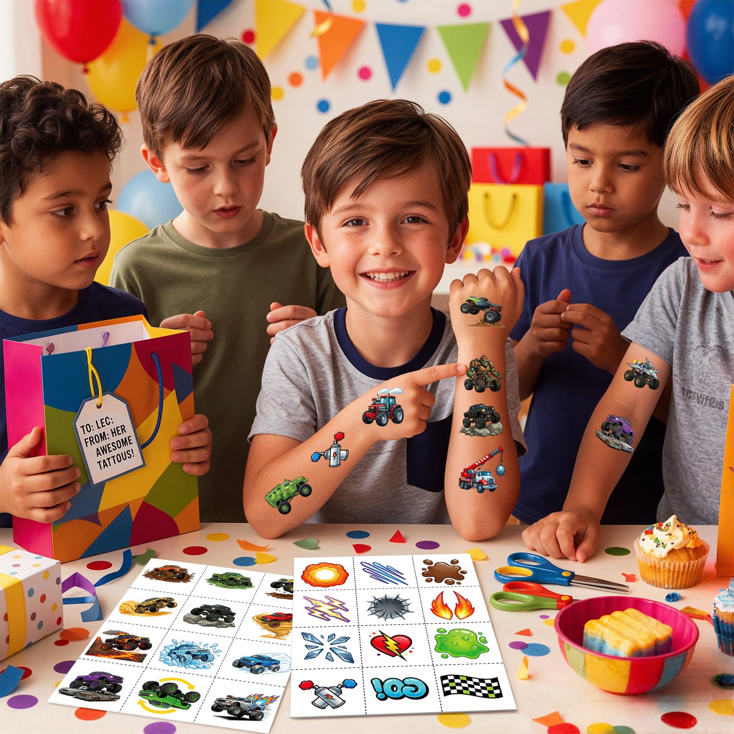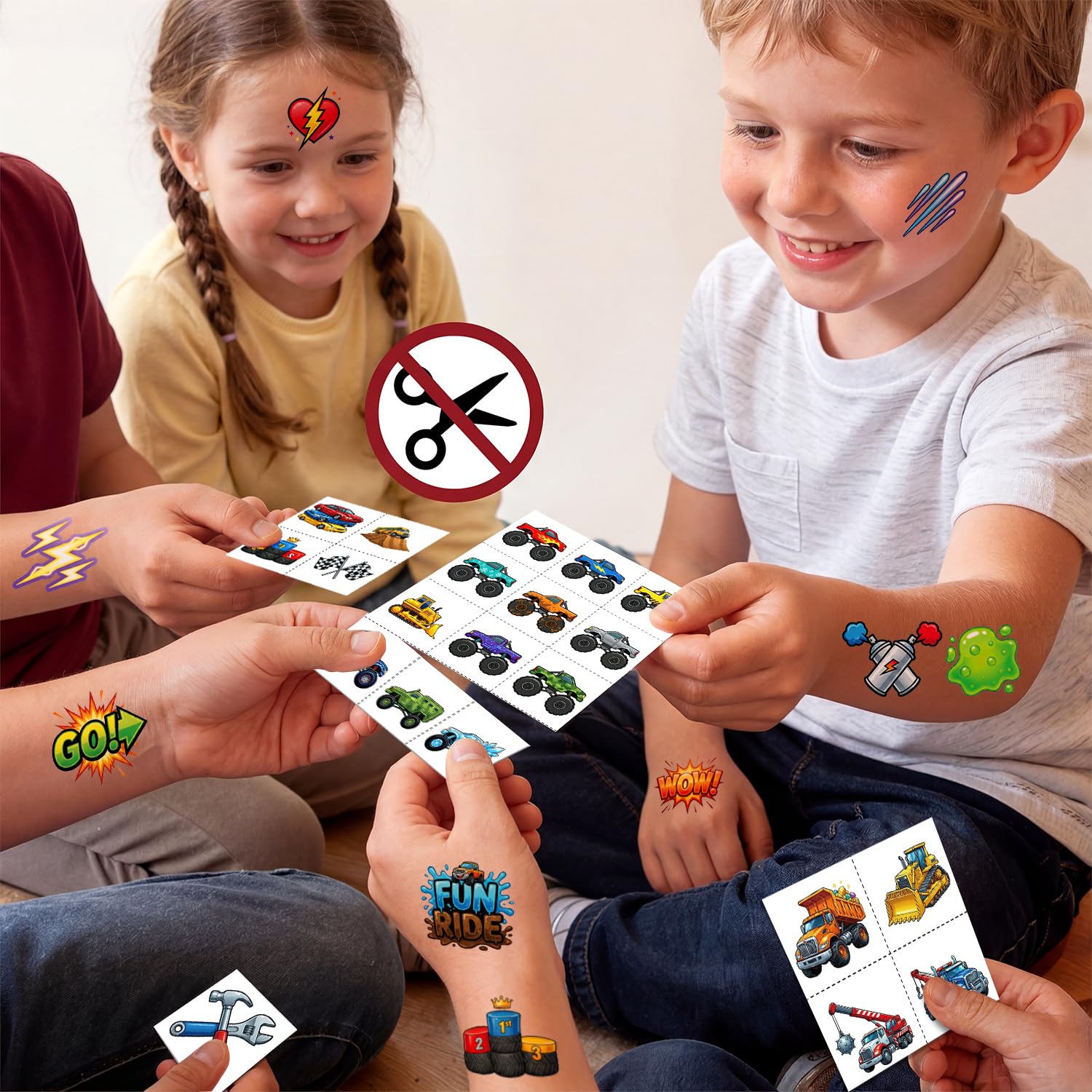 NO SCISSORS NEEDED - CHILD-SAFE TEAR: Safety and convenience first! Our monster truck temporary tattoos feature an innovative pre-cut perforated design. Each square can be easily and neatly torn off by hand, so you never have to hunt for scissors. It's great for party favors for busy parents and excited children during any event