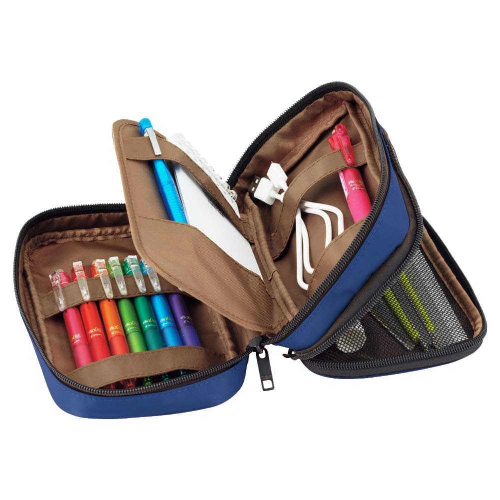 Our double zipper pouch has two sides with mesh pockets for small accessories including 4 sides with straps and can hold up to 25 pens This high quality pen case opens like a book allowing it to lay flat on surfaces when completely unzipped Sturdy black durable zippers provide a secure seal when the case is stored Inside the case you will find a multi-layered storage system with a variety of straps and pouches to store your writing utensils and office stationery Our mesh pockets provide a unique storage component for erasers lead Pencil sharpeners or other small stationary items that easily get lost in large backpacks and bags Our Original pen cases were very popular among artists and pen lovers due to their ability to store large amounts of pens and accessories To satisfy customer demand our new pen case design contains even more space allowing you to hold and organize a larger number of pens pencils markers & any additional items A key Item for office and school organization!