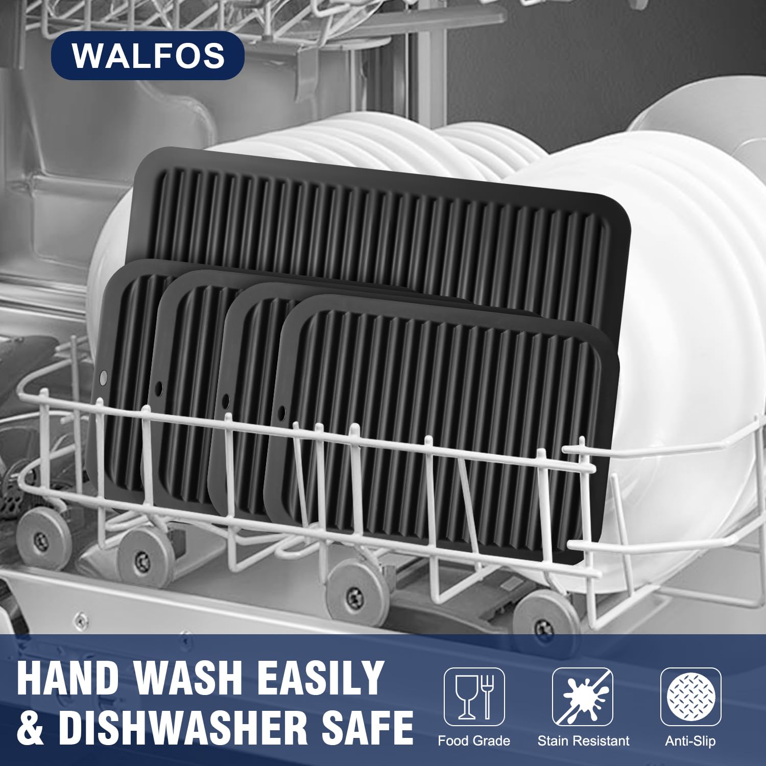 Walfos Silicone Trivet Mat have many advantage. √Food Grade silicone,. √Heat resistant up to 446°F. √Will never melt, discolored, or shrink. √Easy to clean and dishwasher safe. √Dry fast with no residue