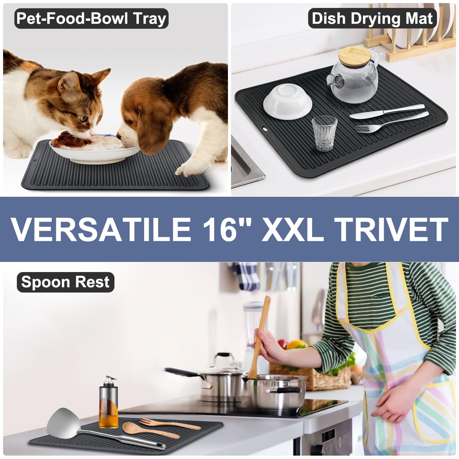 MULTI-FUNCTIONAL: As the trivets for hot dishes are non-slip, flexible and soft, not only suitable for large cookware such as air fryers, coffee makers, but also can be used as pot holder, dish drying mats, spoon rest, pet bowl tray, pot mat and more. Folded up silicone pot holders are also perfect for use in the oven, microwave or refrigerator to protect your hands from hot and cold