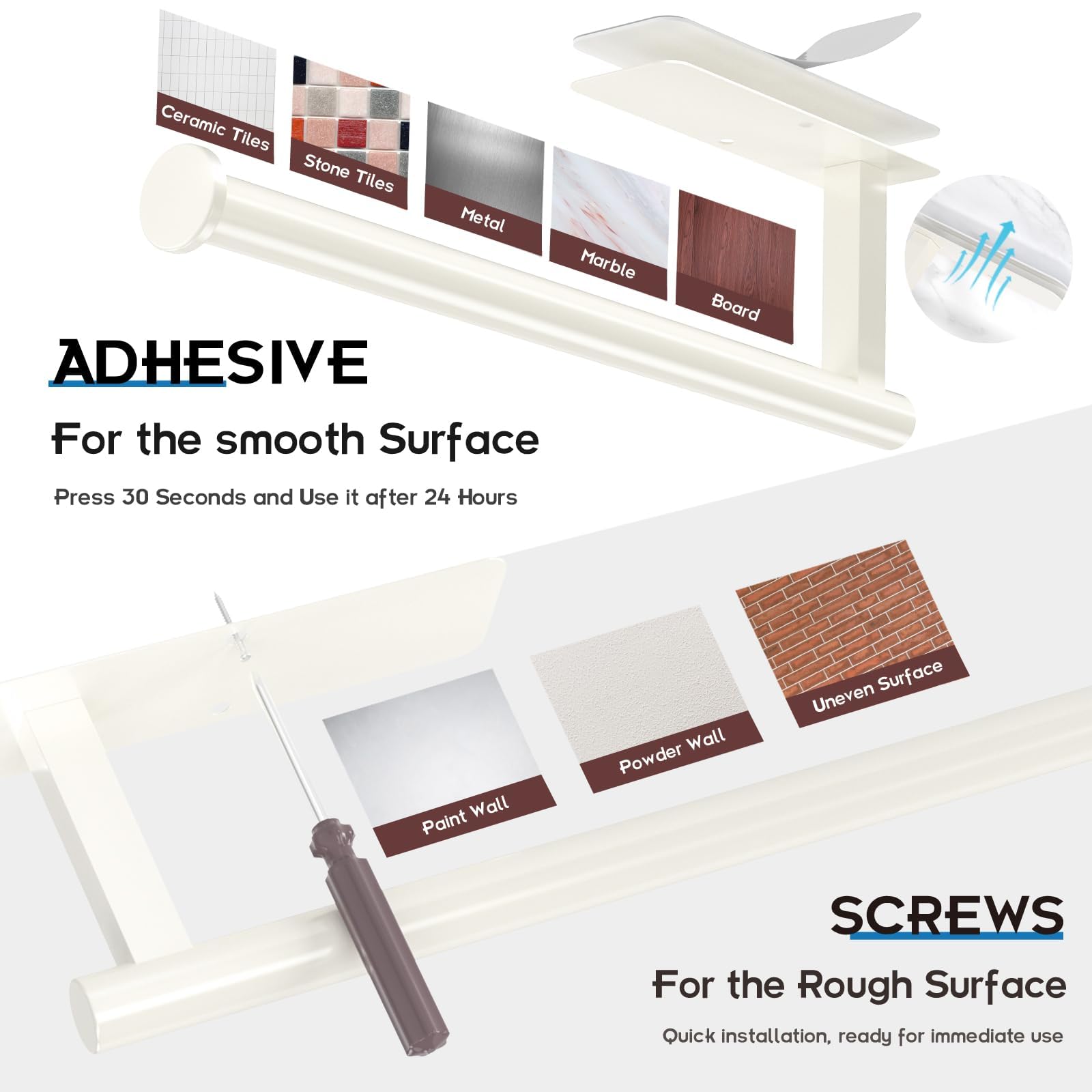 【TWO INSTALLATION OPTIONS】: Applicable for both adhesive and screws. Adhesive design suits smooth surfaces. Stick on anywhere you want with strong adhesive, press it for about 20 seconds then wait for 24 hours. On rough surfaces, paper towel holder wall mount can be installed with screws