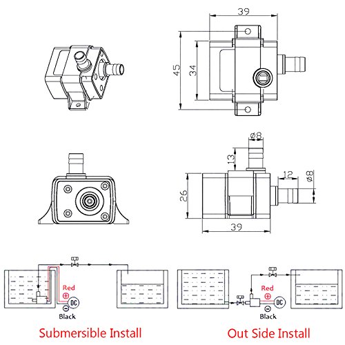 Brushless, permanent magnetic rotor. Super long working life(more than 30000 hours). Adopt high performance ceramic shaft. The axis is enclosed with static sealing, not dynamic, which can avoid leaking problems. Amphibious design. Submersible installation and entirely waterproof. low consumption. low noise(less than35db). Pump material: ABS. Condition of use: continuously. Fluids: Water, oil, gasoline, acid and alkali solution. Working temperature: 0 ~ 75℃. Power consumption: 4.2W. Rated voltage: 12V DC. Max rated current: 350mA. Max flow rate: 4L/MIN(1.06G/MIN). Max Head(lift height): 3M. Noise: <40dB(most 35dB). Water proof class: IP68(can be submersible installed). Life span: More than 30000hrs. Power supply: Solar panel, DC electric source, battery. Size: 5.5cm x 3.5cm x 4.5cm. Package Included: 2* Brushless Water Pump 240L/H
