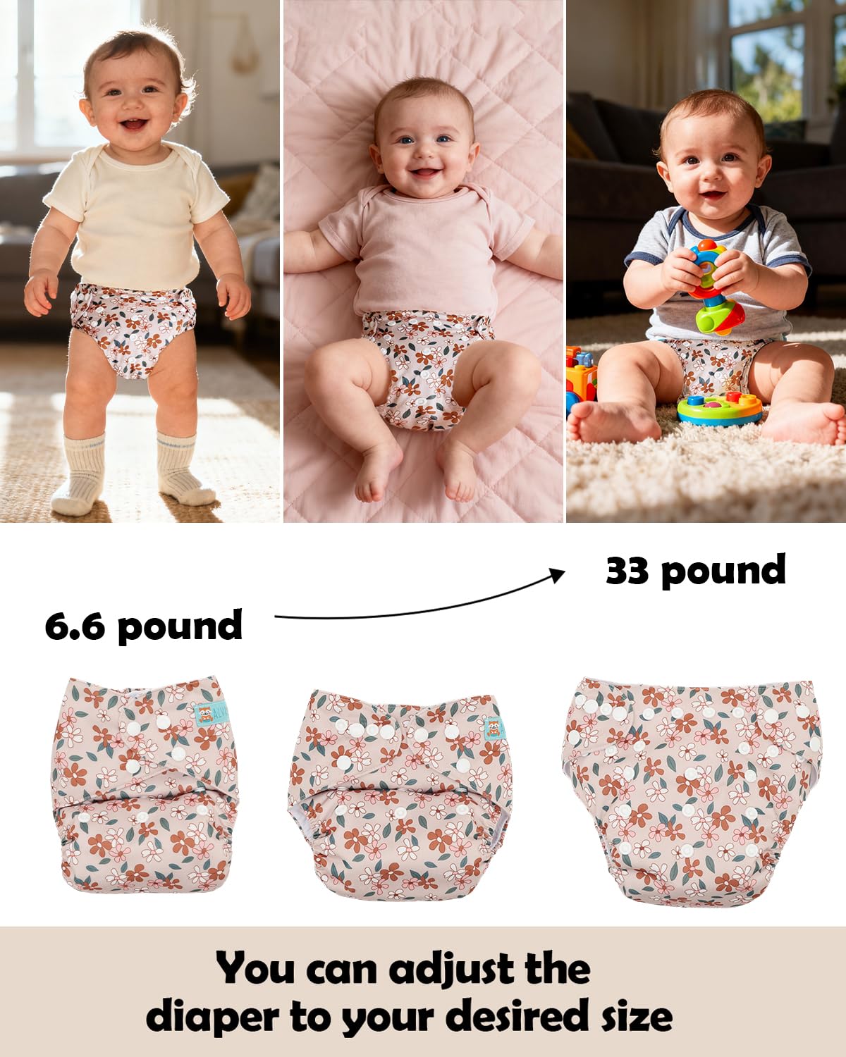 Save Money & One Size : One size fits 3kg-15kg (6.6–33 lbs). Adjustable snap buttons customize fit (S/M/L). Premium reusable quality saves long-term costs.